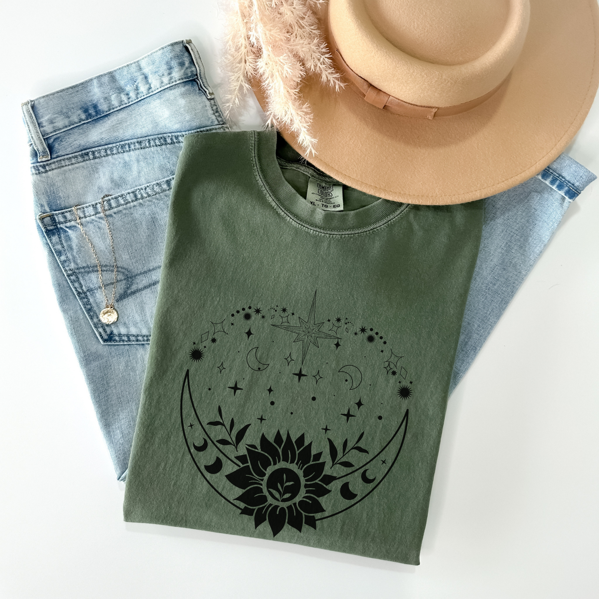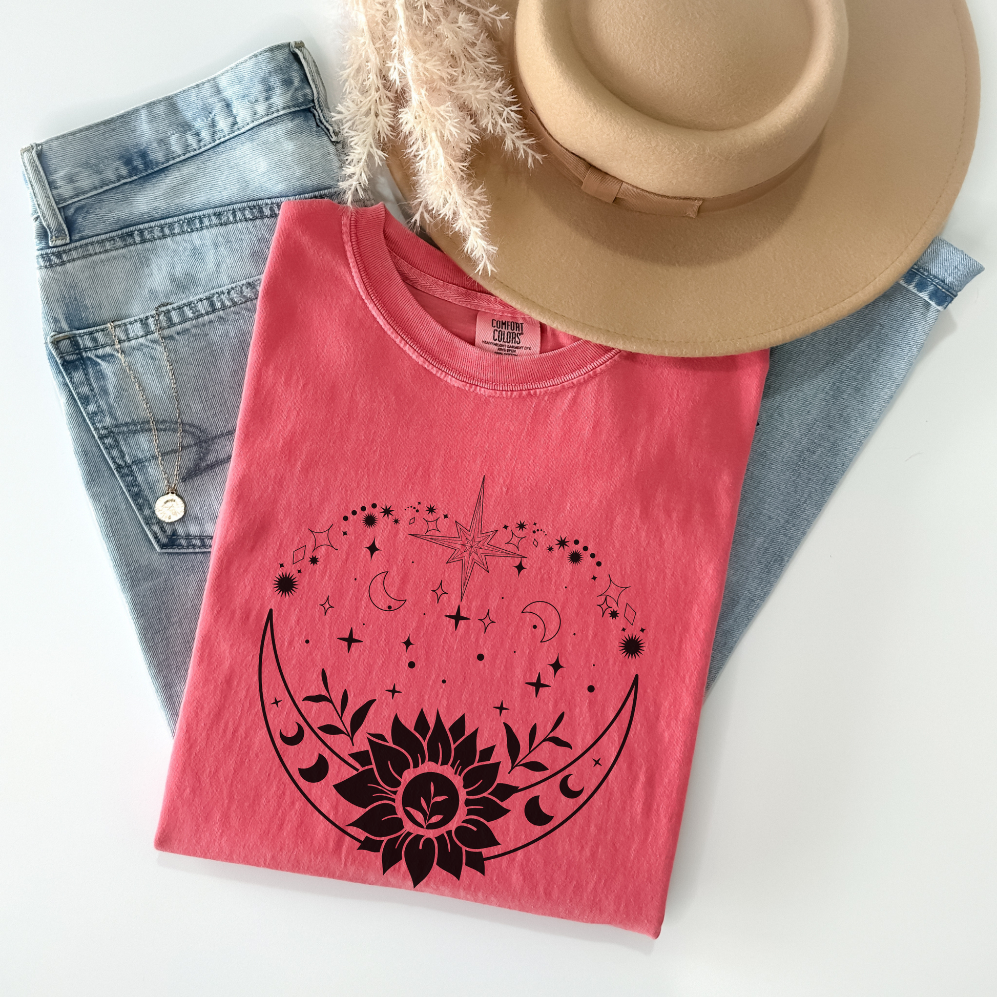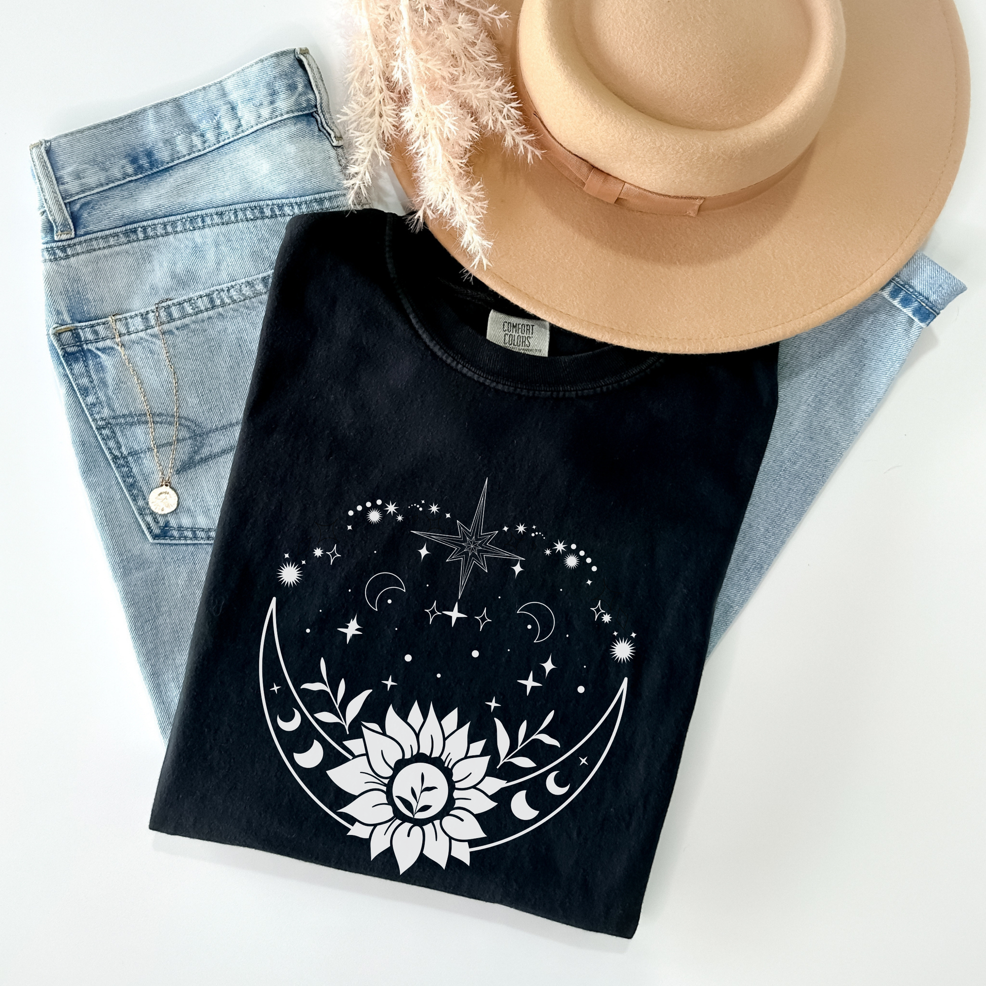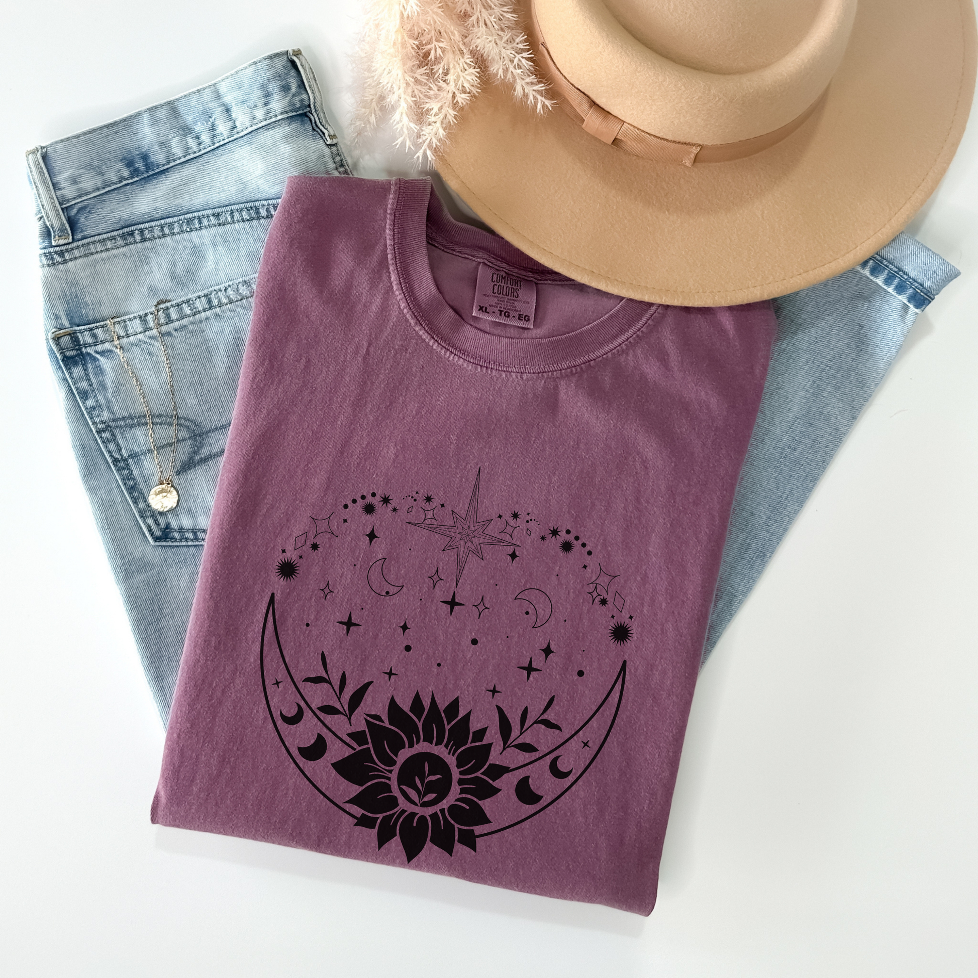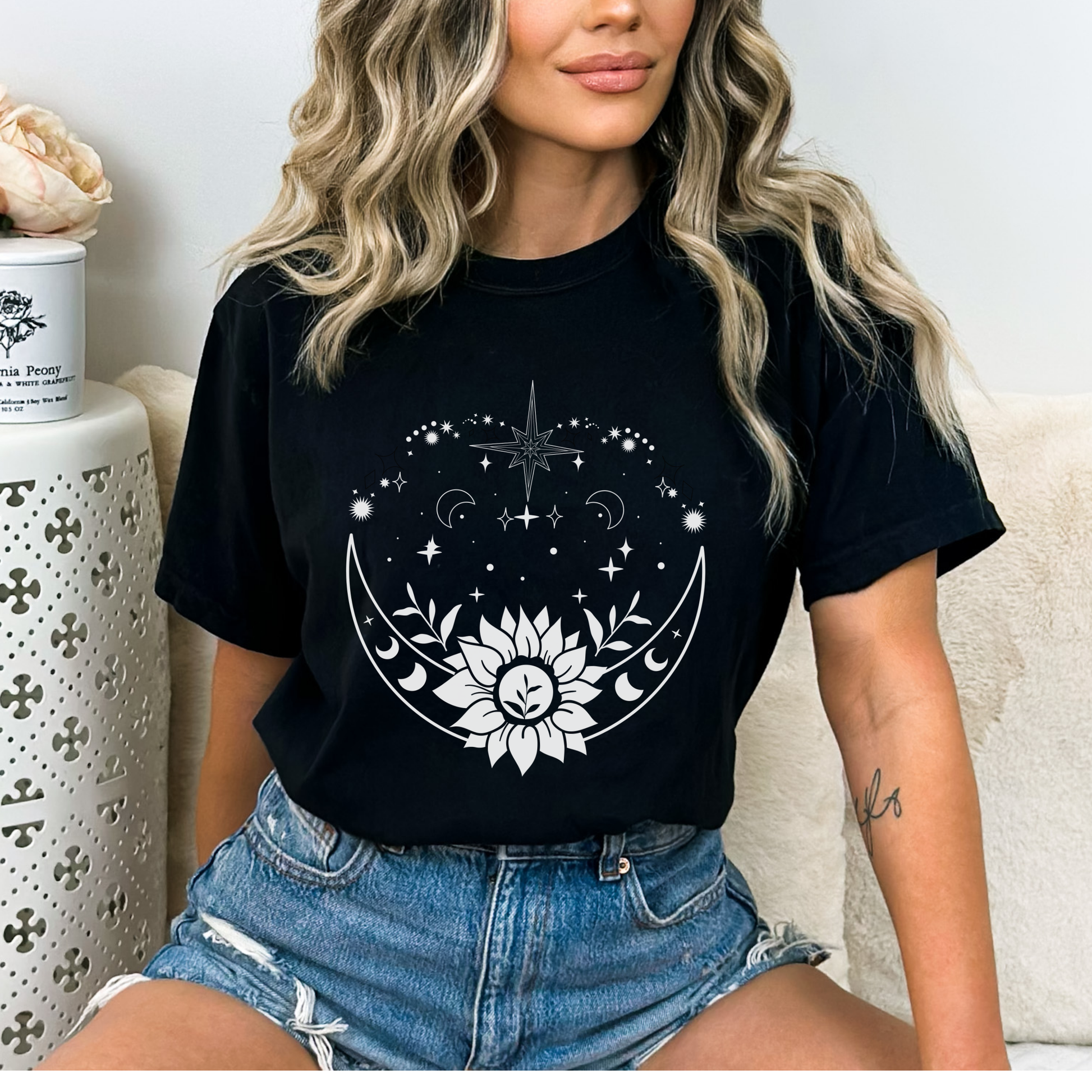 ππͺ· Celestial moon and sunflower t-shirt with a half moon flowers design, perfect for nature lovers and boho style enthusiasts.