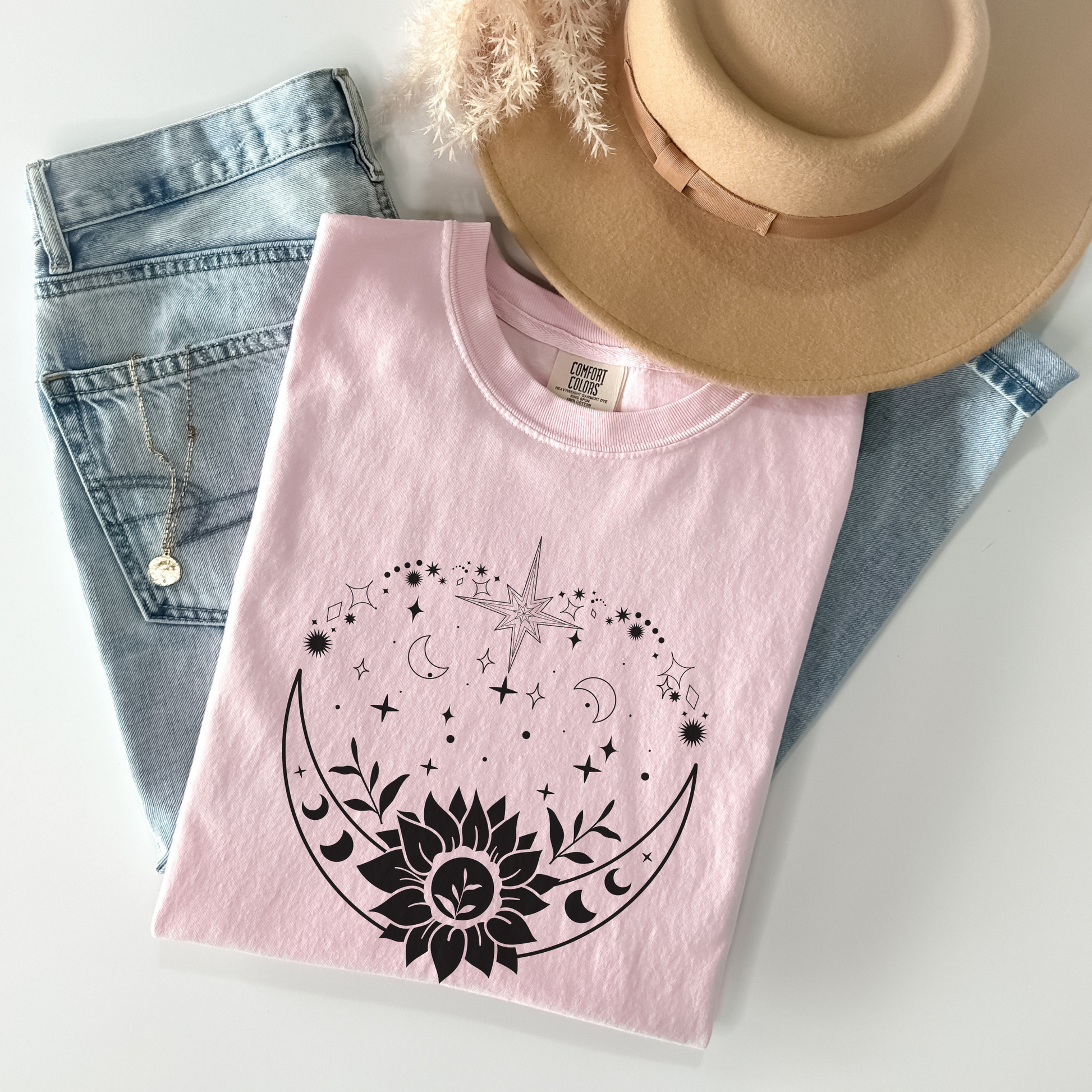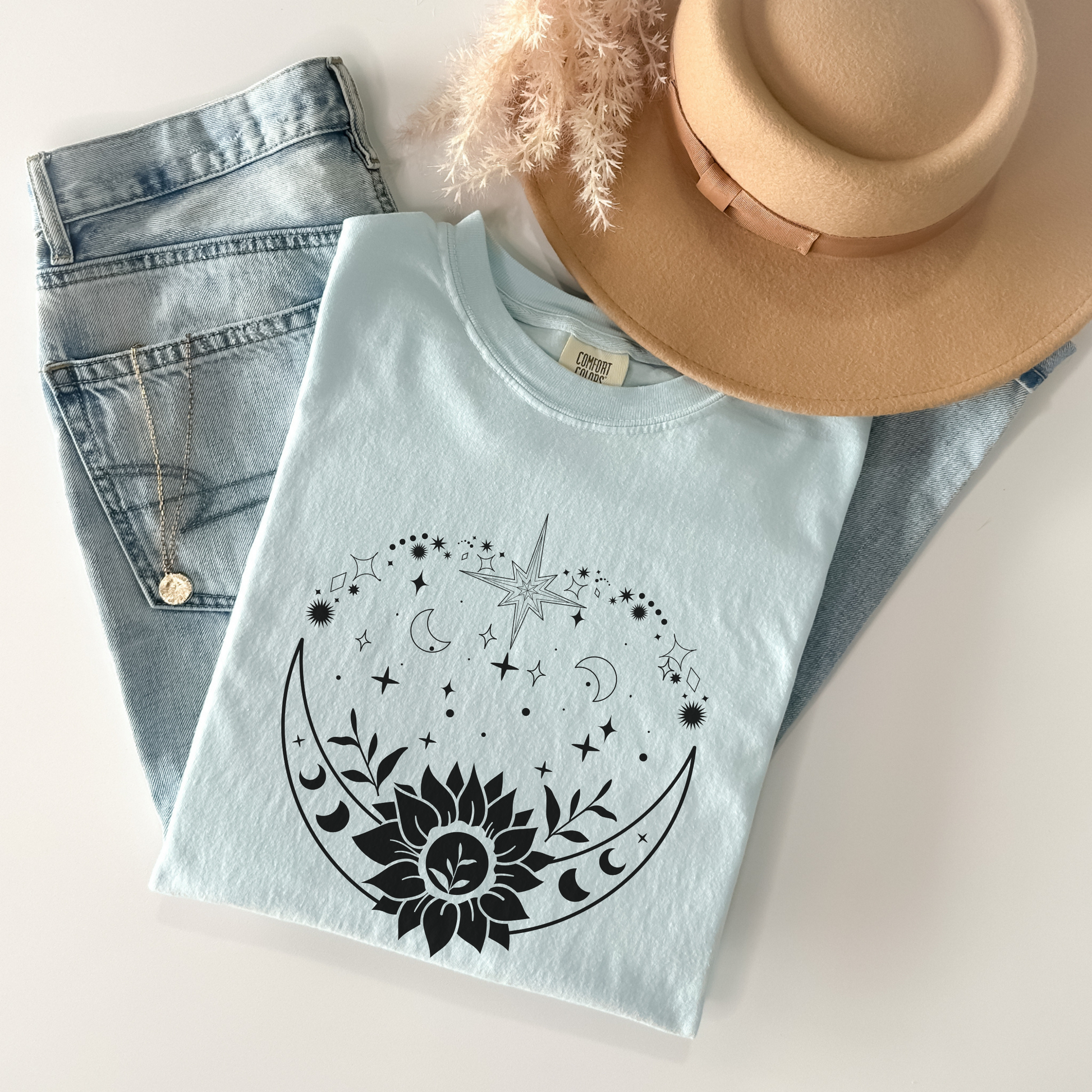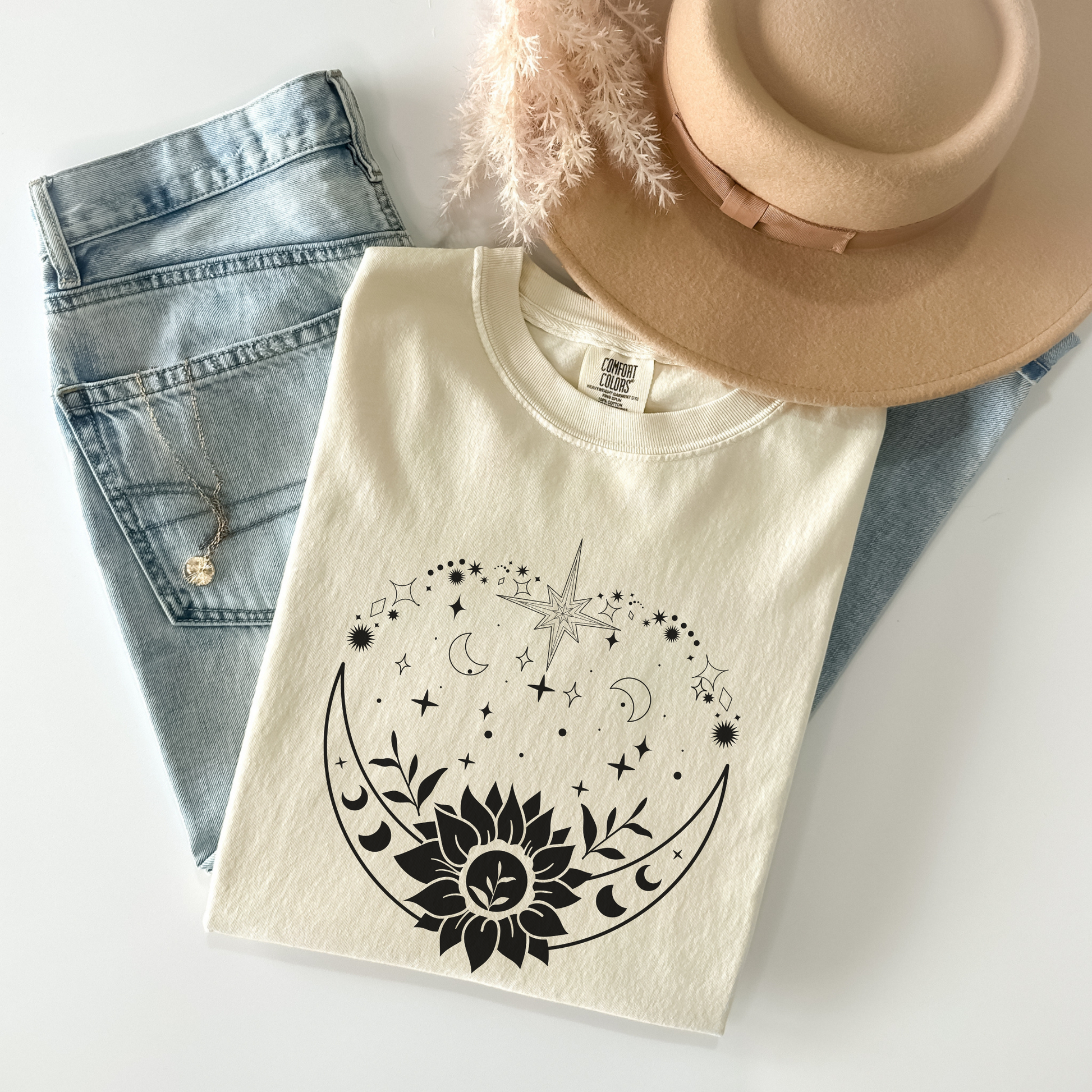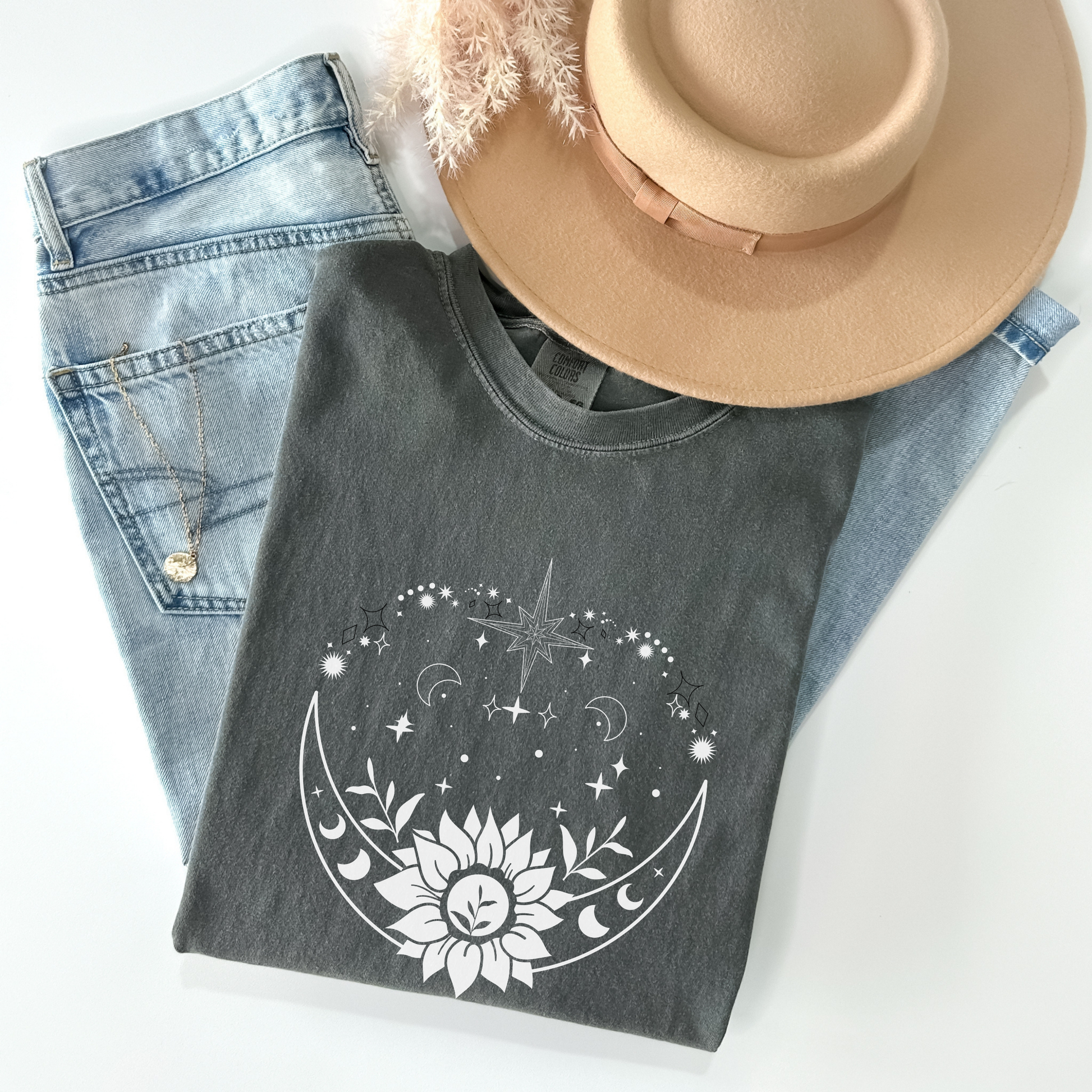 ππͺ· Celestial moon and sunflower t-shirt with a half moon flowers design, perfect for nature lovers and boho style enthusiasts.