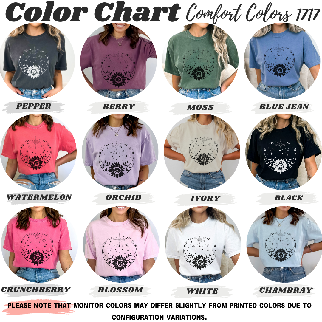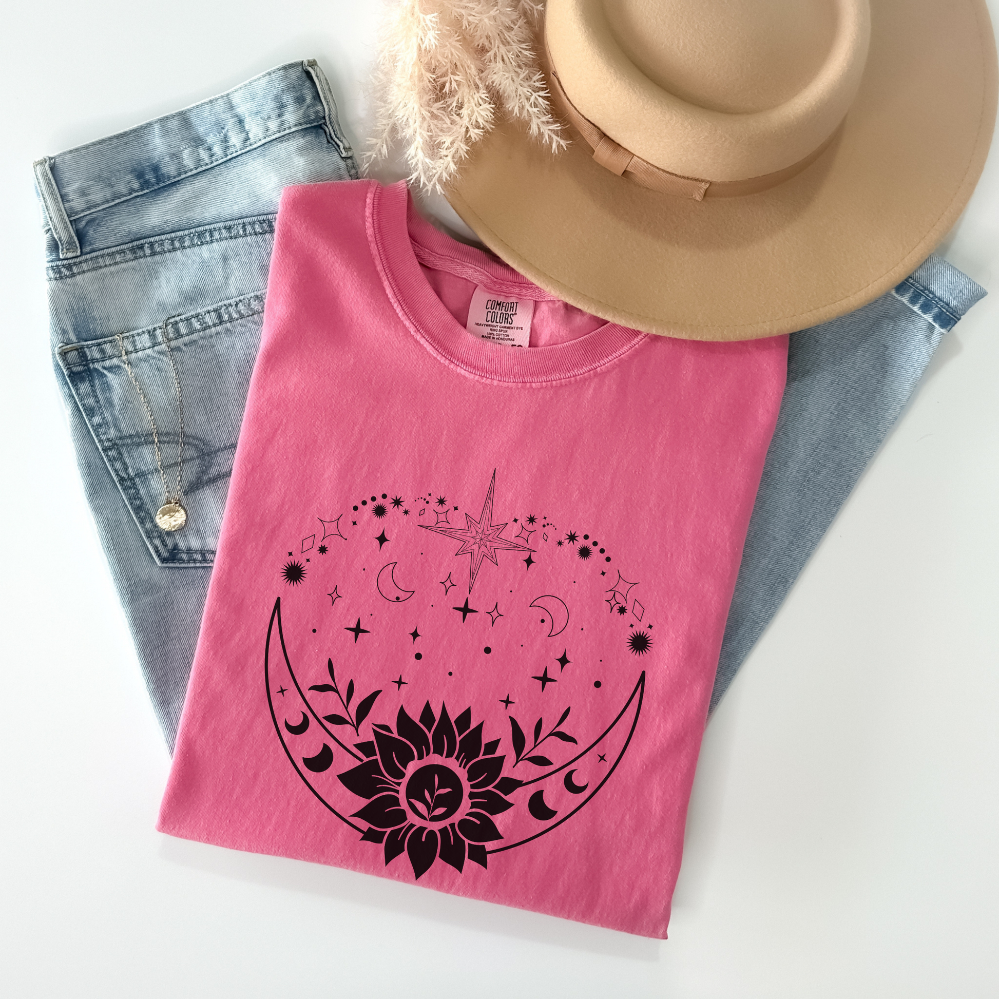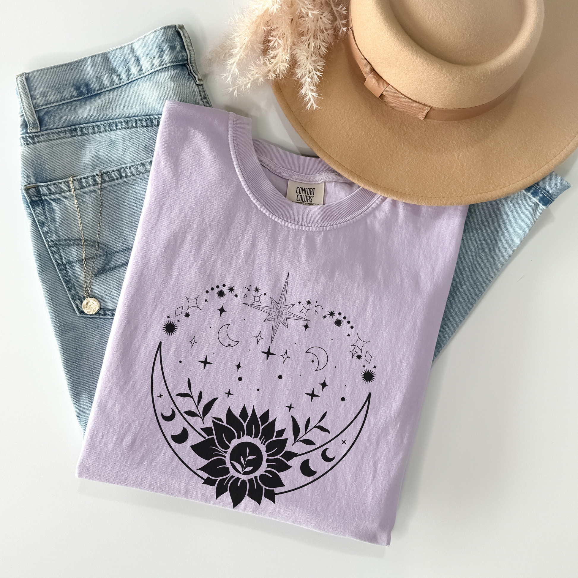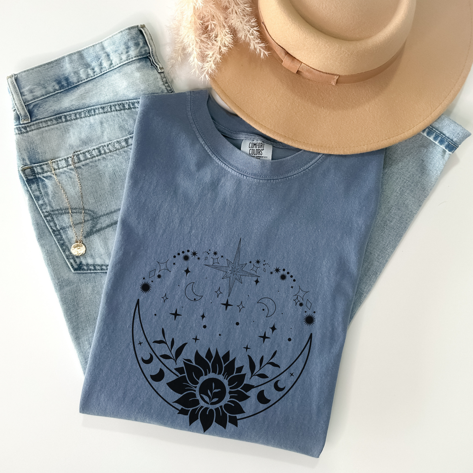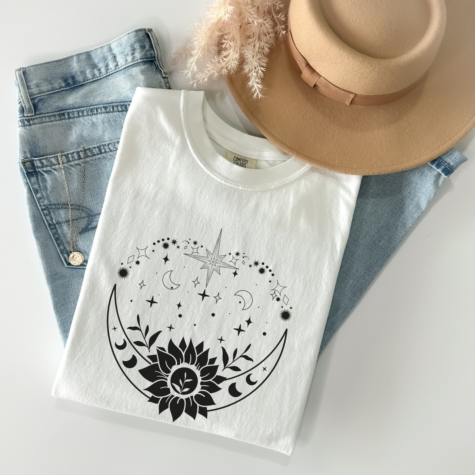 ππͺ· Celestial moon and sunflower t-shirt with a half moon flowers design, perfect for nature lovers and boho style enthusiasts.