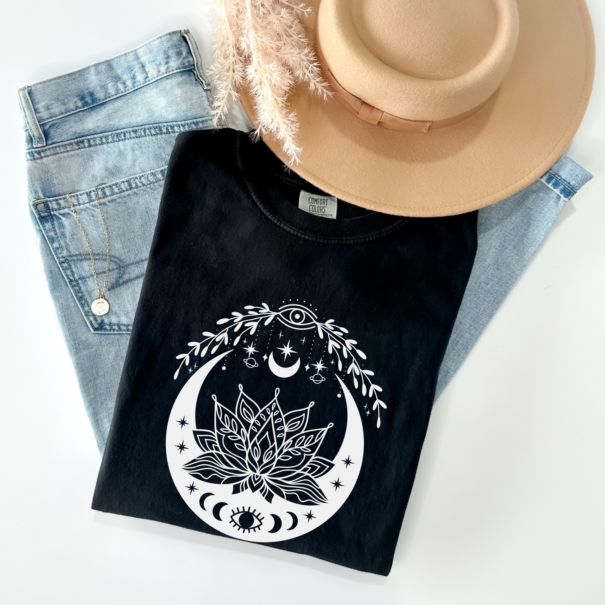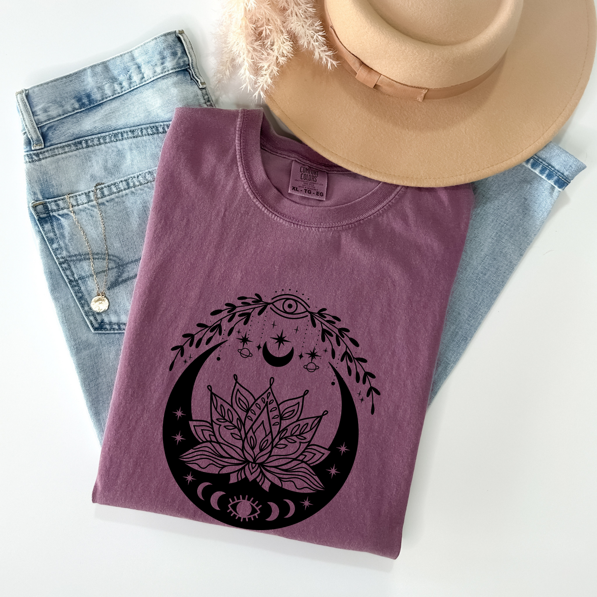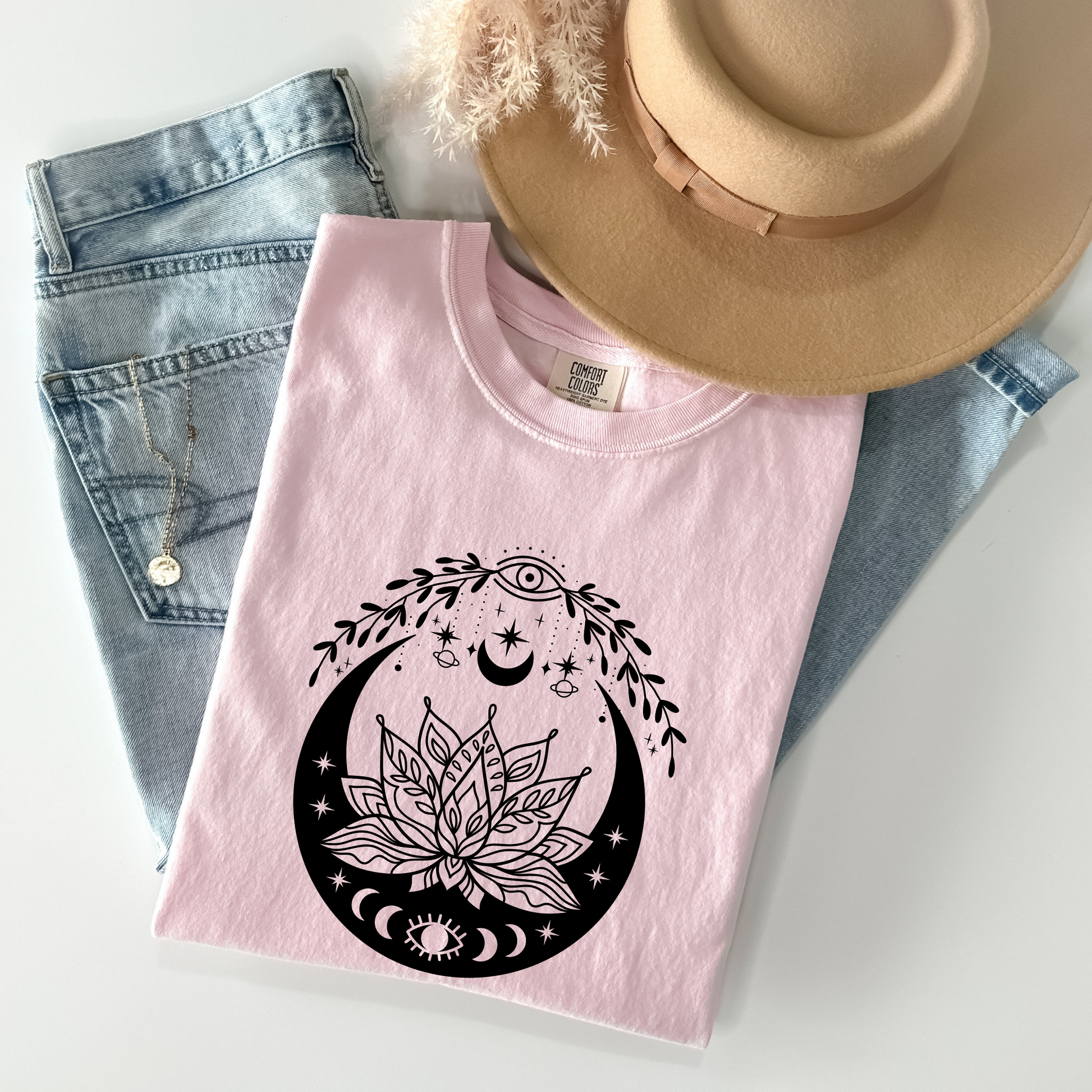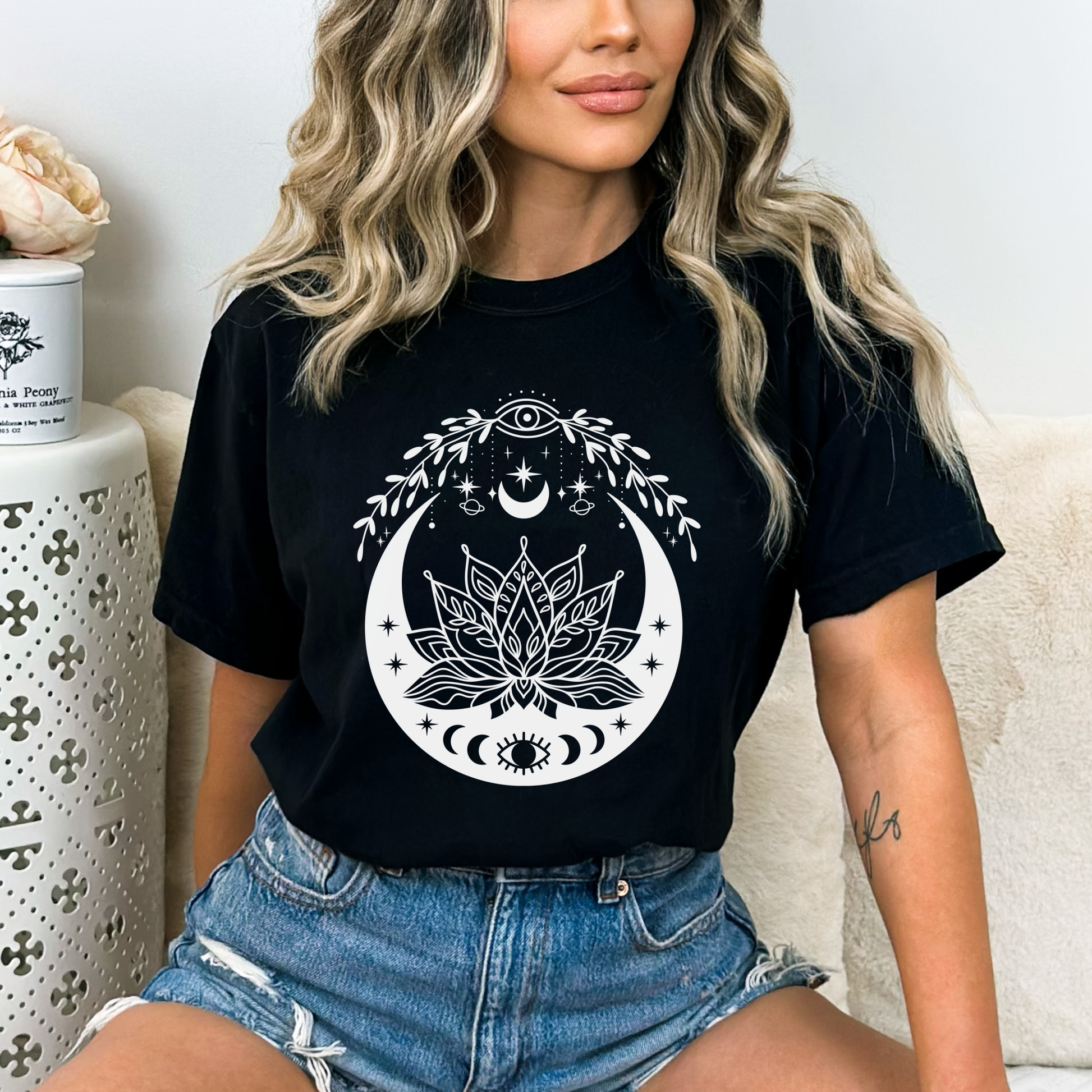 👚🪷 This enchanting tee is perfect for those who adore celestial themes, botanical elements, and mystical aesthetics.