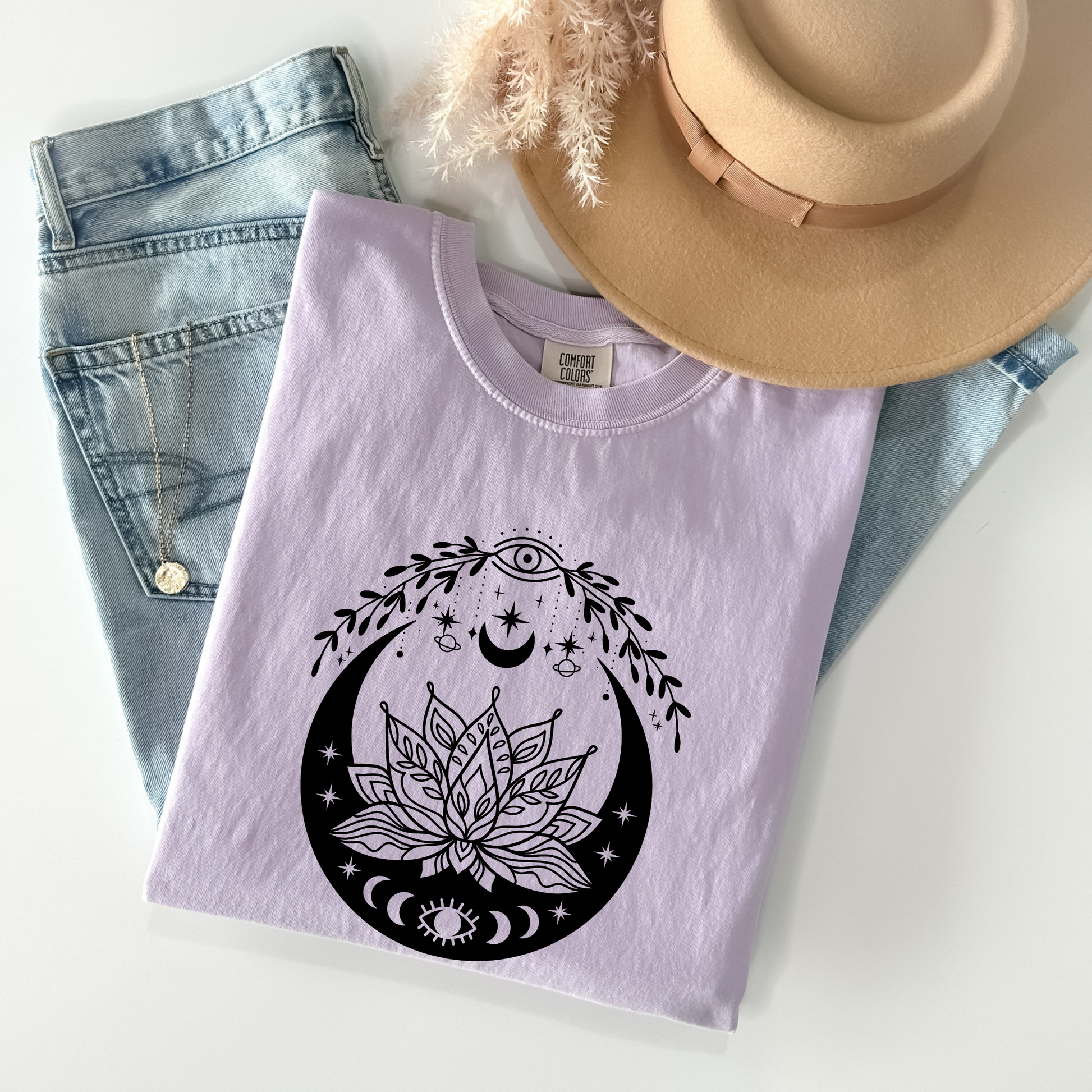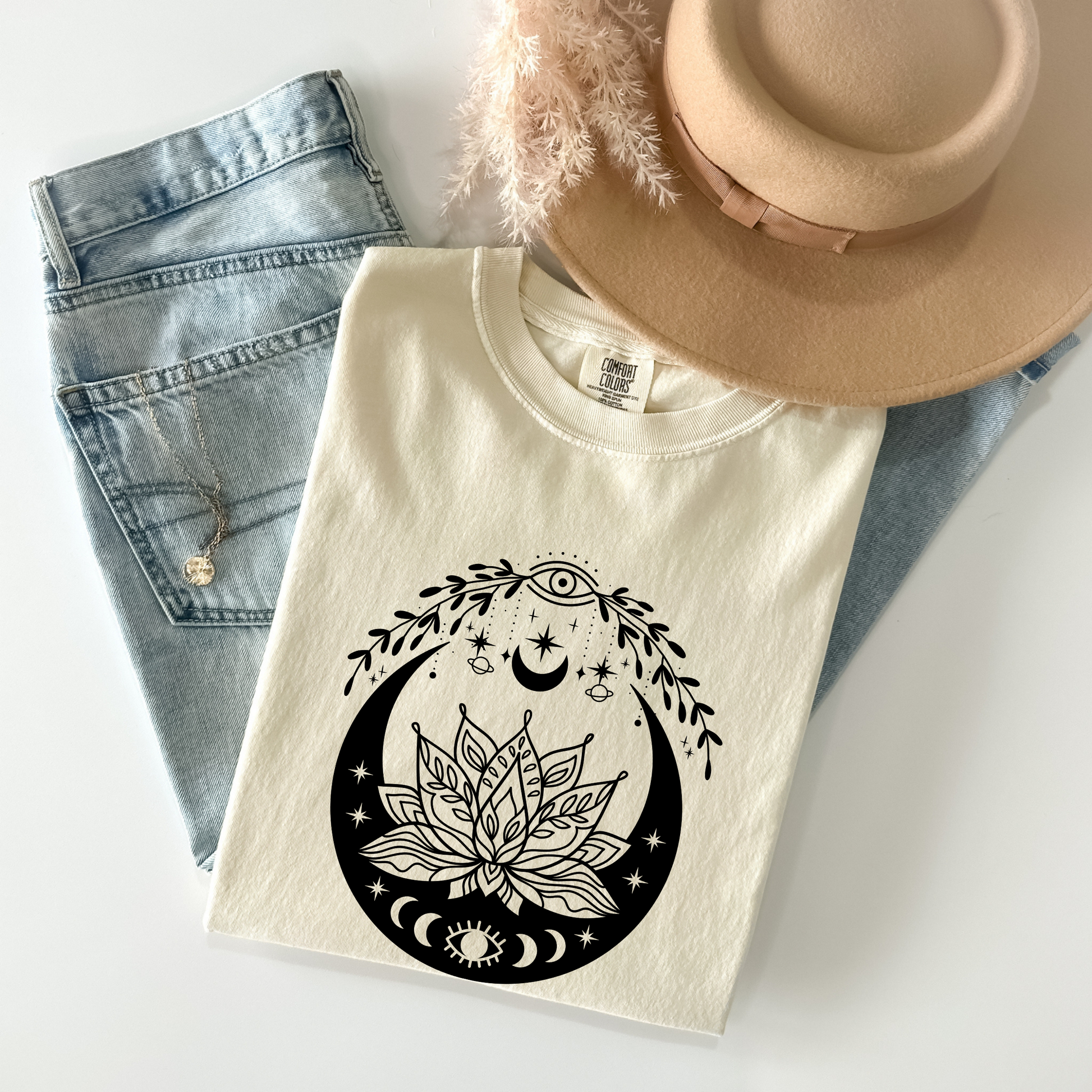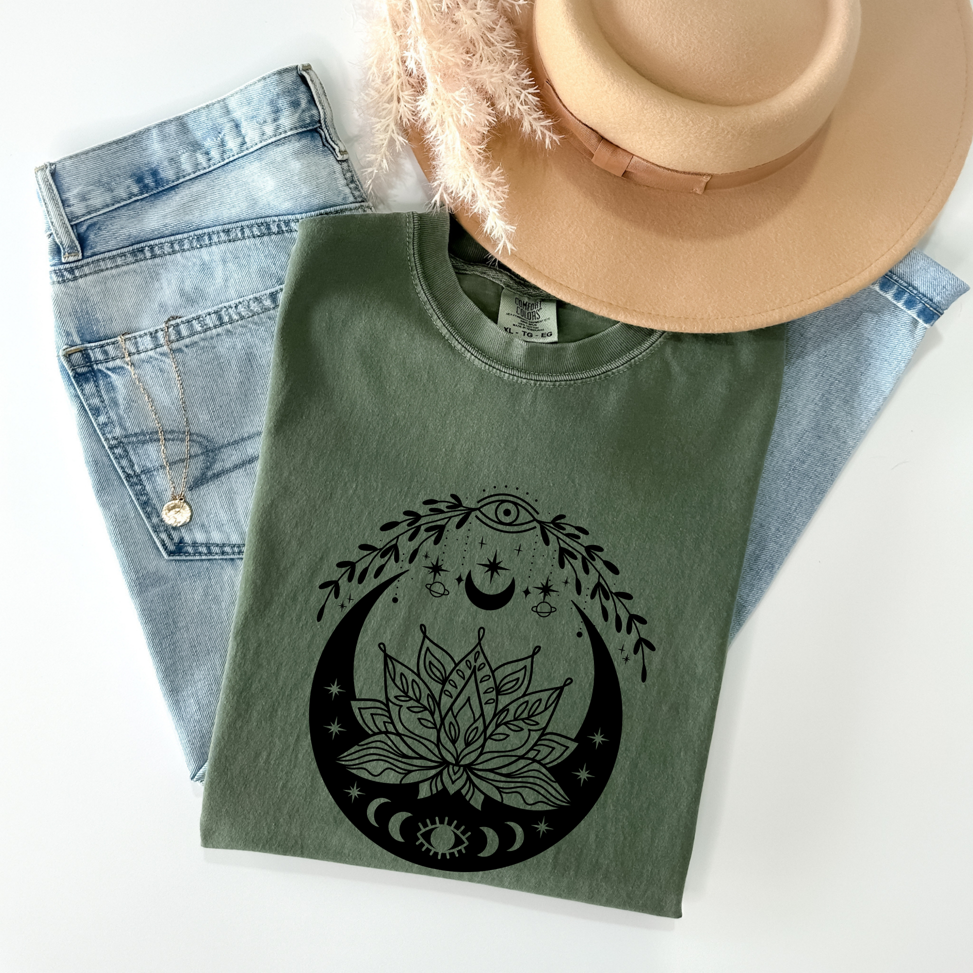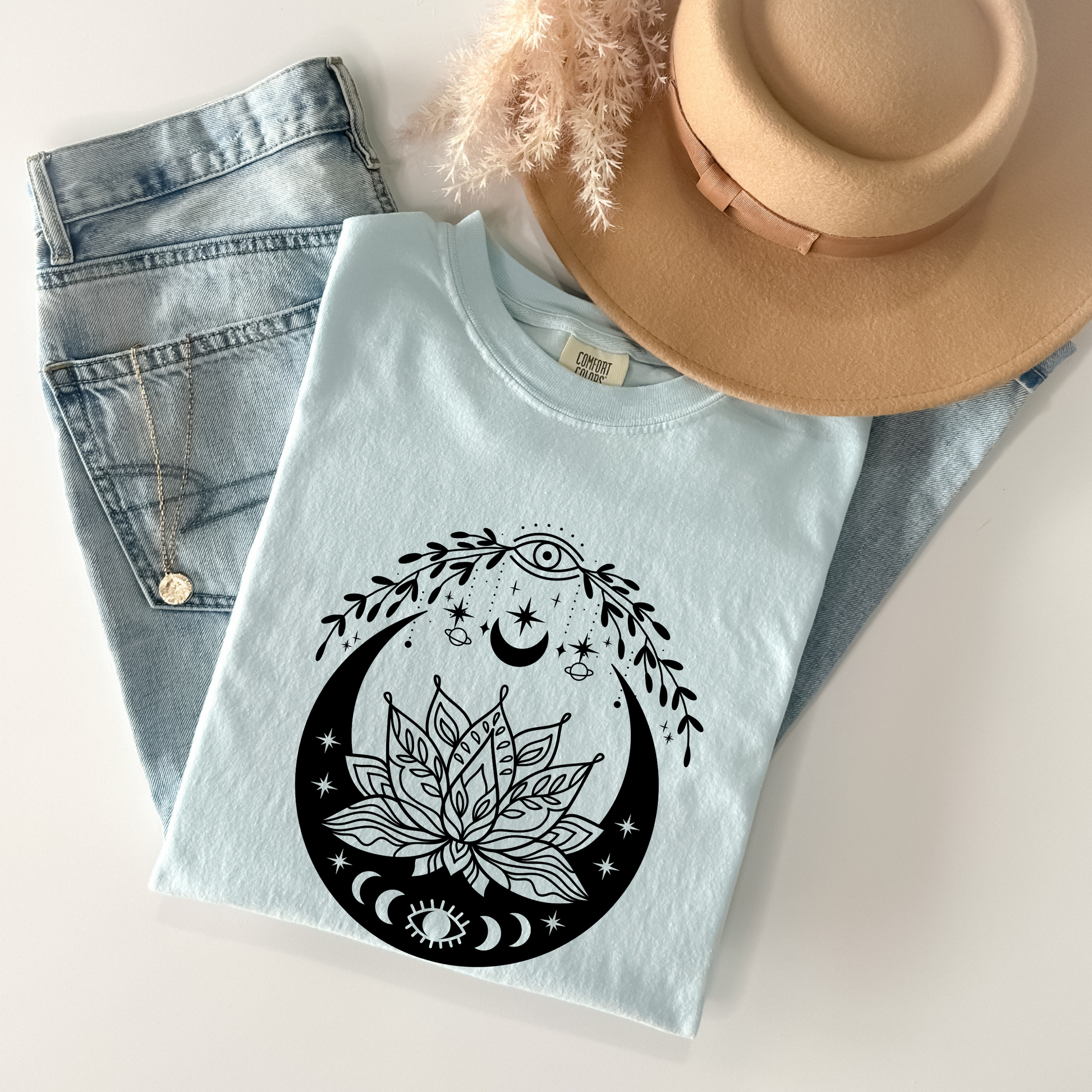 👚🪷 This enchanting tee is perfect for those who adore celestial themes, botanical elements, and mystical aesthetics.