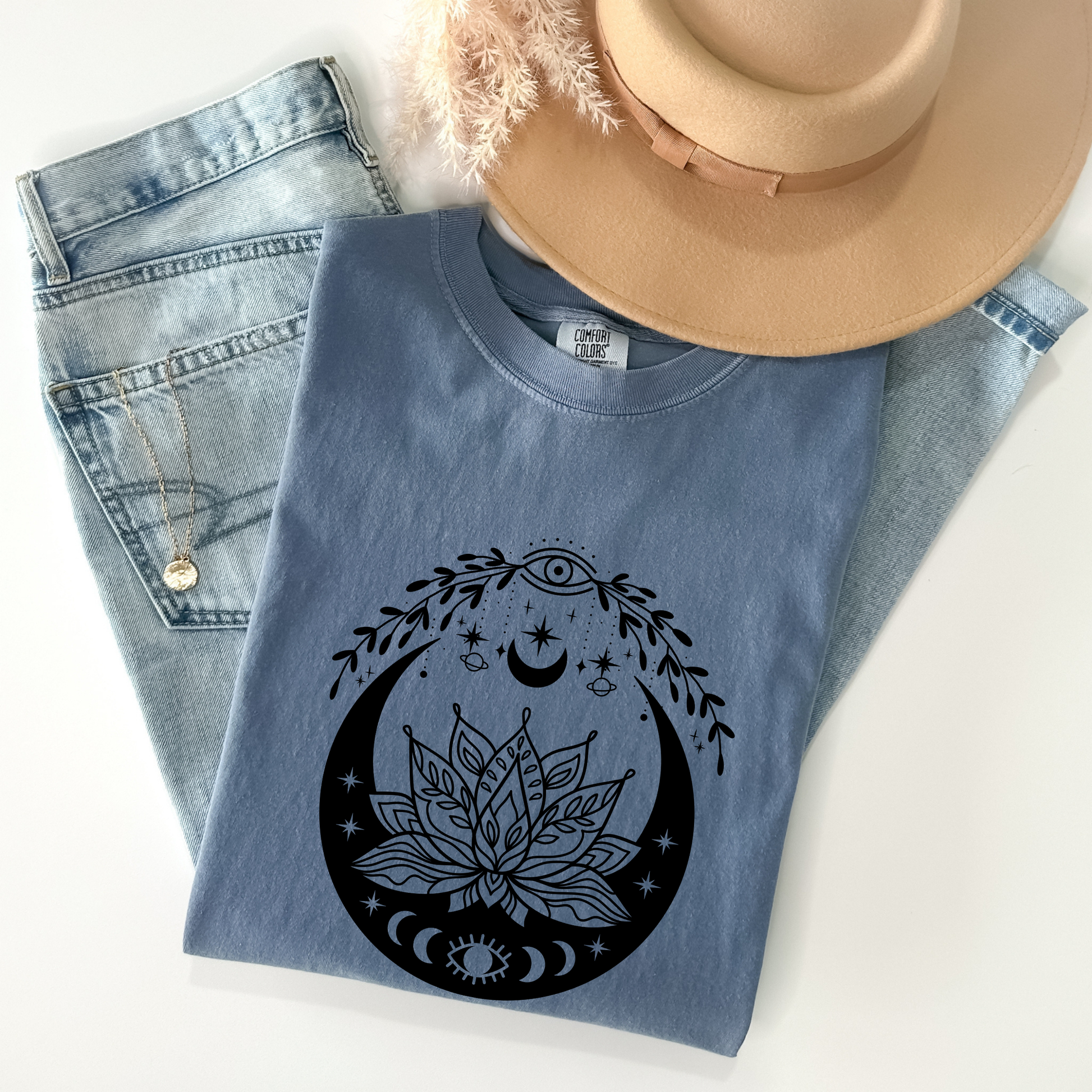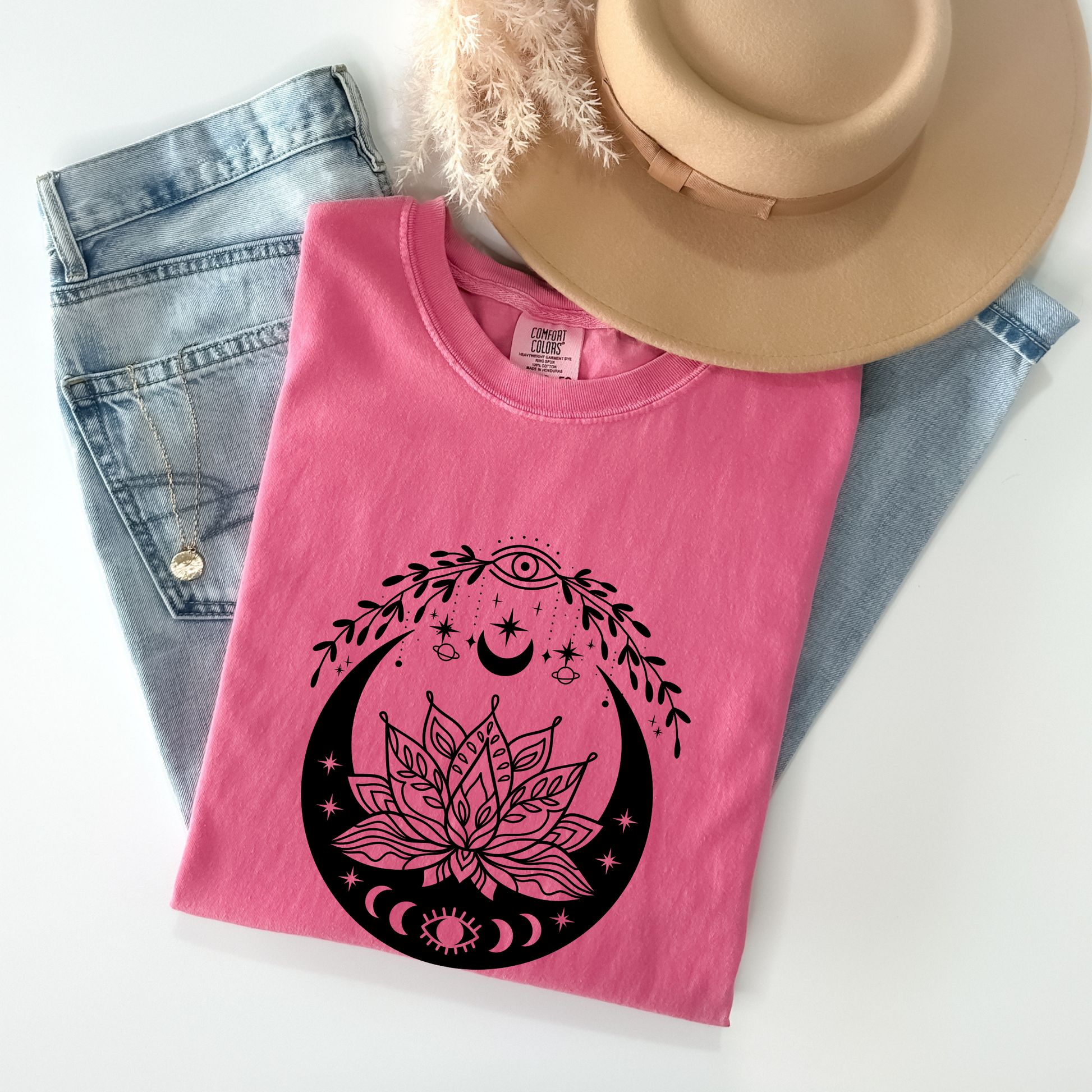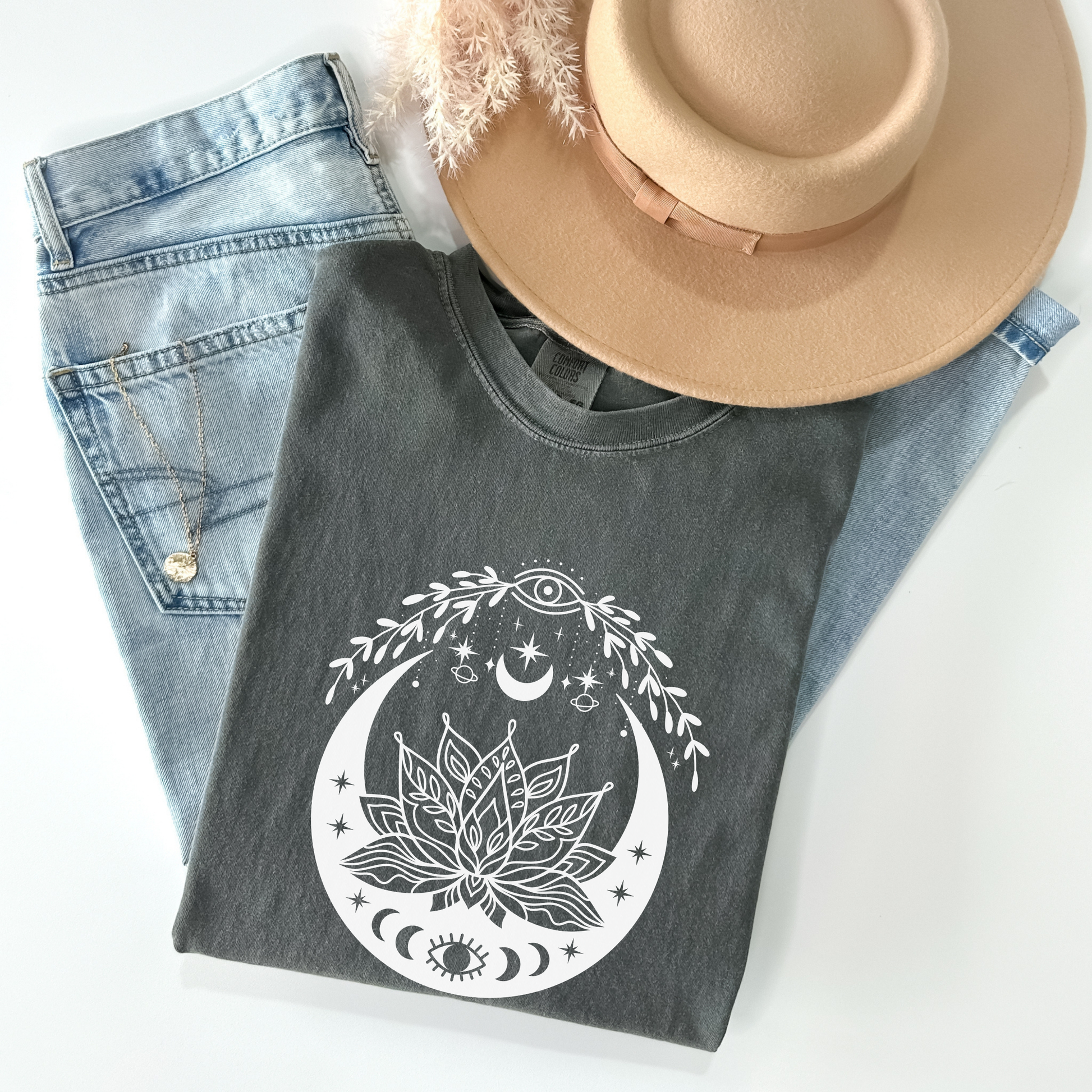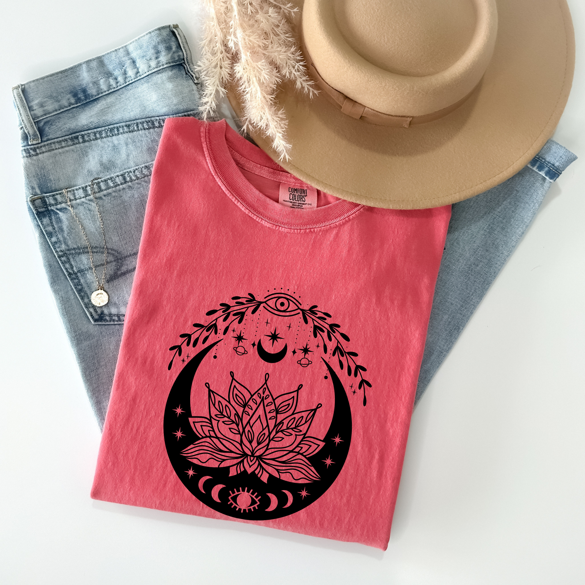 👚🪷 This enchanting tee is perfect for those who adore celestial themes, botanical elements, and mystical aesthetics.