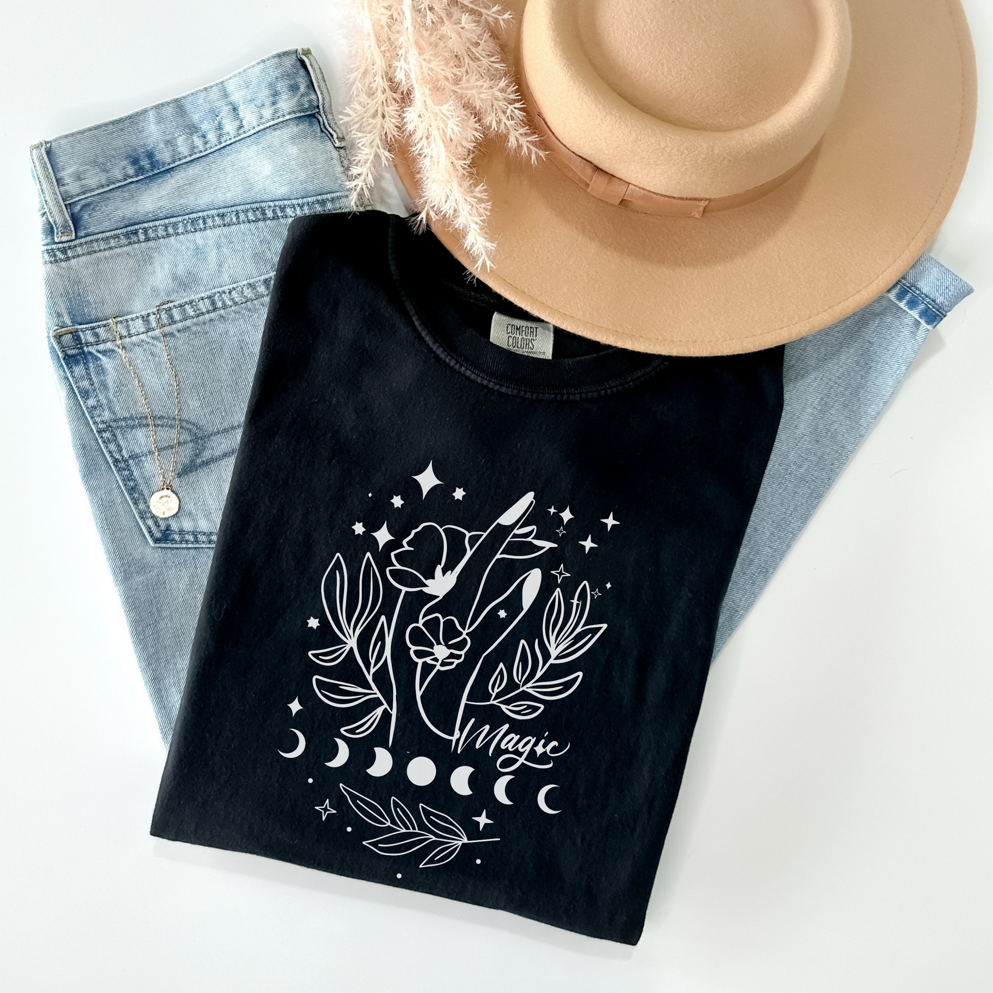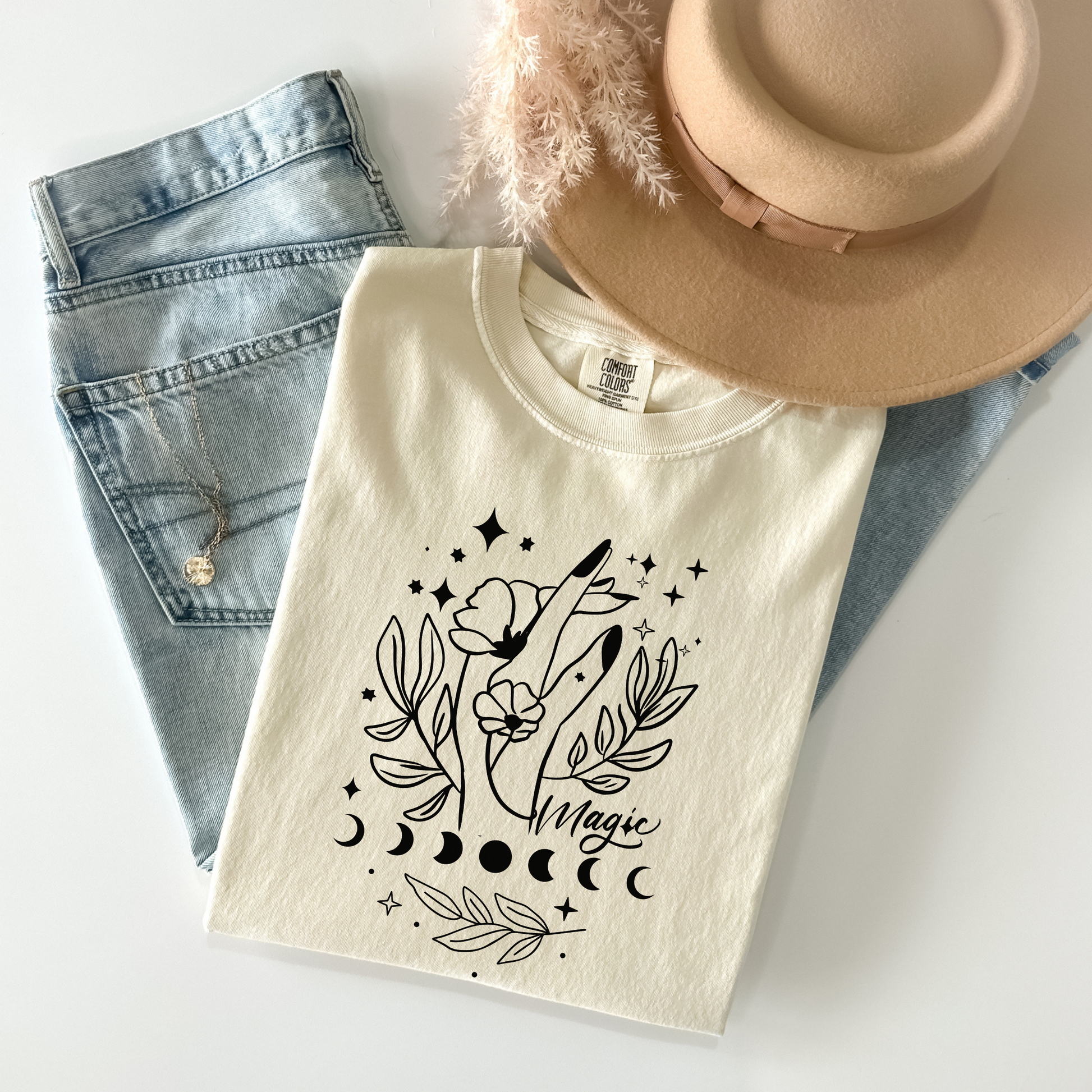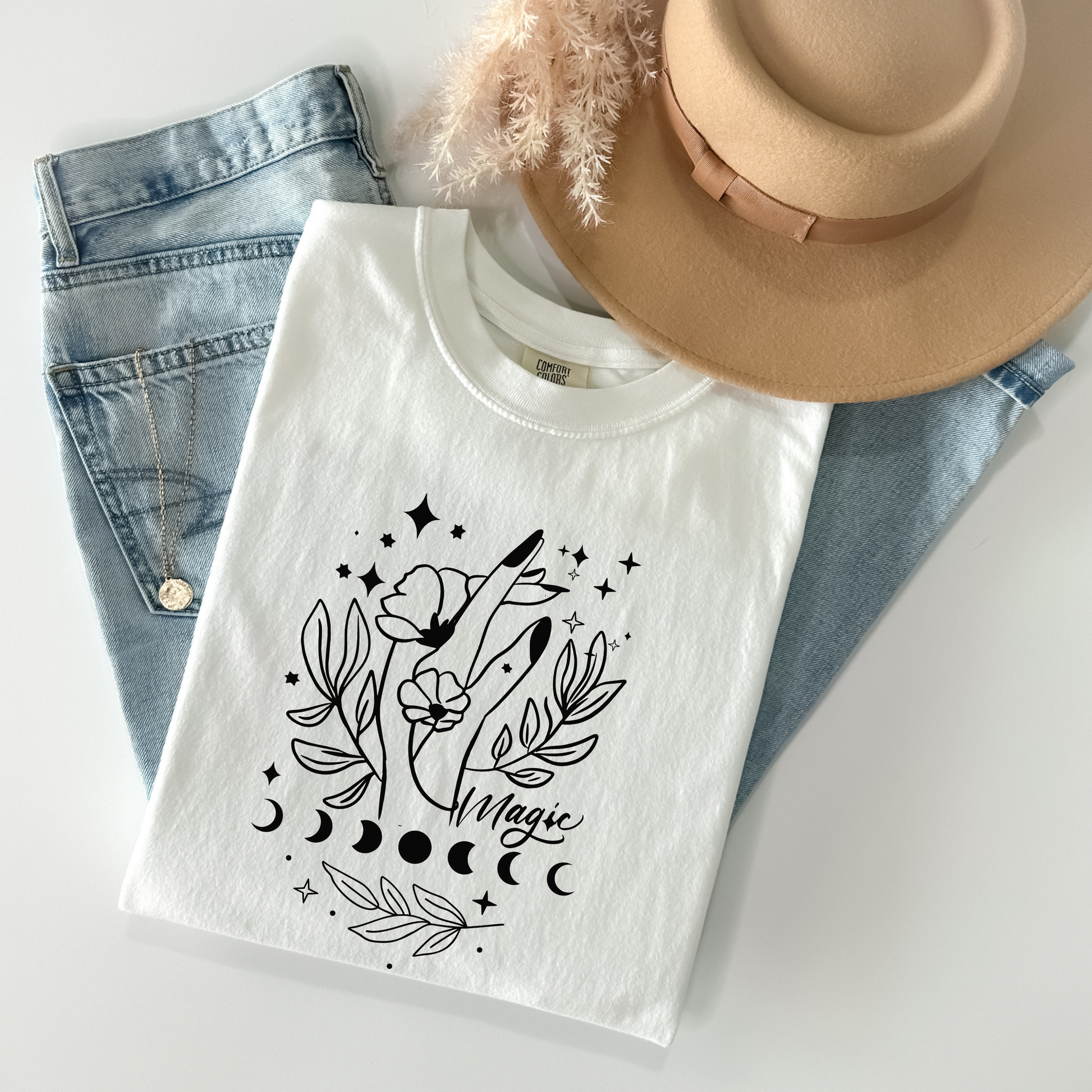 π Magical hand t-shirt featuring hands with flowers and celestial floral moon phases.