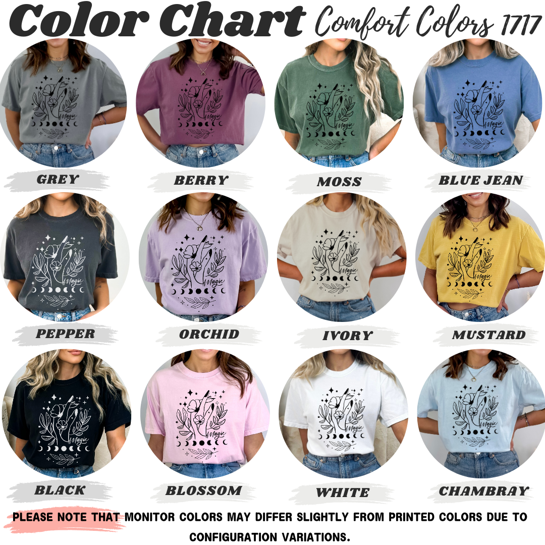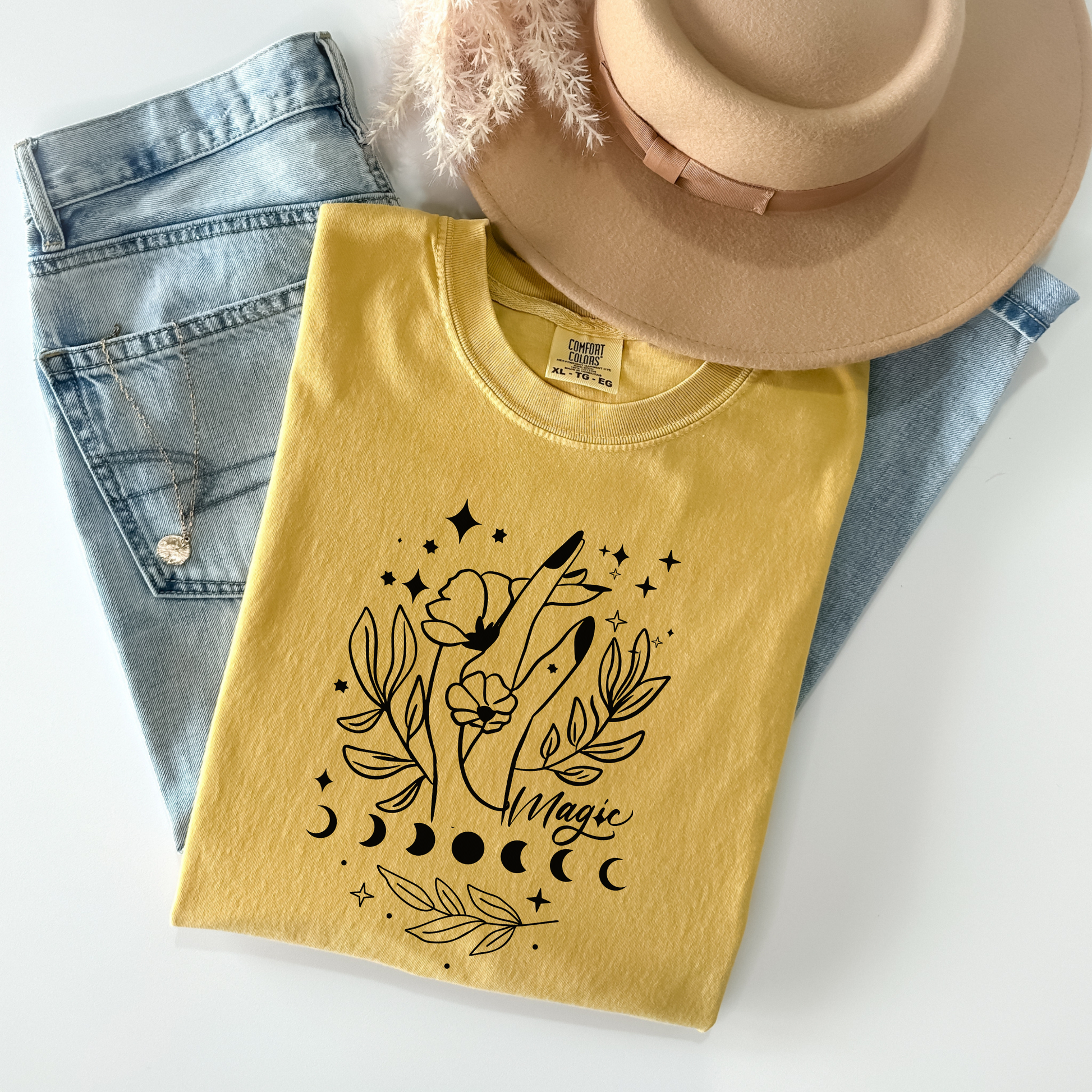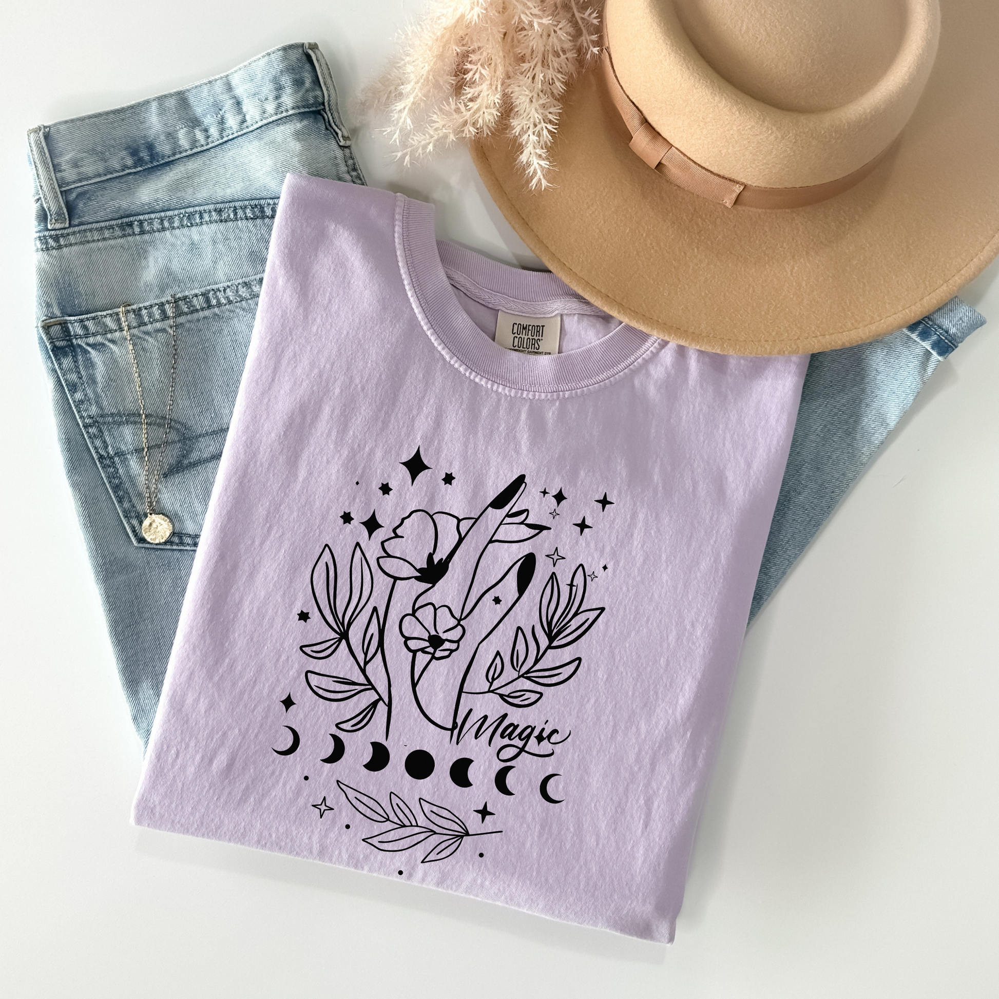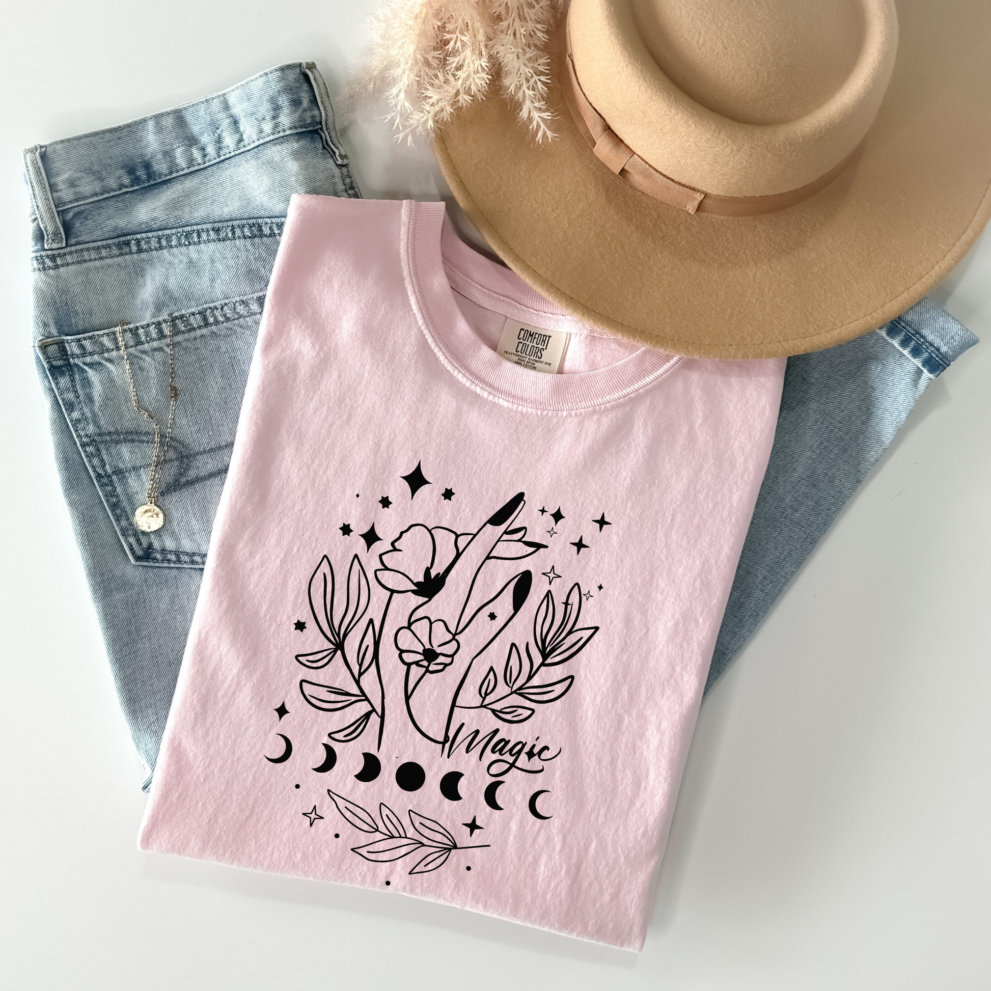 π Magical hand t-shirt featuring hands with flowers and celestial floral moon phases.