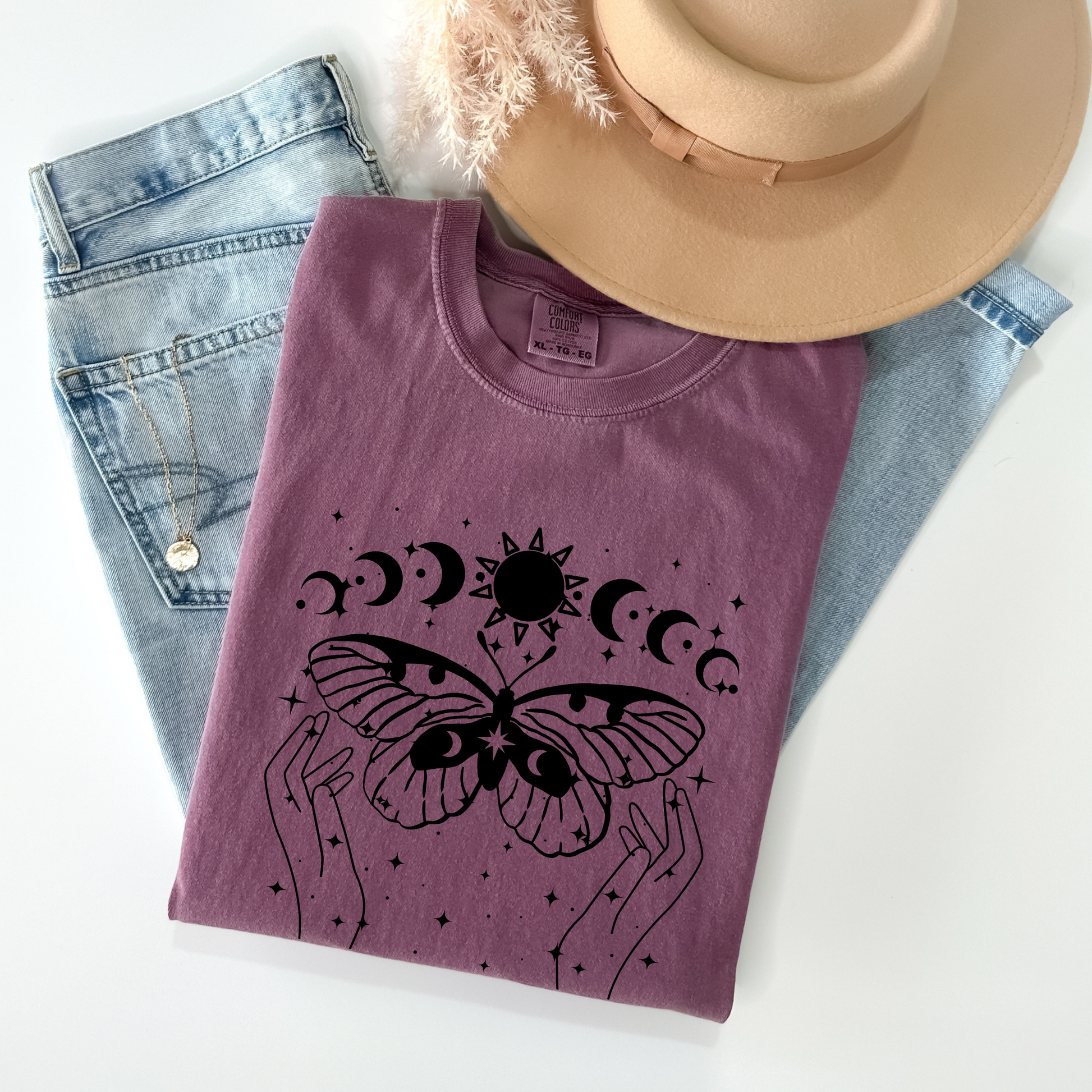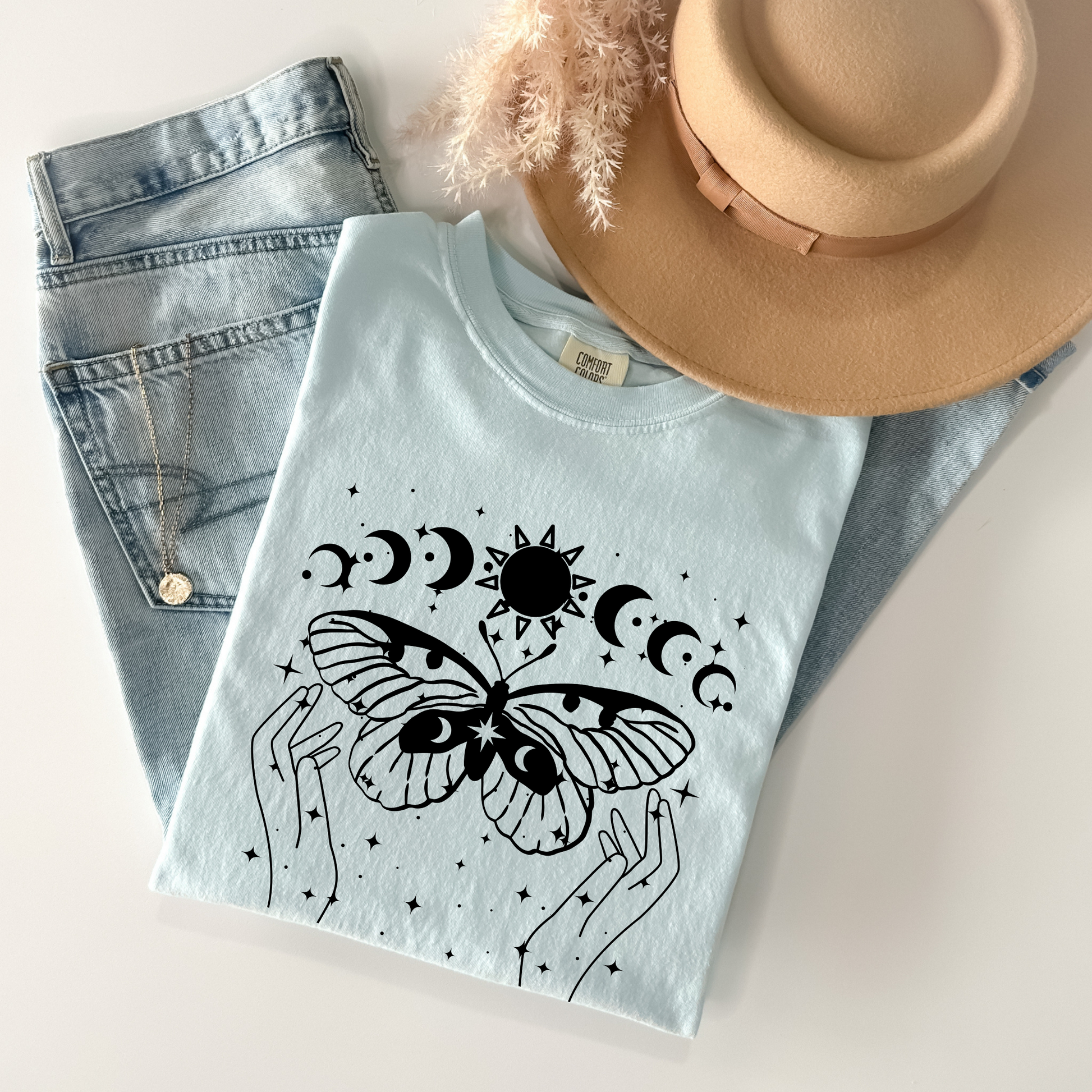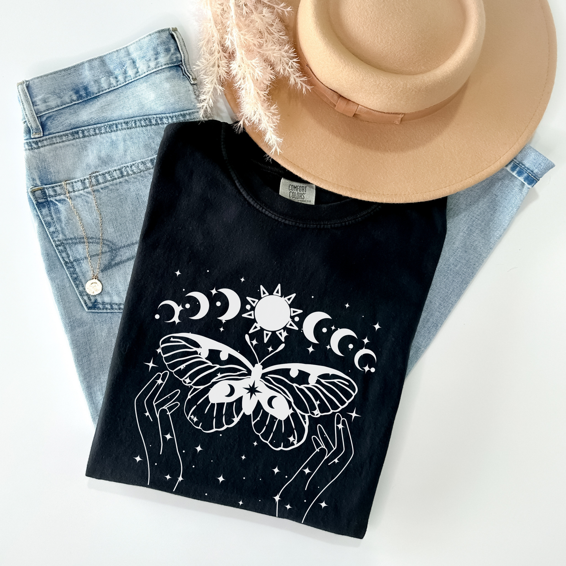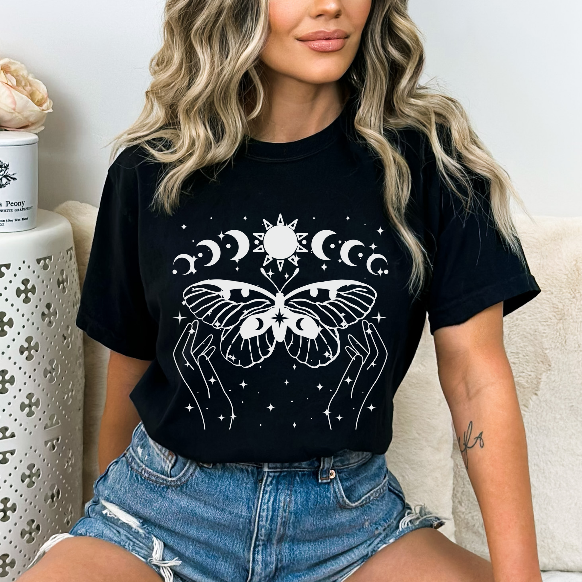 ππ¦ Celestial magic stars hands t-shirt featuring a celestial butterfly, crescent moon phases design.
