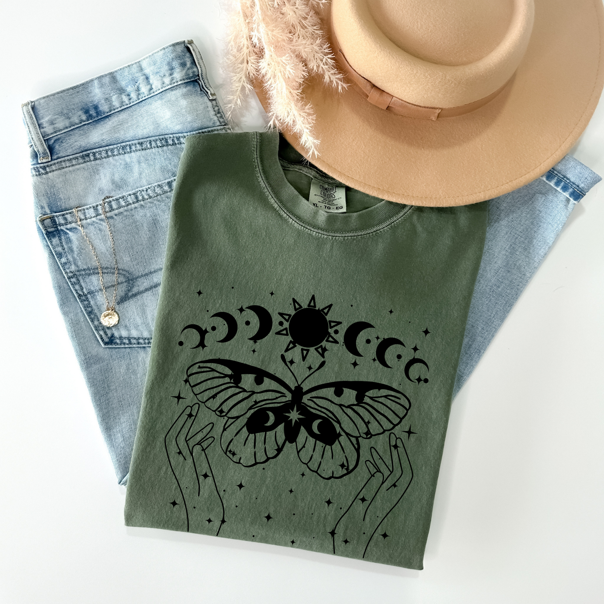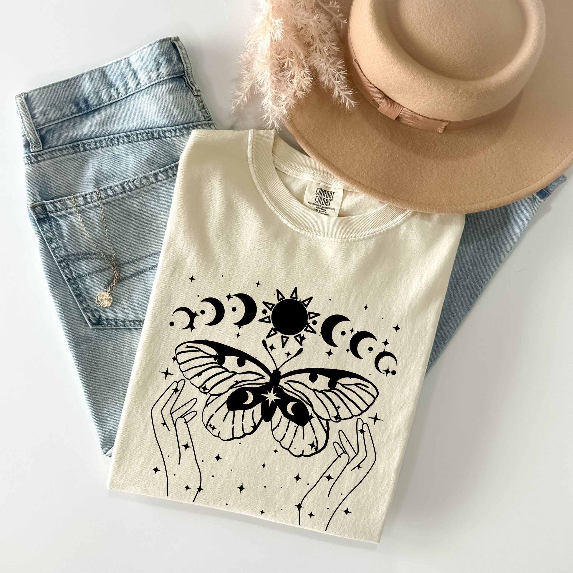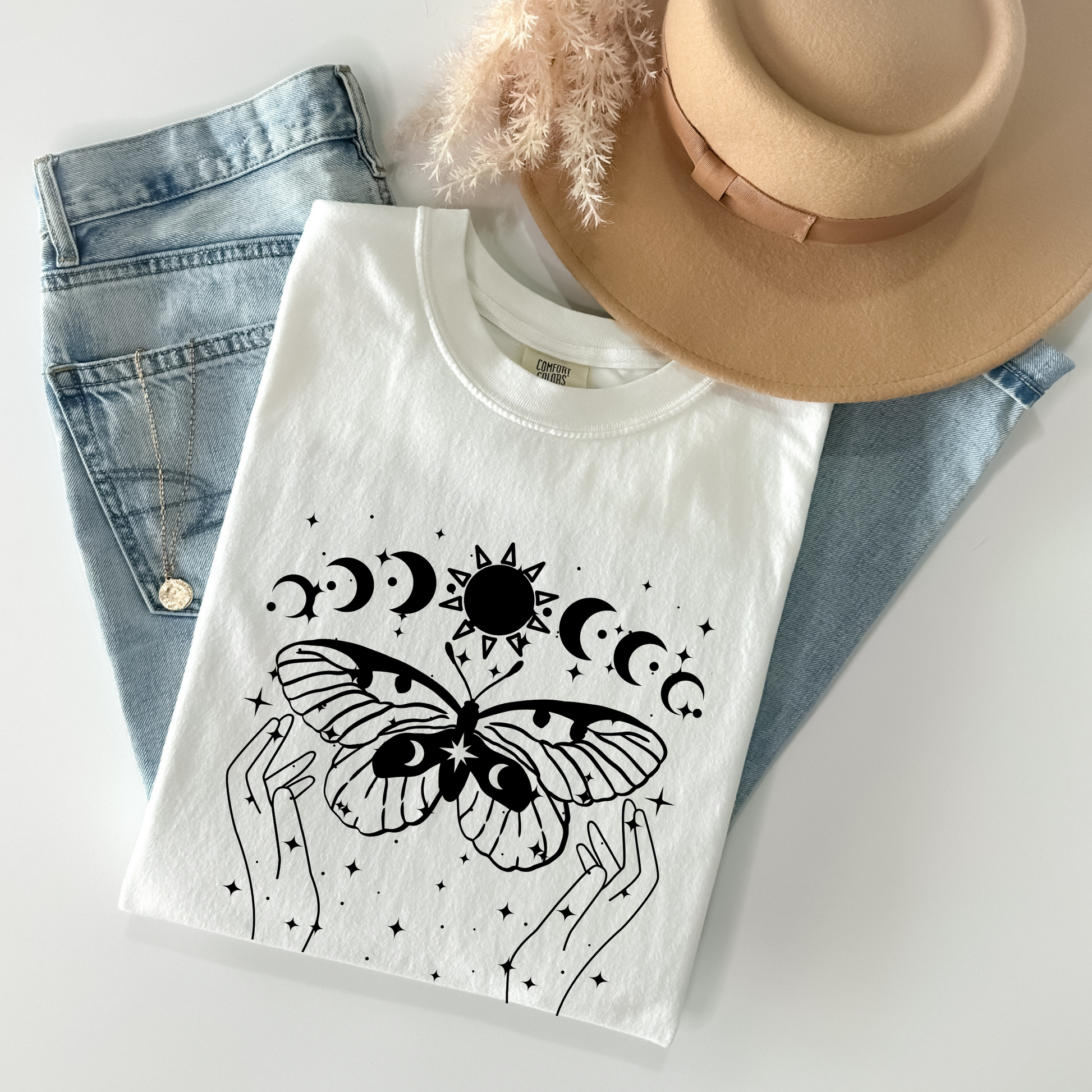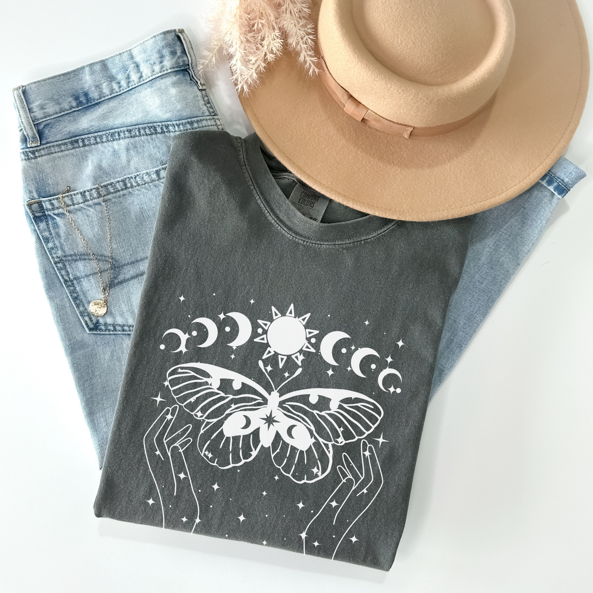 ππ¦ Celestial magic stars hands t-shirt featuring a celestial butterfly, crescent moon phases design.