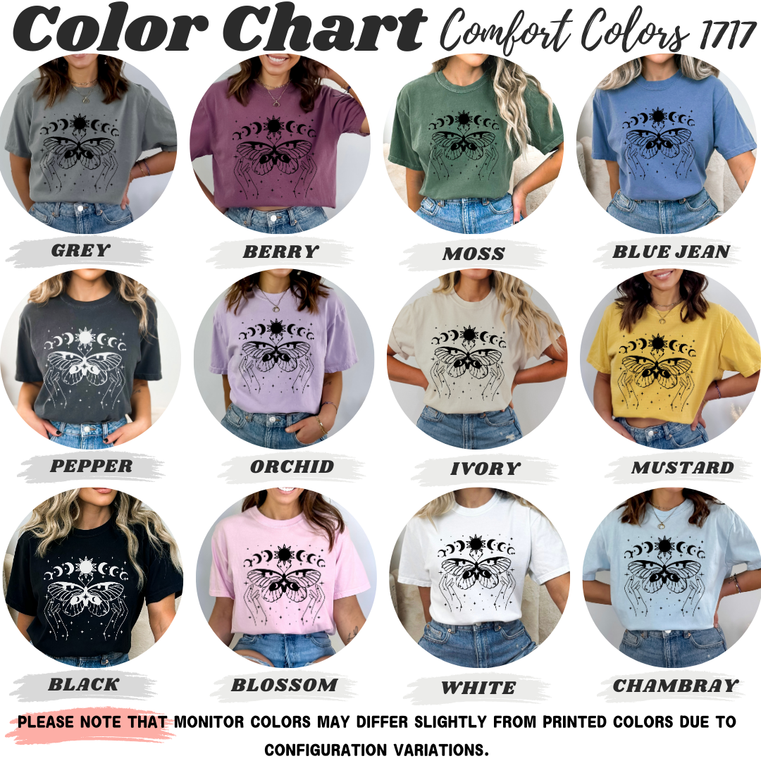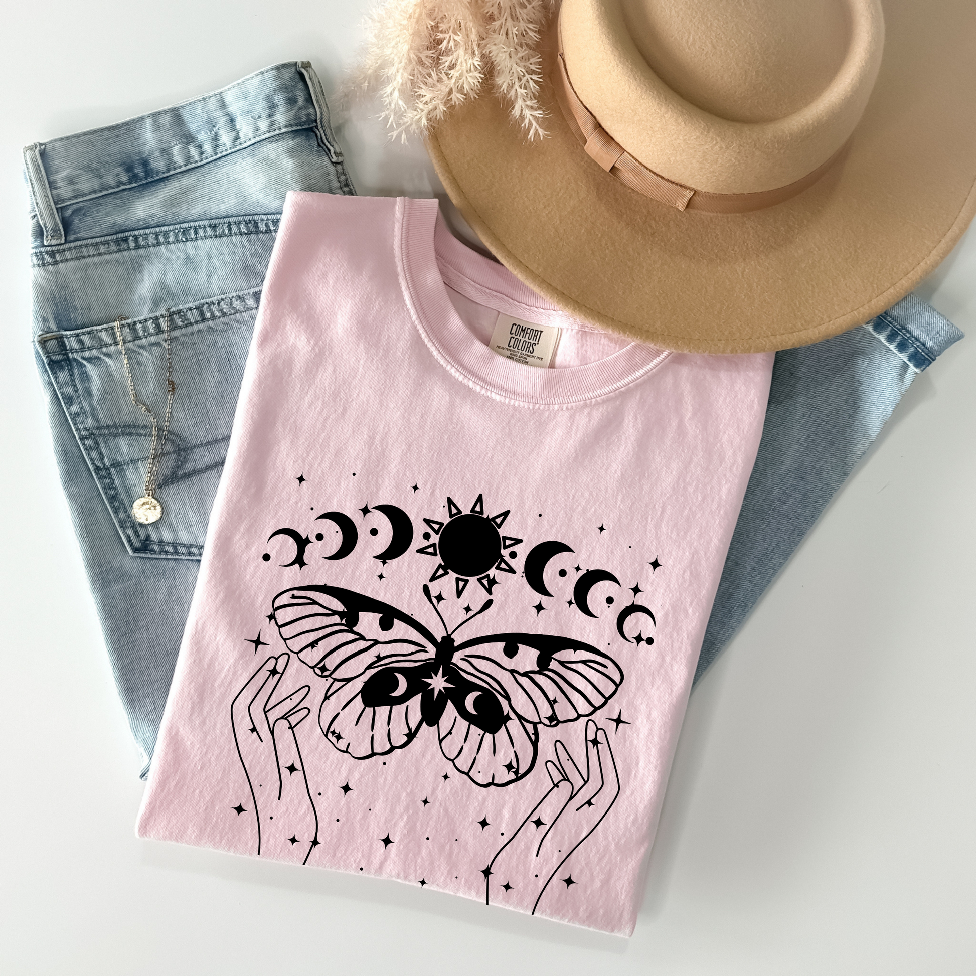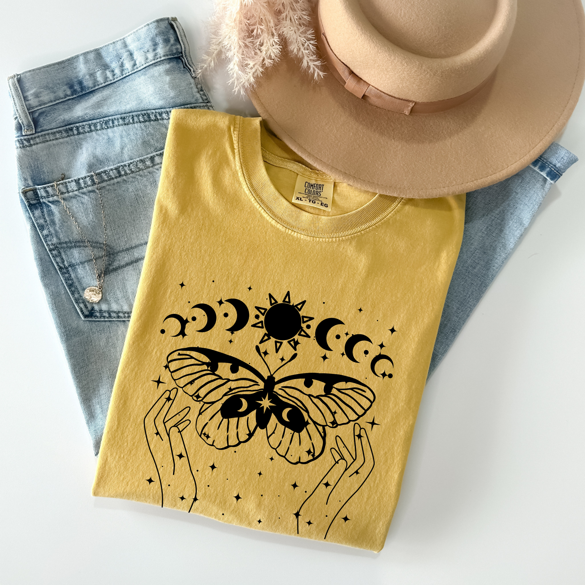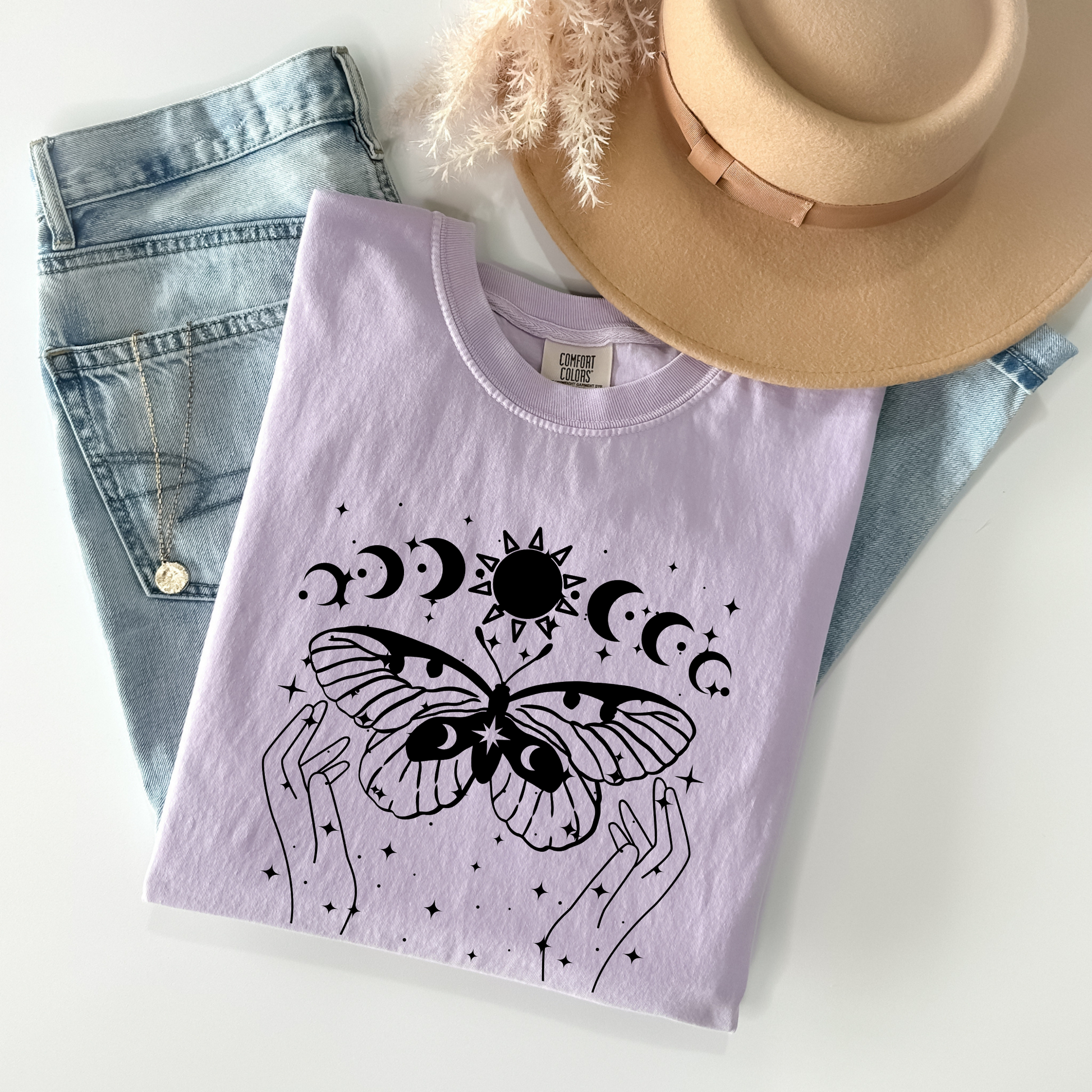 ππ¦ Celestial magic stars hands t-shirt featuring a celestial butterfly, crescent moon phases design.