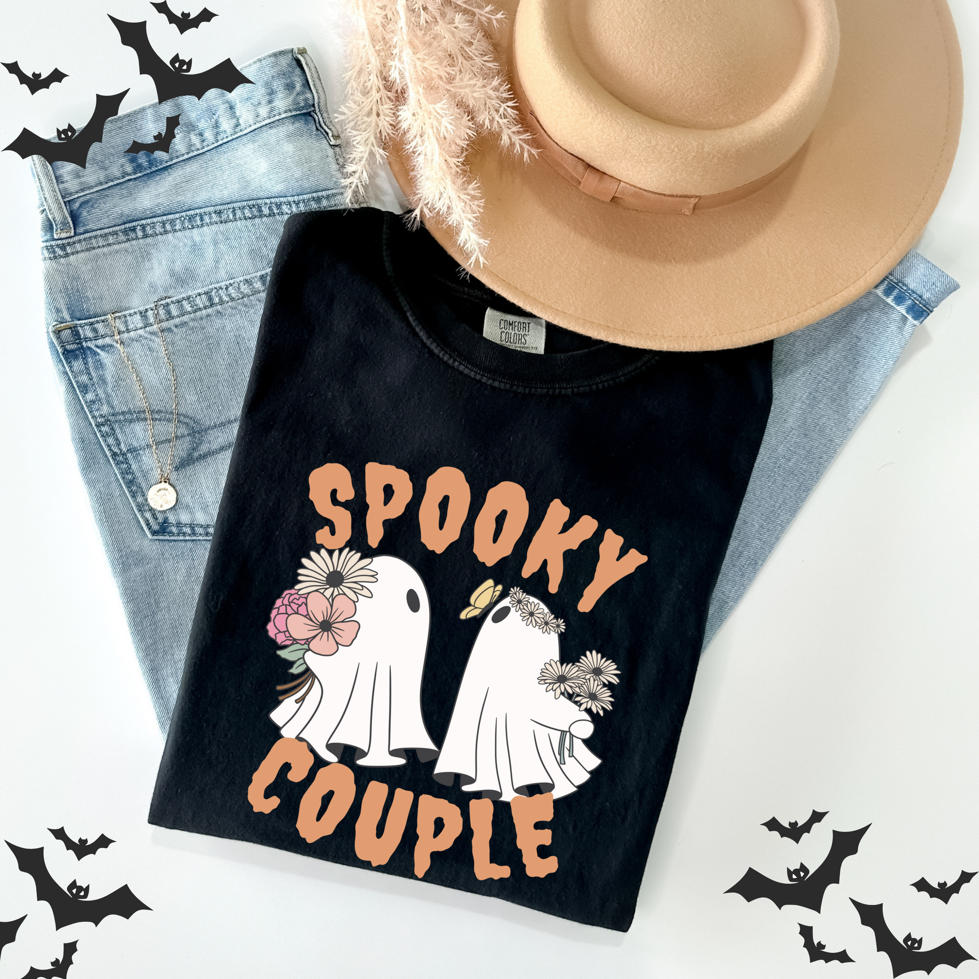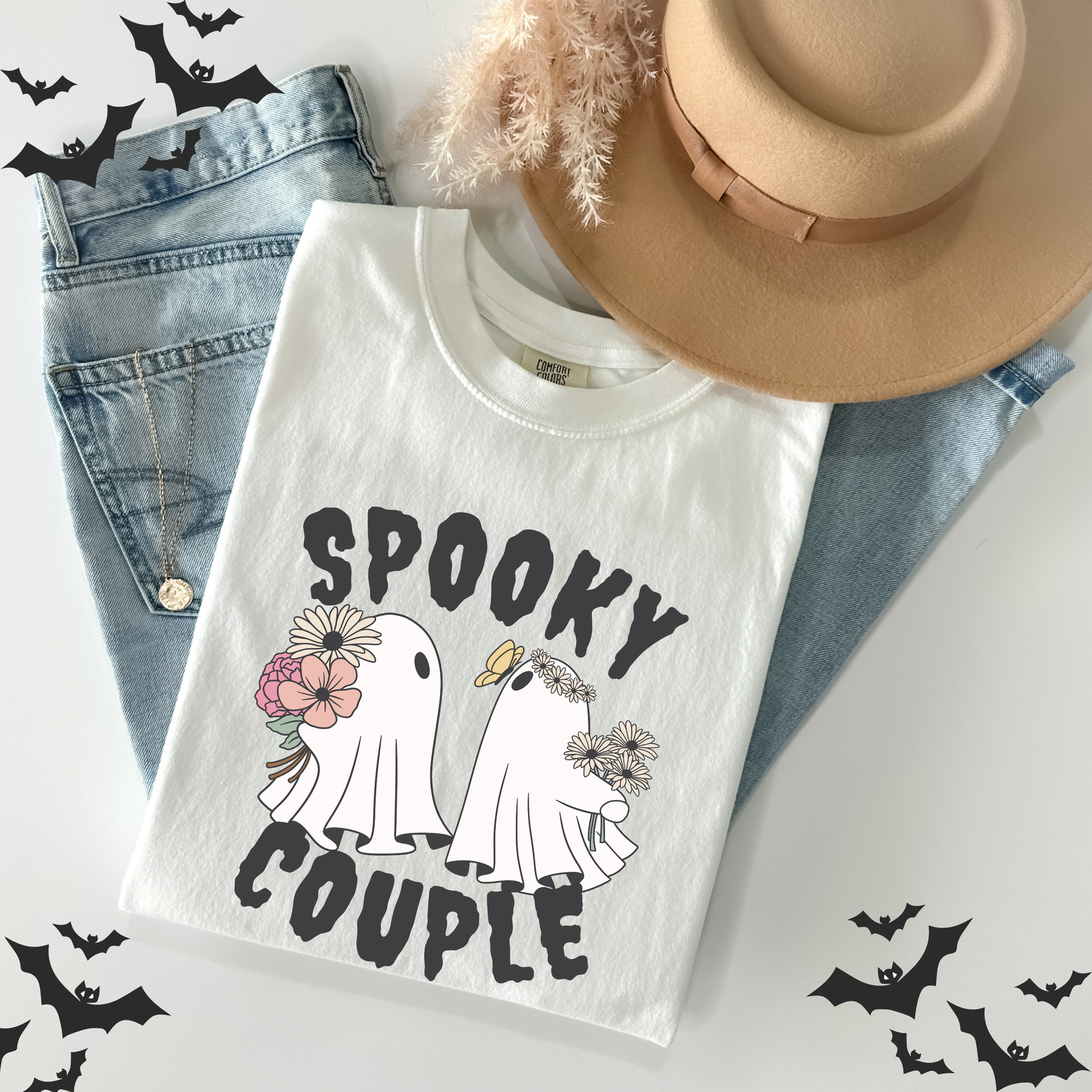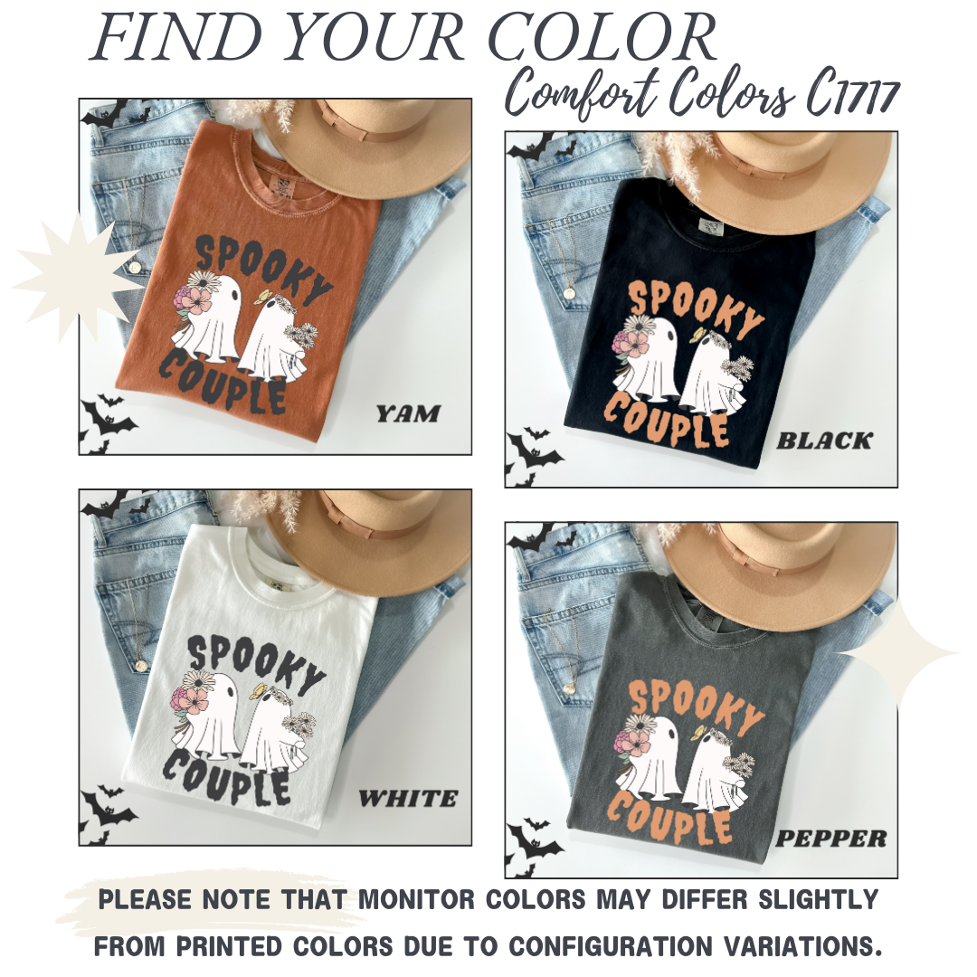 ๐ป๐ผ Celebrate Halloween with a touch of charm in our 'Floral Cute Ghost' t-shirt, featuring an adorable ghost with floral accents and 'Spooky Couple' text.