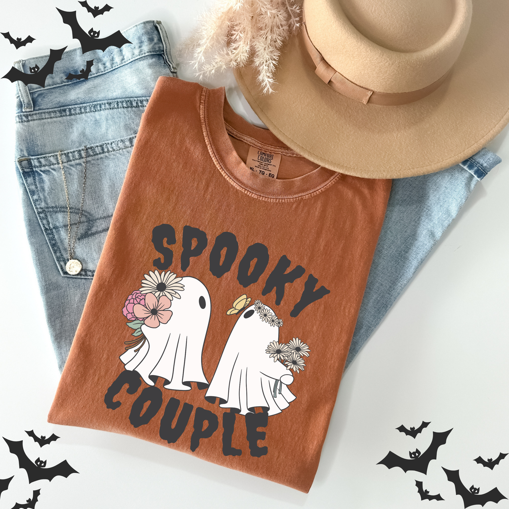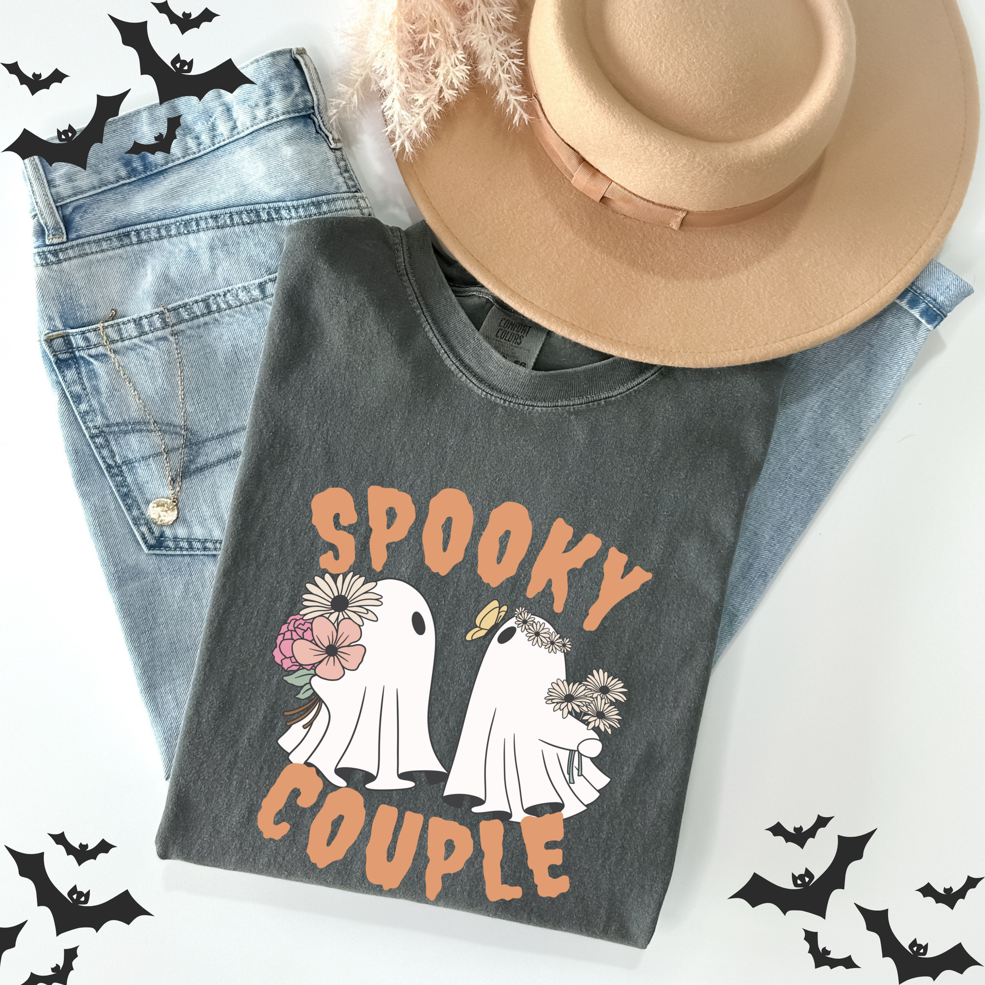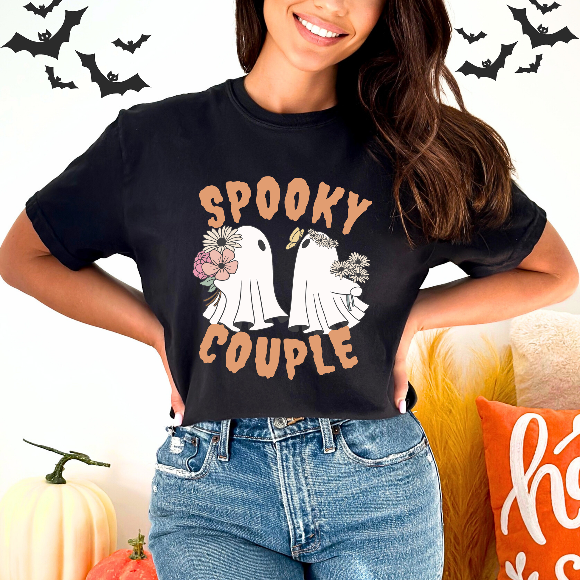 ๐ป๐ผ Celebrate Halloween with a touch of charm in our 'Floral Cute Ghost' t-shirt, featuring an adorable ghost with floral accents and 'Spooky Couple' text.