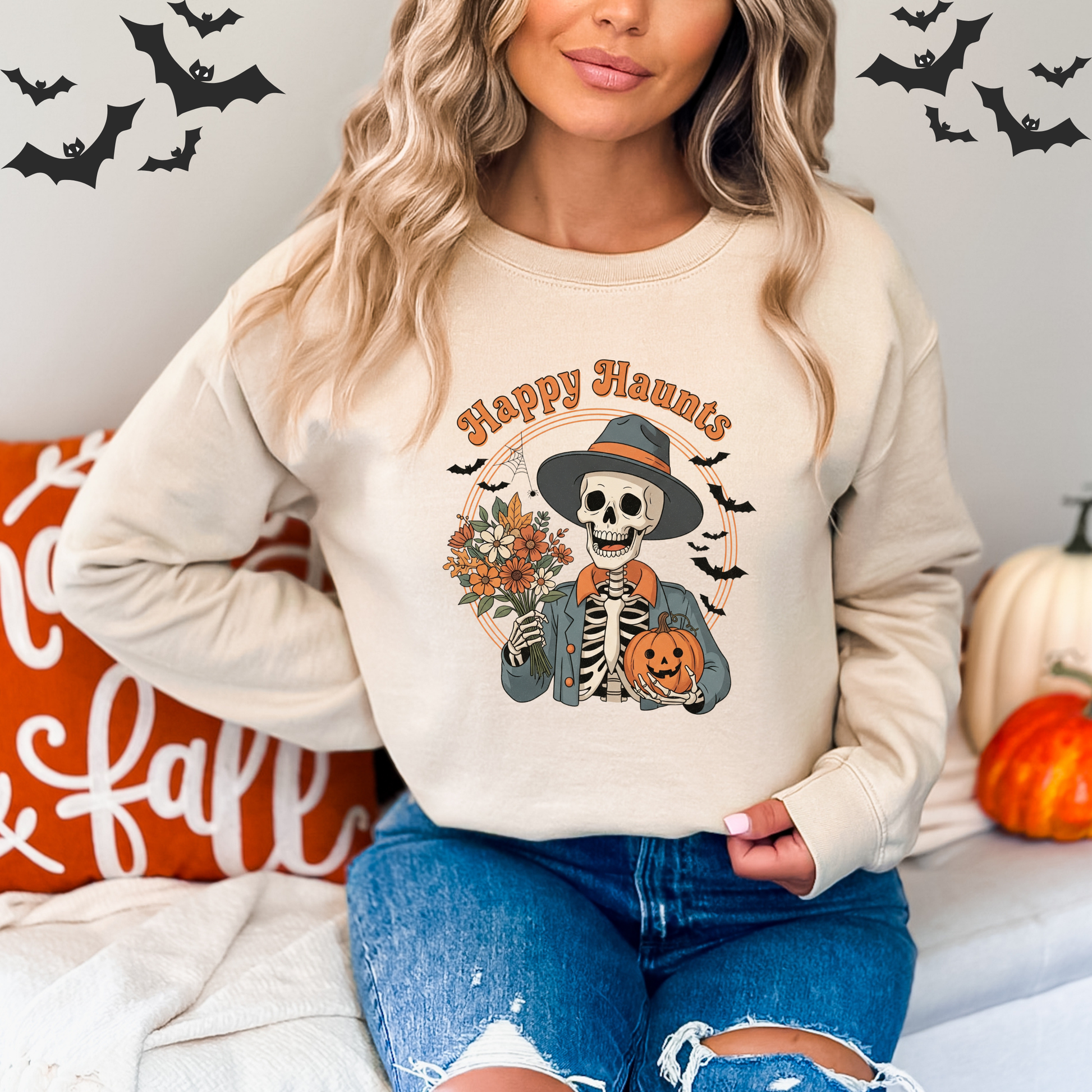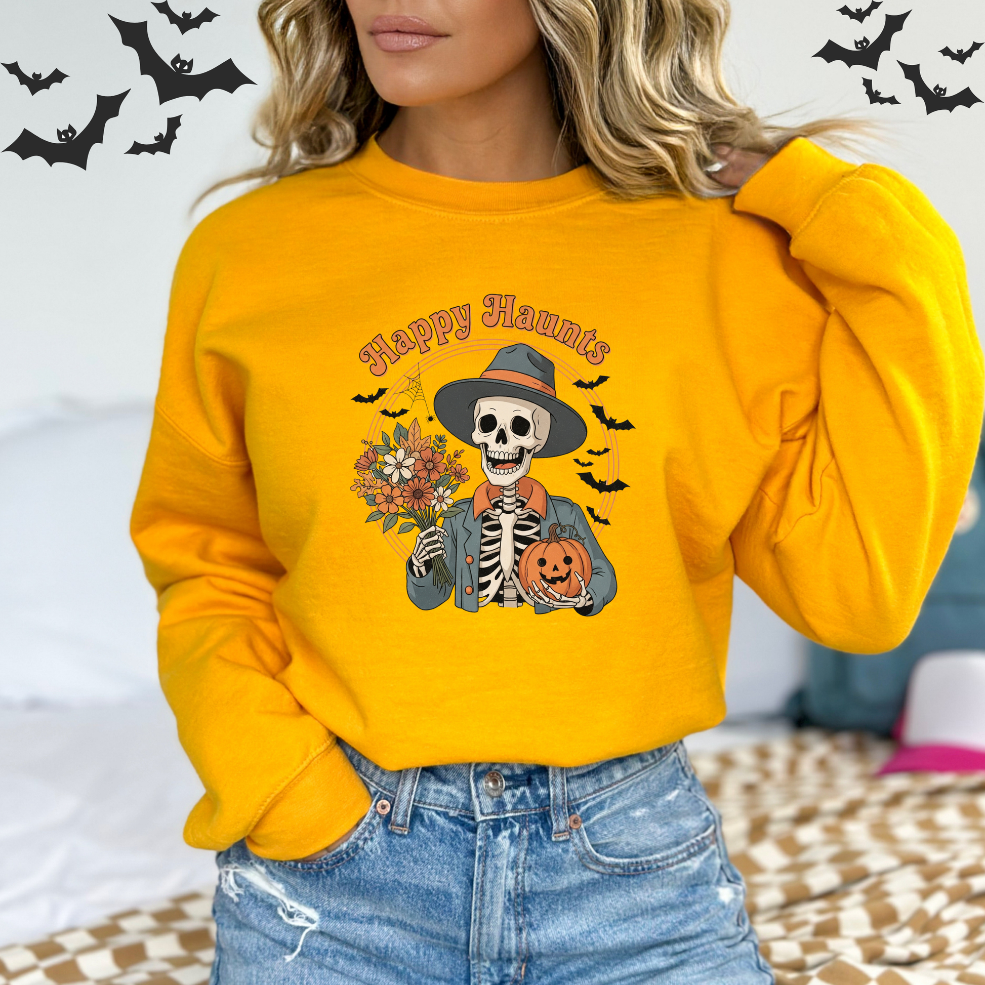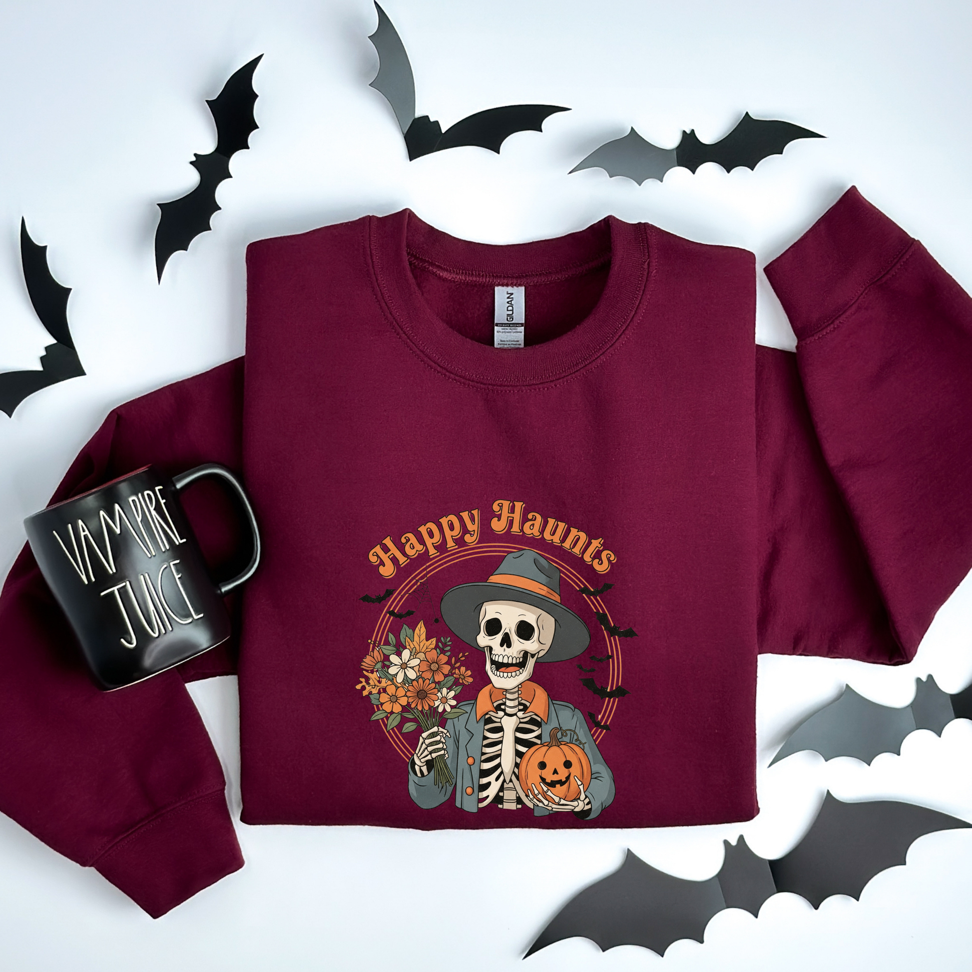 ๐๐ This whimsical, vintage-style design features a charming skeleton holding a bouquet of flowers and a pumpkin.