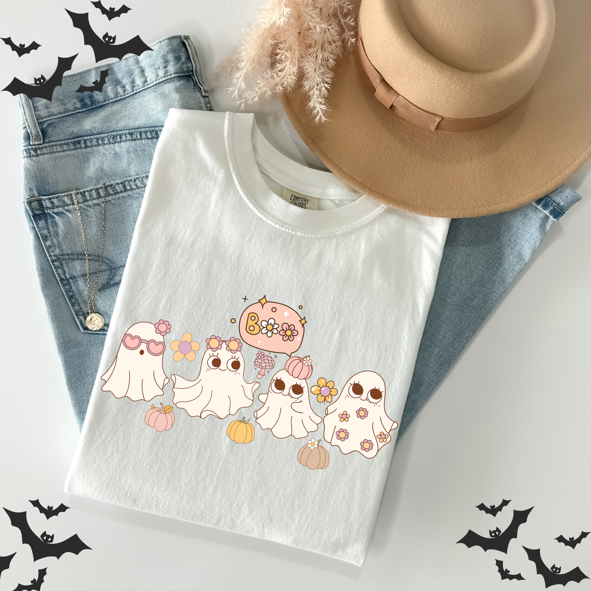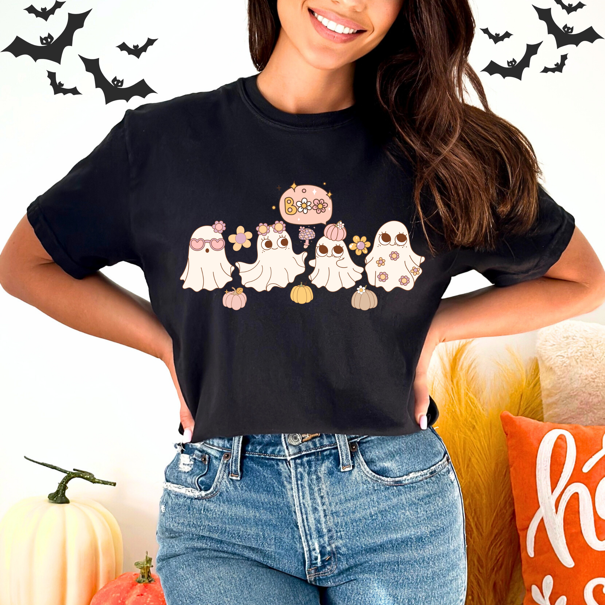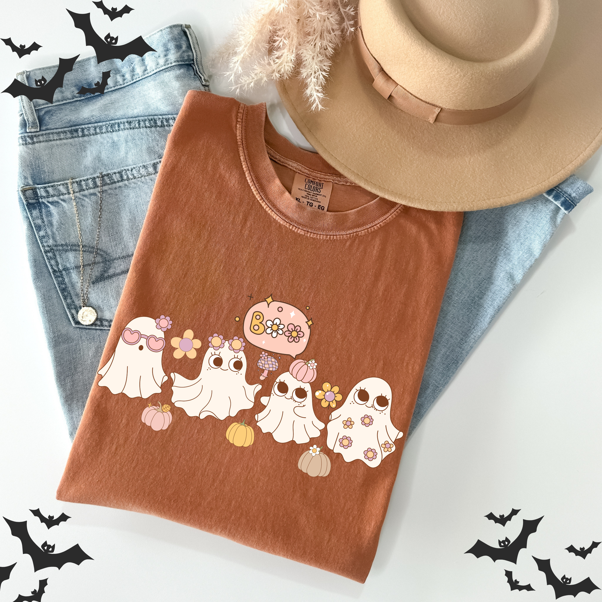 ππ Celebrate Halloween with a retro twist in our 'Groovy Halloween' t-shirt, featuring a groovy ghost, 'boo' text, flowers, mushrooms, and autumn pumpkins.