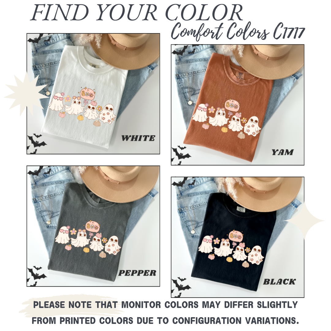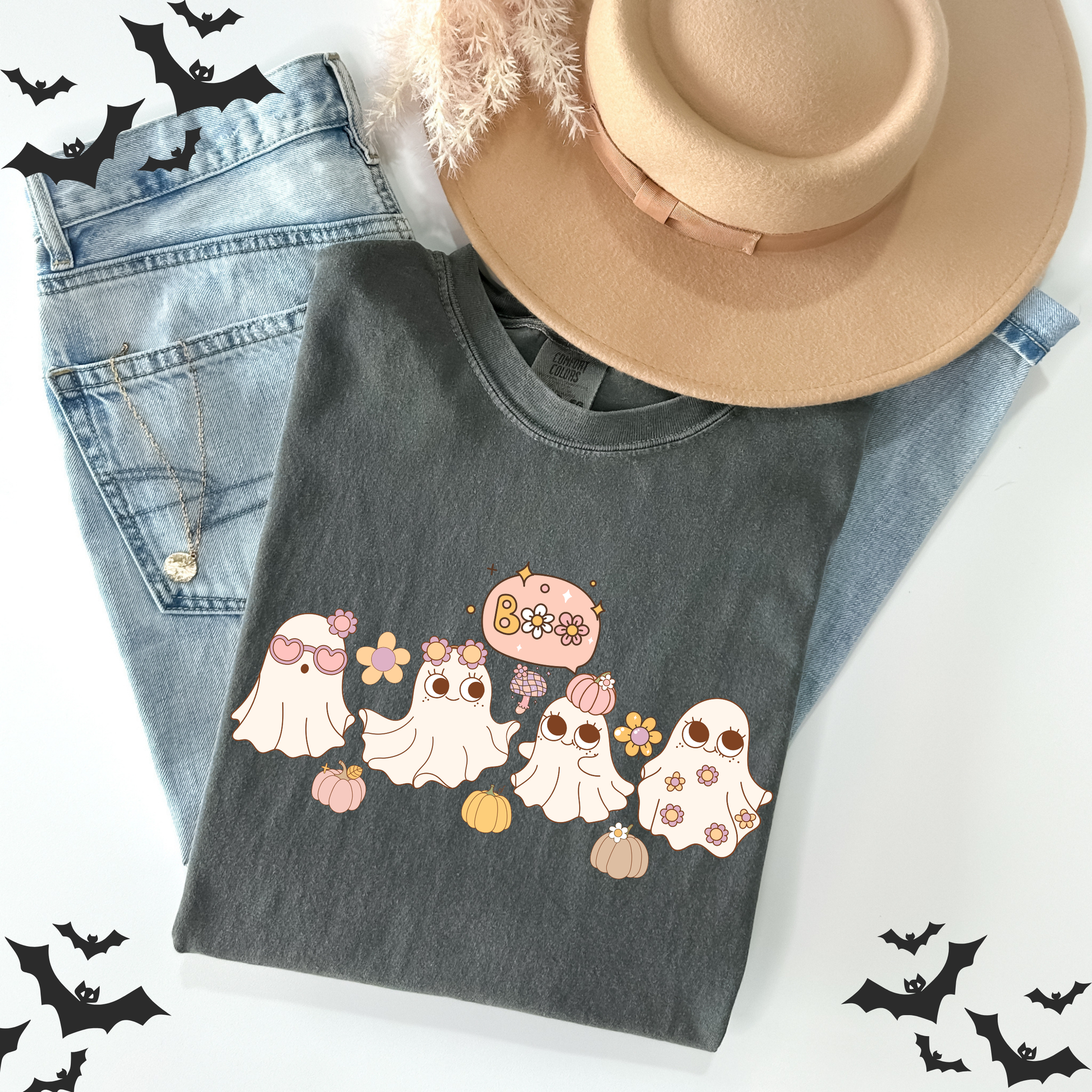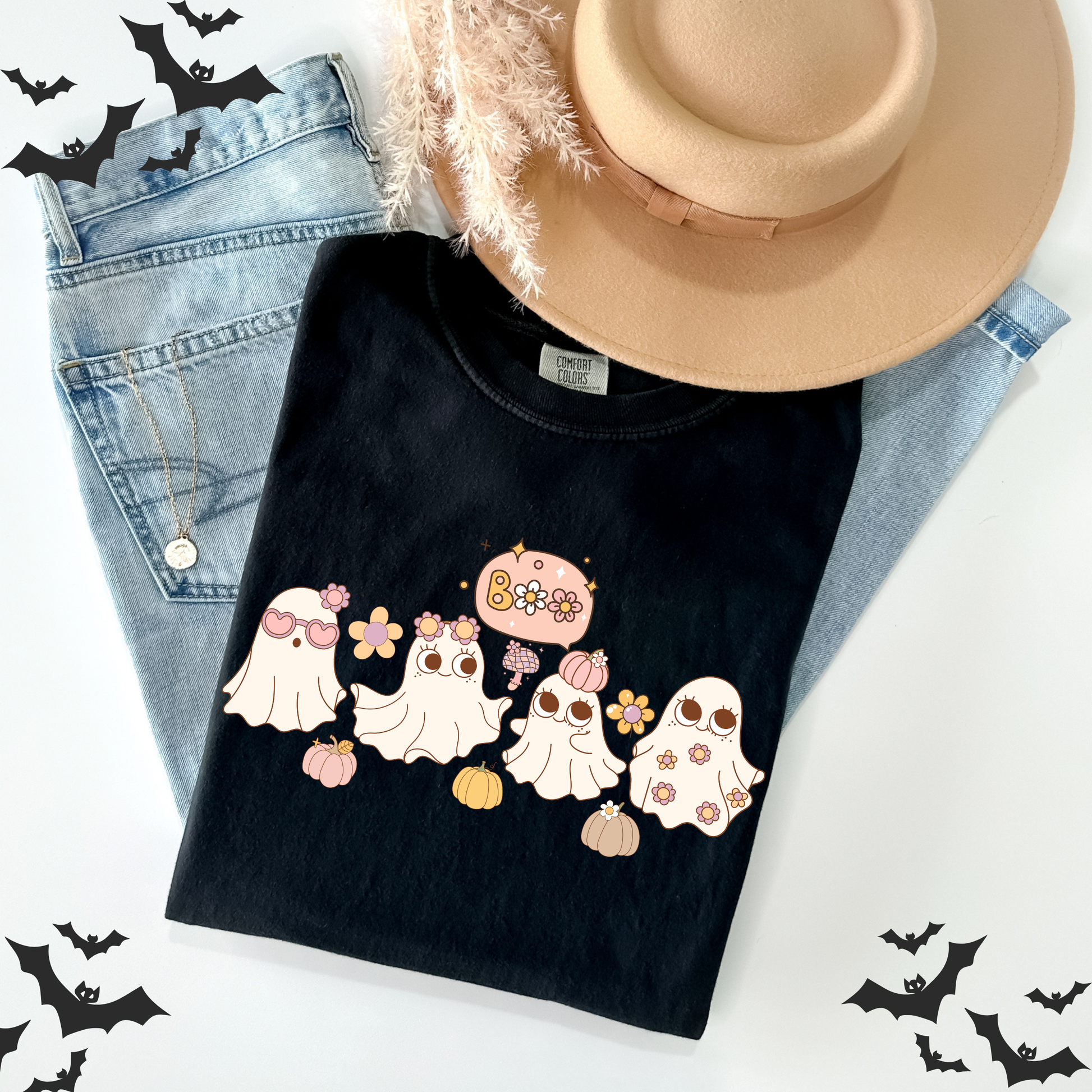ππ Celebrate Halloween with a retro twist in our 'Groovy Halloween' t-shirt, featuring a groovy ghost, 'boo' text, flowers, mushrooms, and autumn pumpkins.