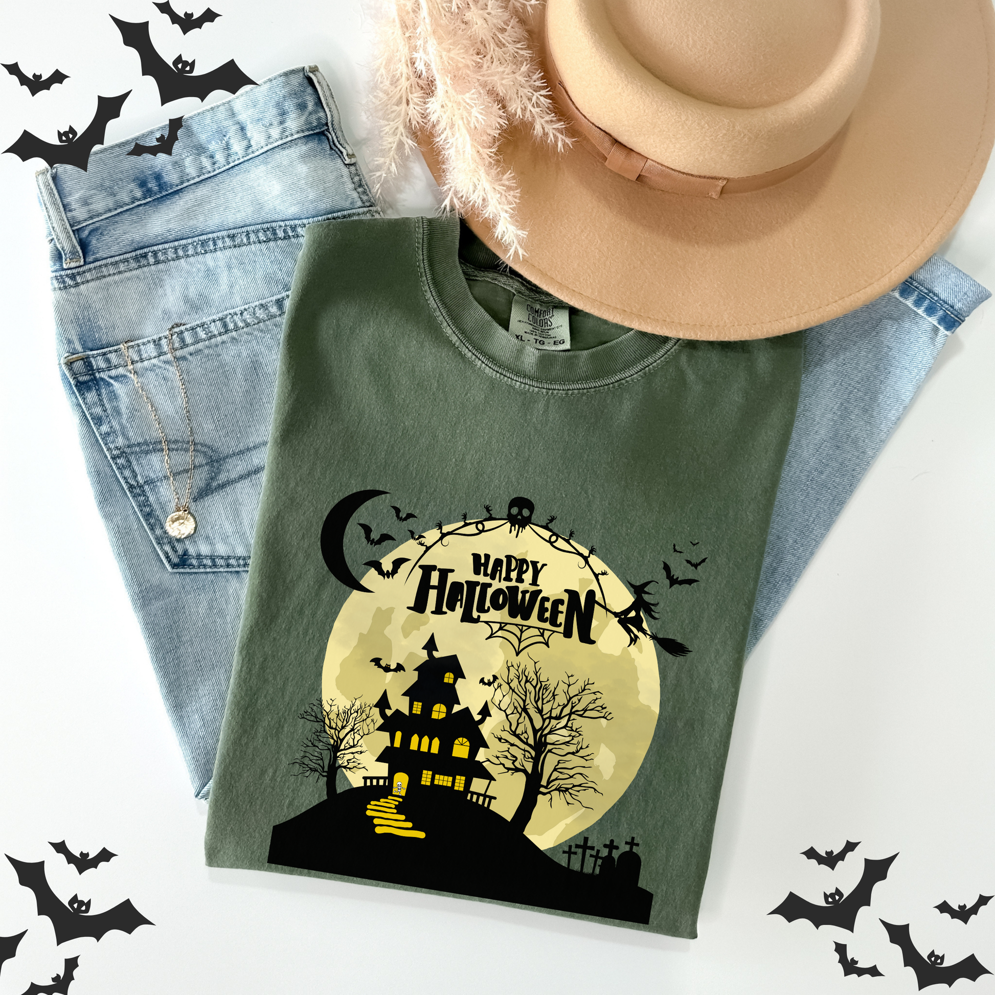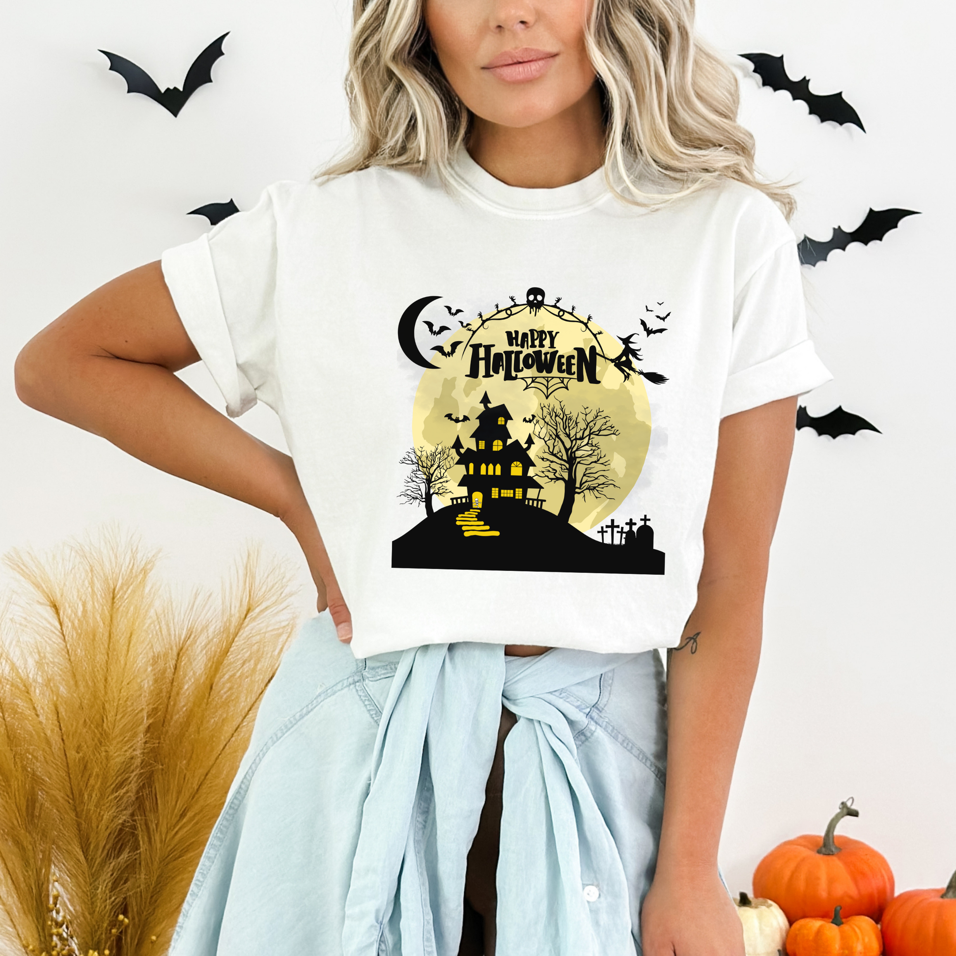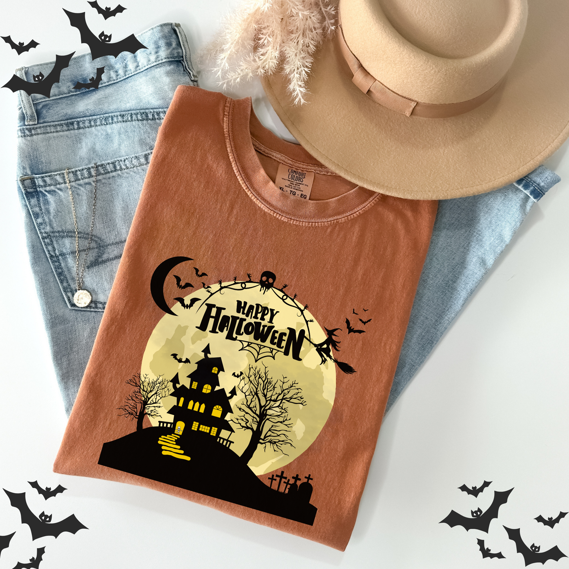 ππ Get into the Halloween spirit with our 'Happy Halloween' t-shirt, featuring a spooky skeleton and bats silhouette illustration.