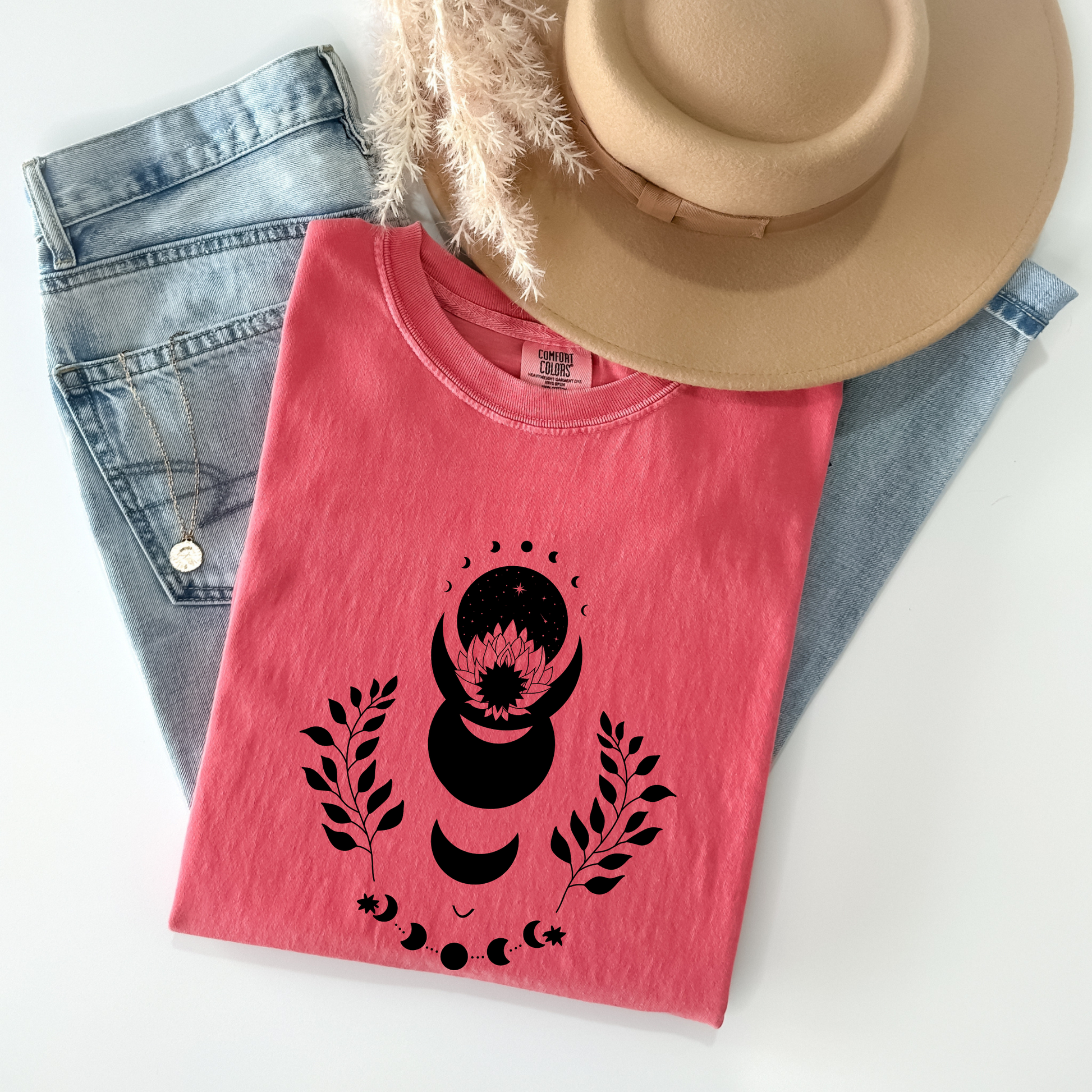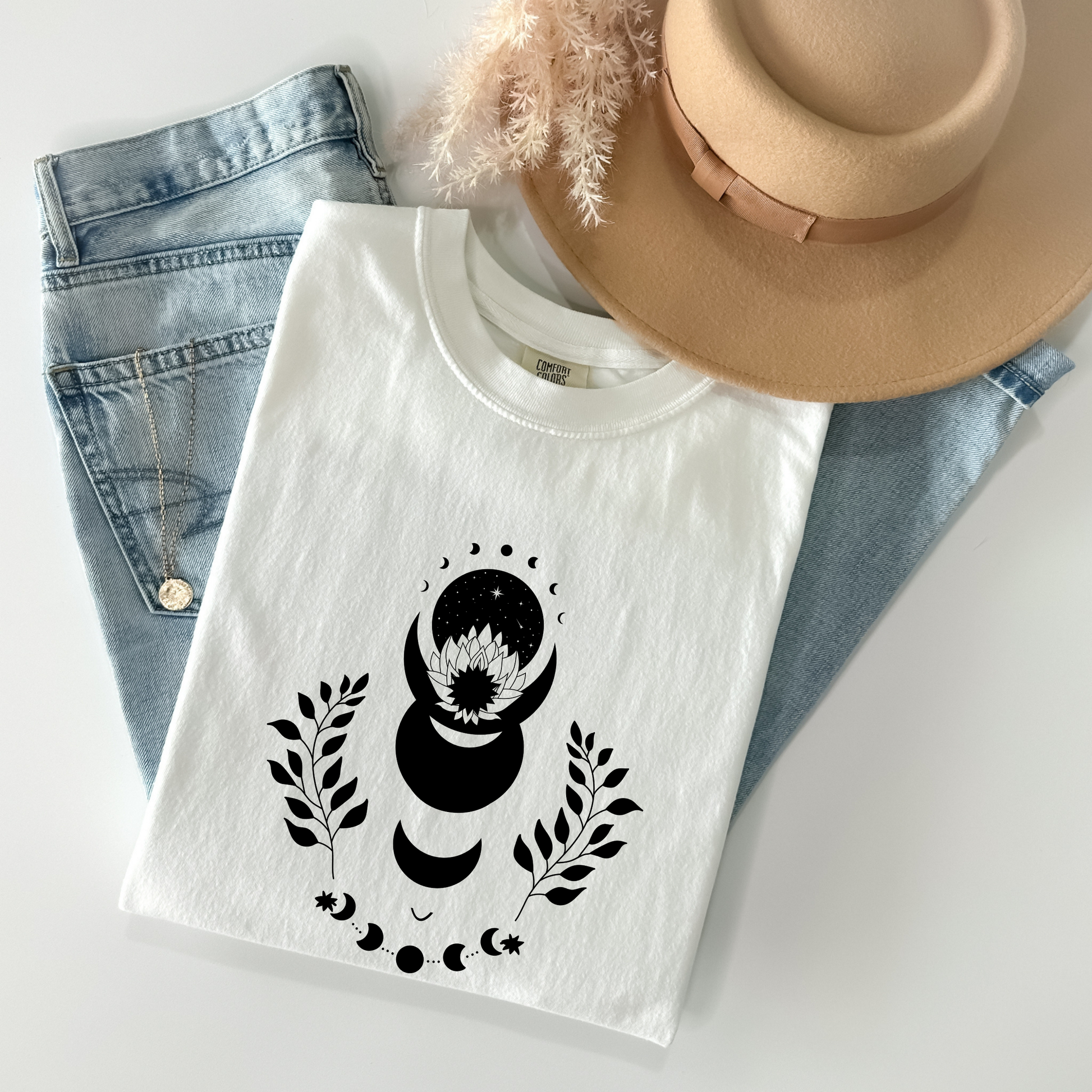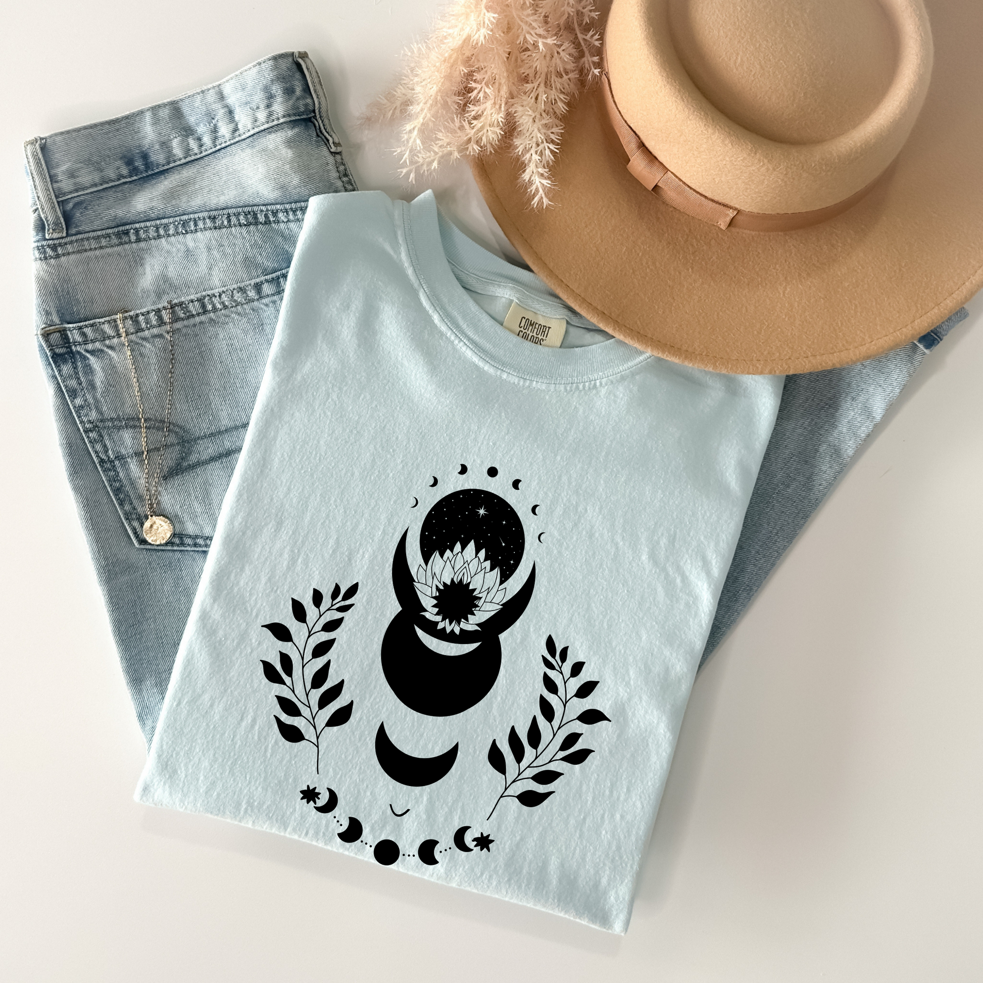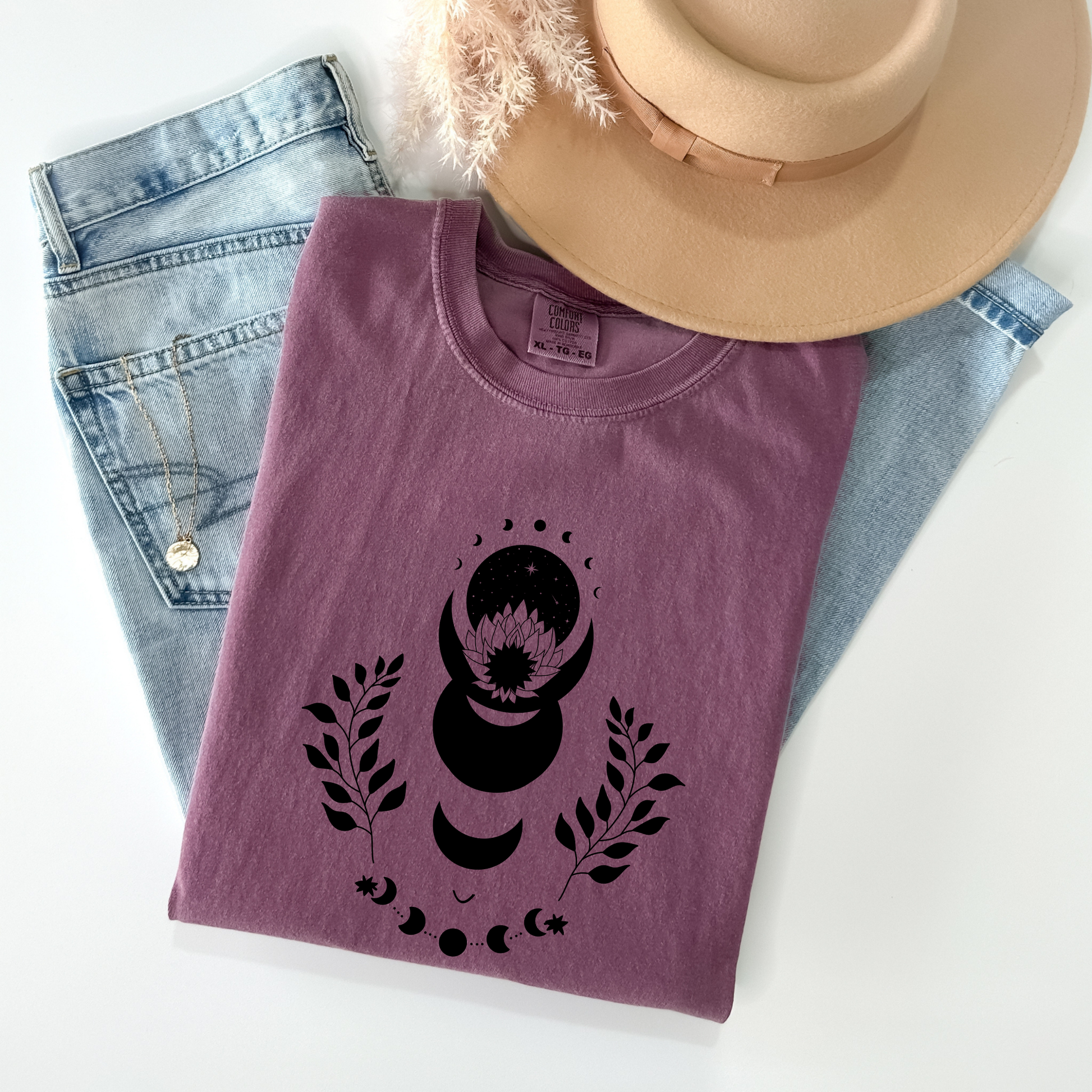 🌓🪷 Elevate your style with our 'Celestial Moon Phases t-shirt, featuring a beautiful blend of moon phases, a lotus flower, and a modern minimalist floral print with plants.