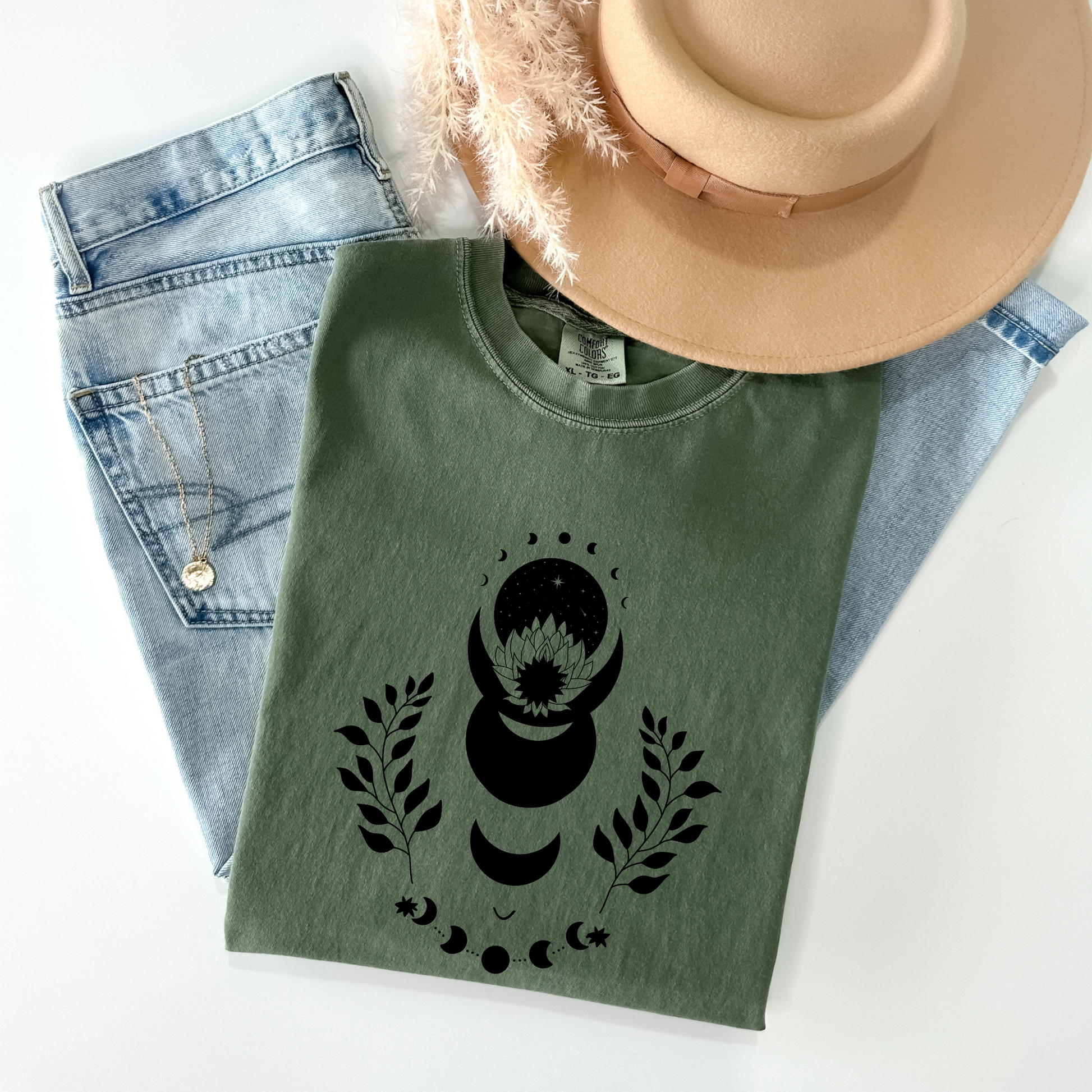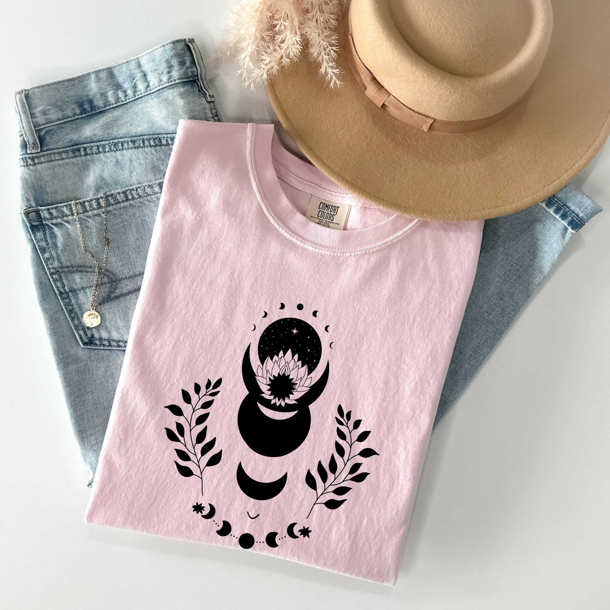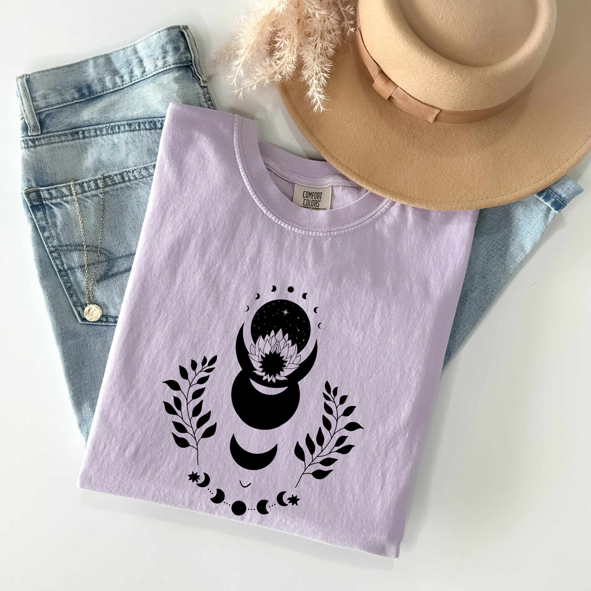 🌓🪷 Elevate your style with our 'Celestial Moon Phases t-shirt, featuring a beautiful blend of moon phases, a lotus flower, and a modern minimalist floral print with plants.