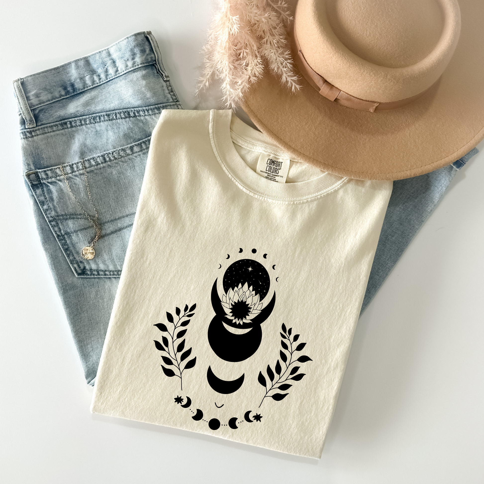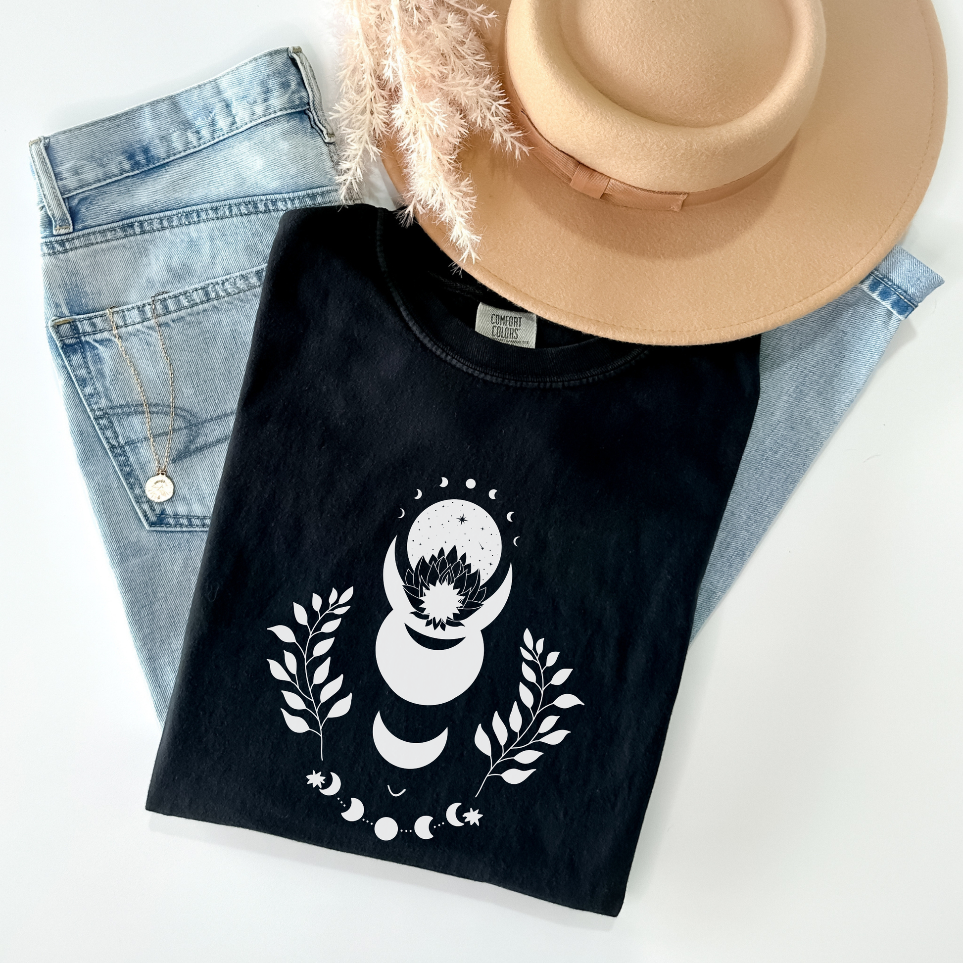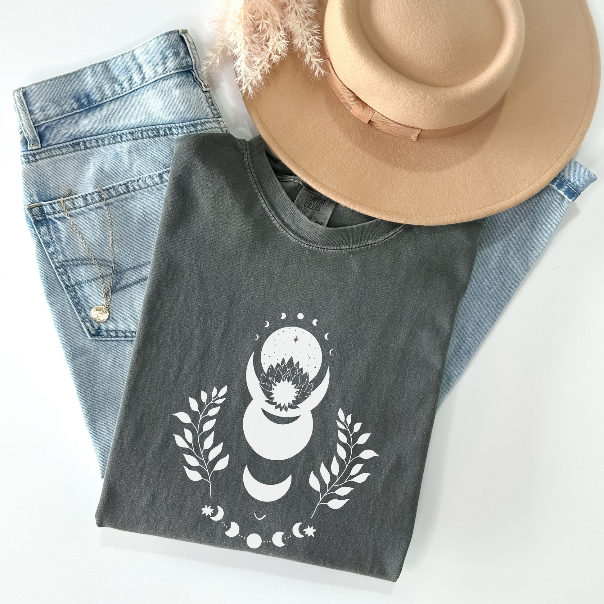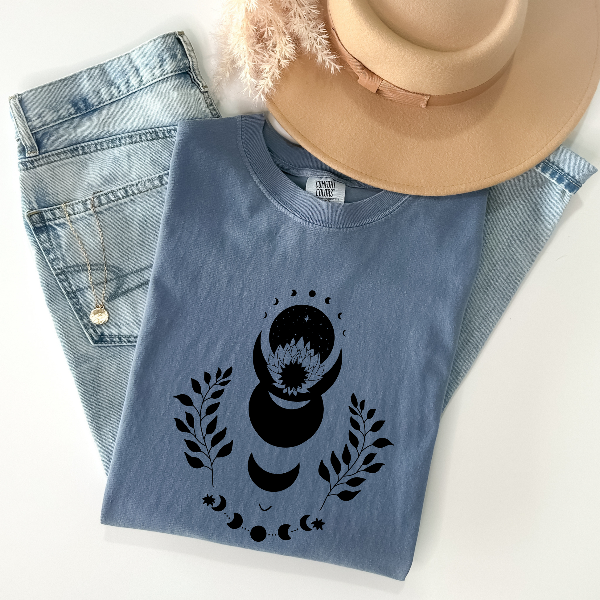 🌓🪷 Elevate your style with our 'Celestial Moon Phases t-shirt, featuring a beautiful blend of moon phases, a lotus flower, and a modern minimalist floral print with plants.
