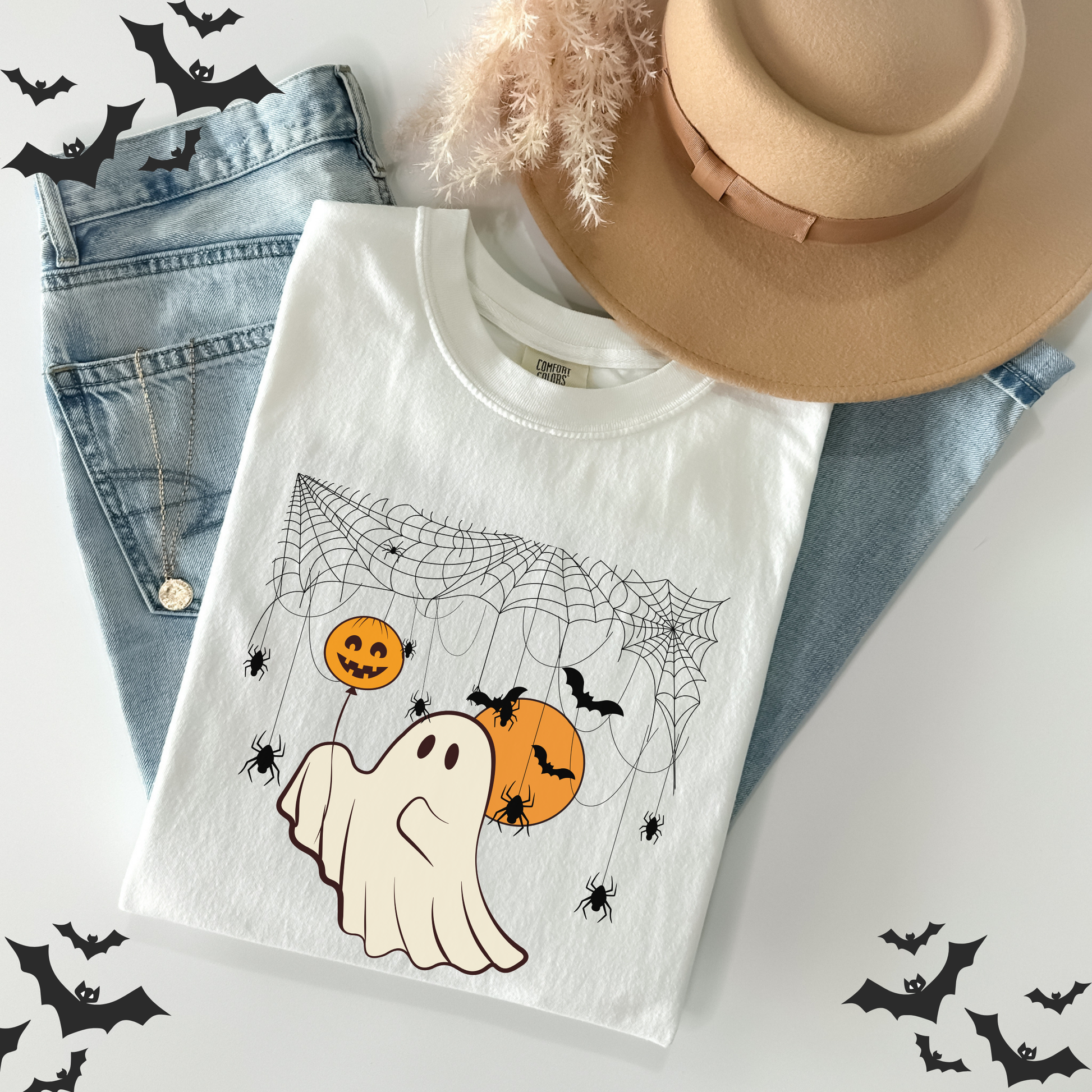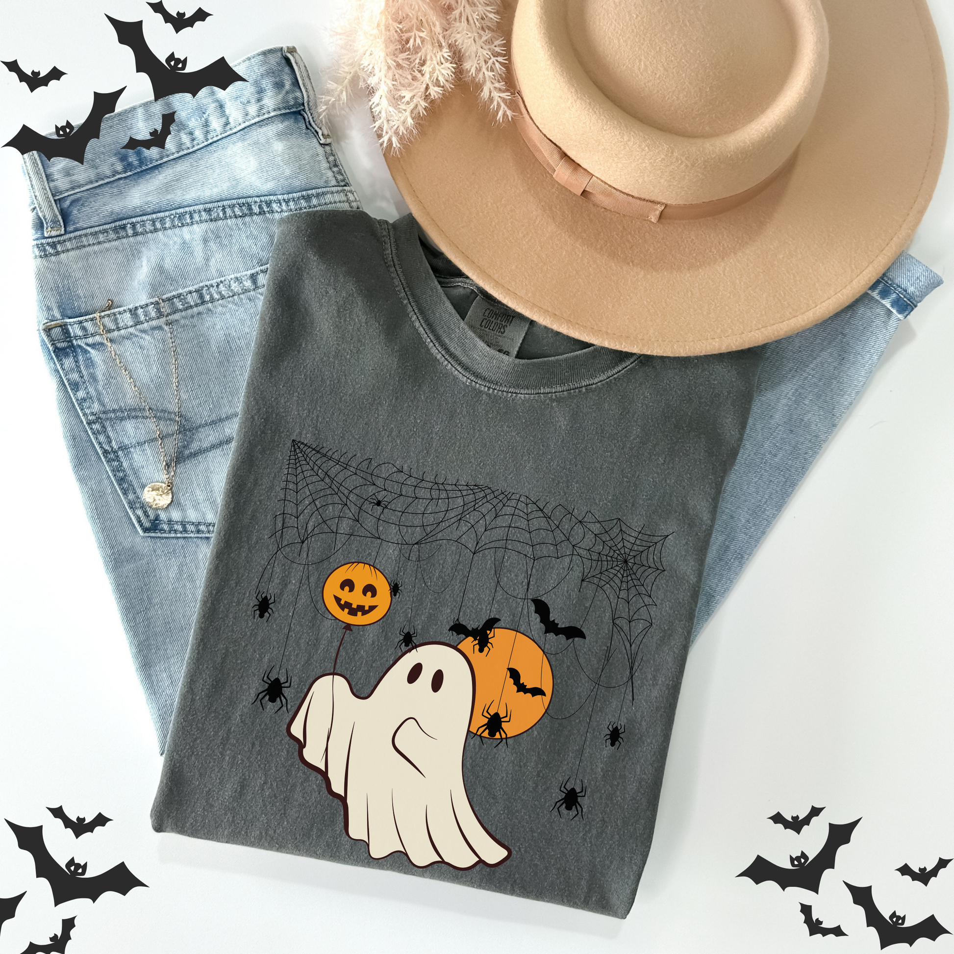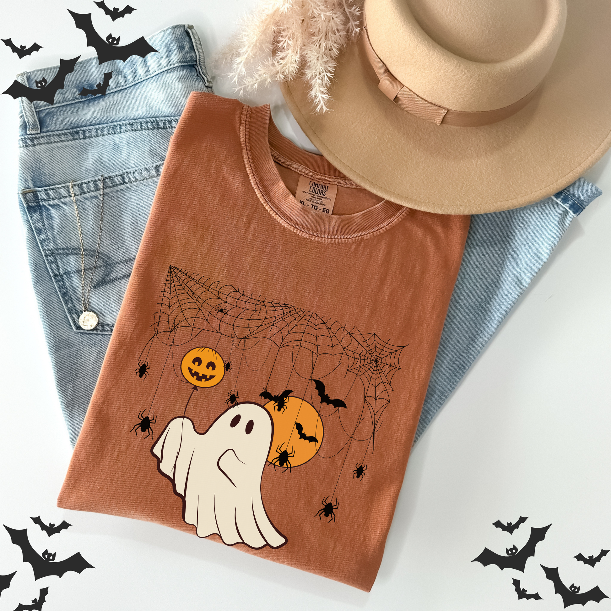 ππ Step back in time with our 'Retro Ghost Halloween' t-shirt, featuring a classic ghost design, a hanging spider illustration, and spiderweb silhouette.