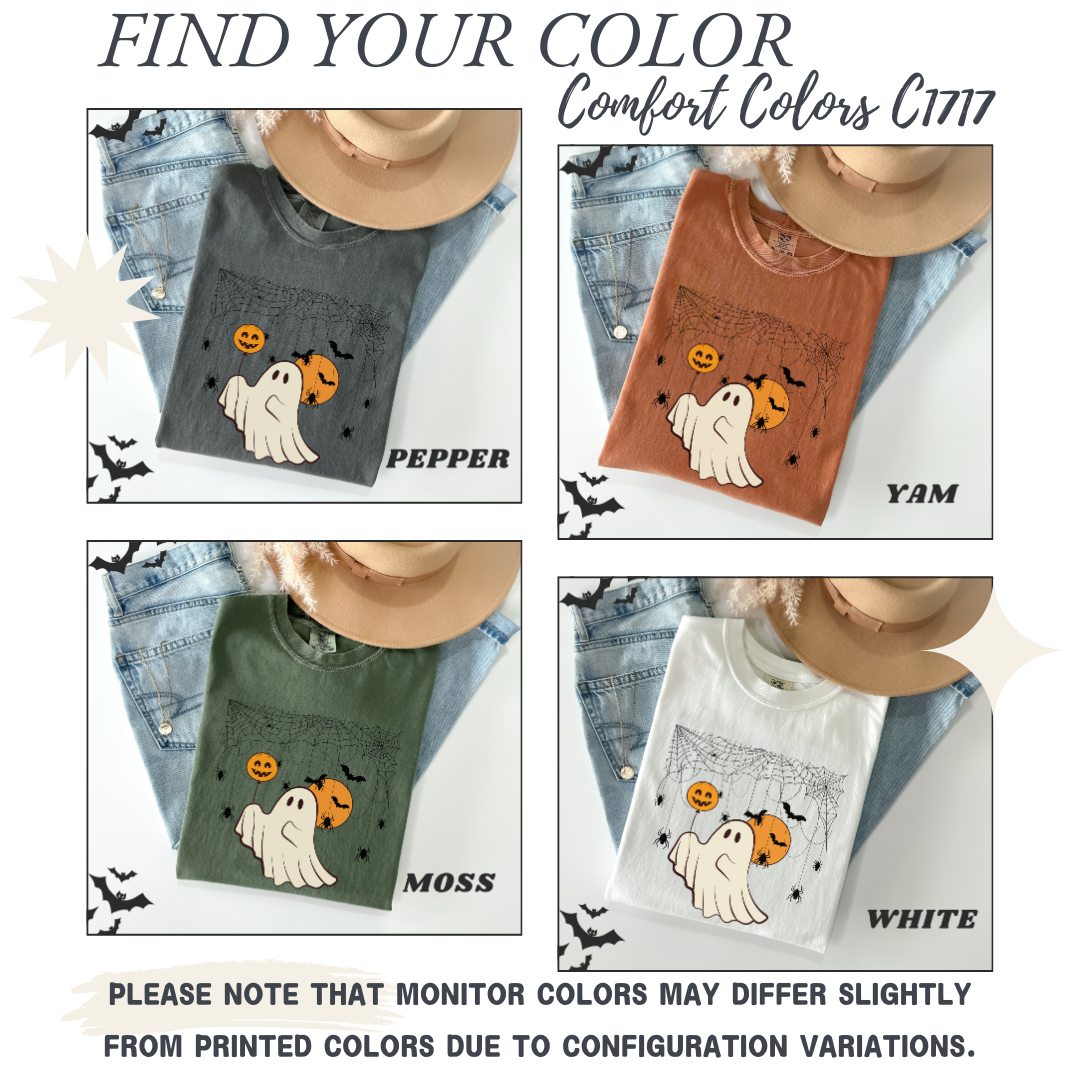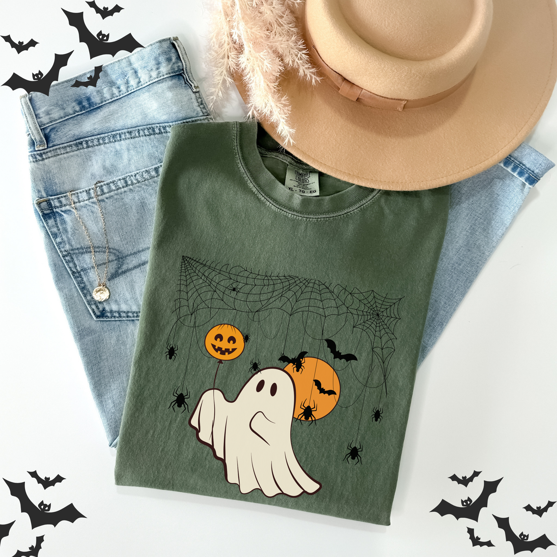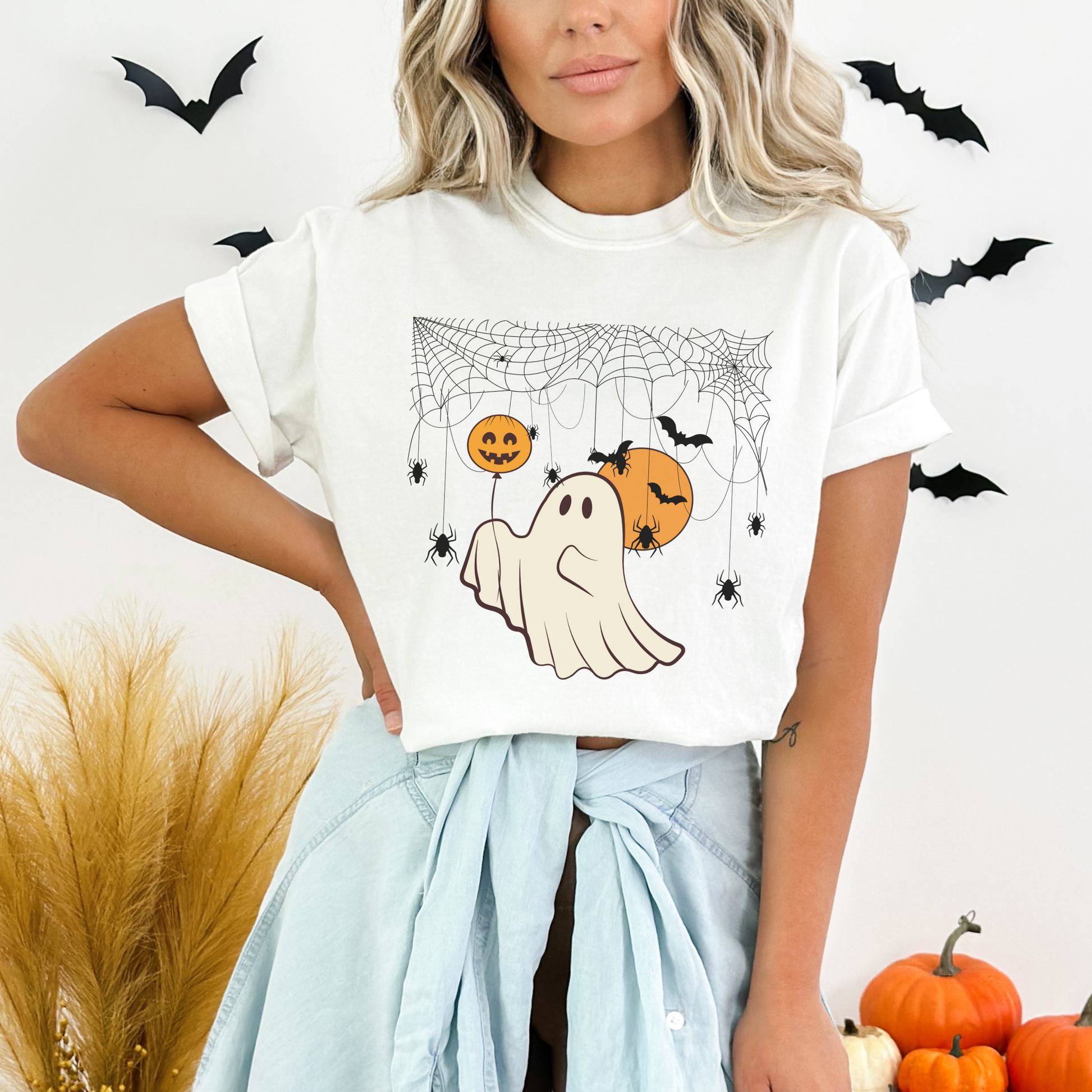 ππ Step back in time with our 'Retro Ghost Halloween' t-shirt, featuring a classic ghost design, a hanging spider illustration, and spiderweb silhouette.