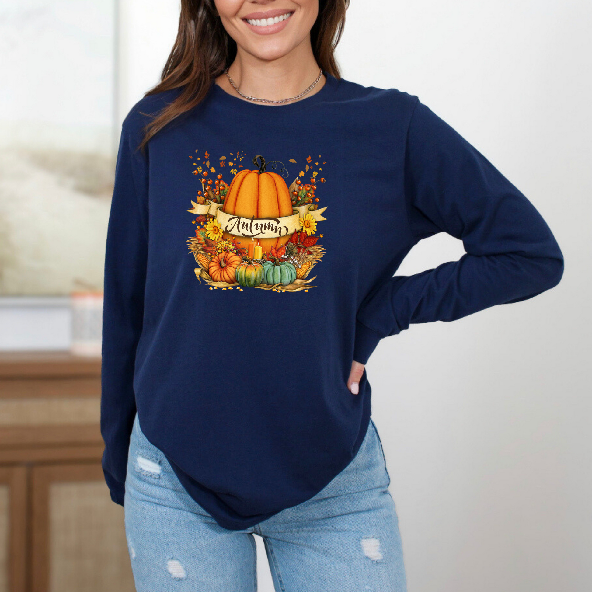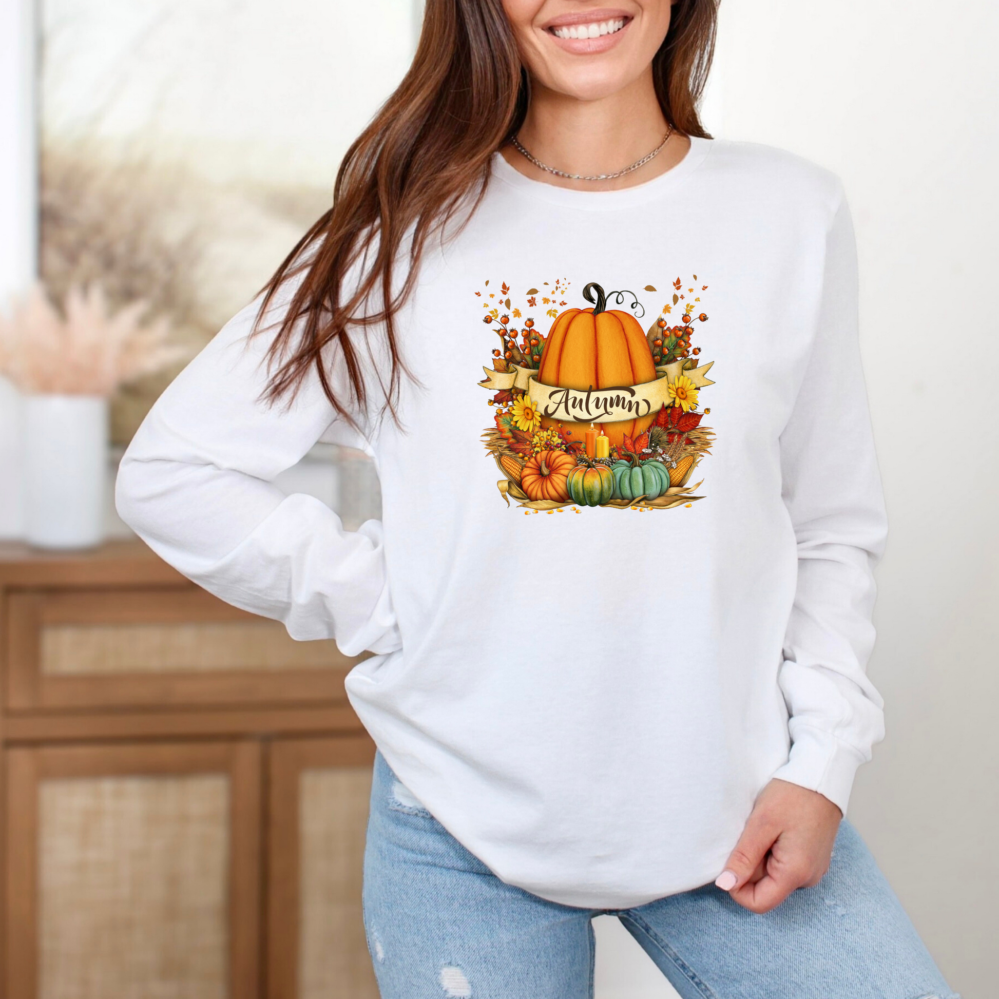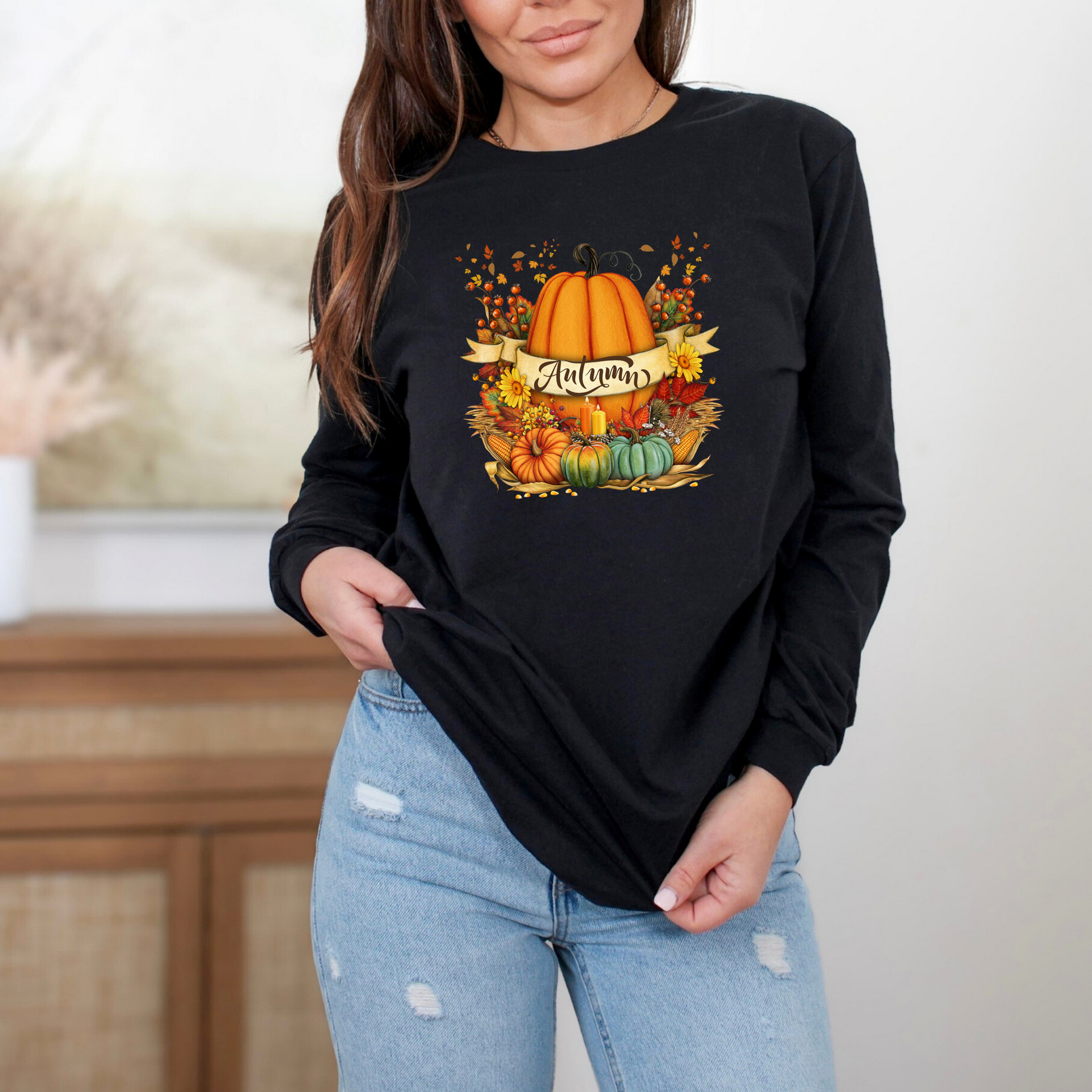 👚🎃 Get into the spirit of the season with our Autumn Pumpkin Long Sleeve Shirt!