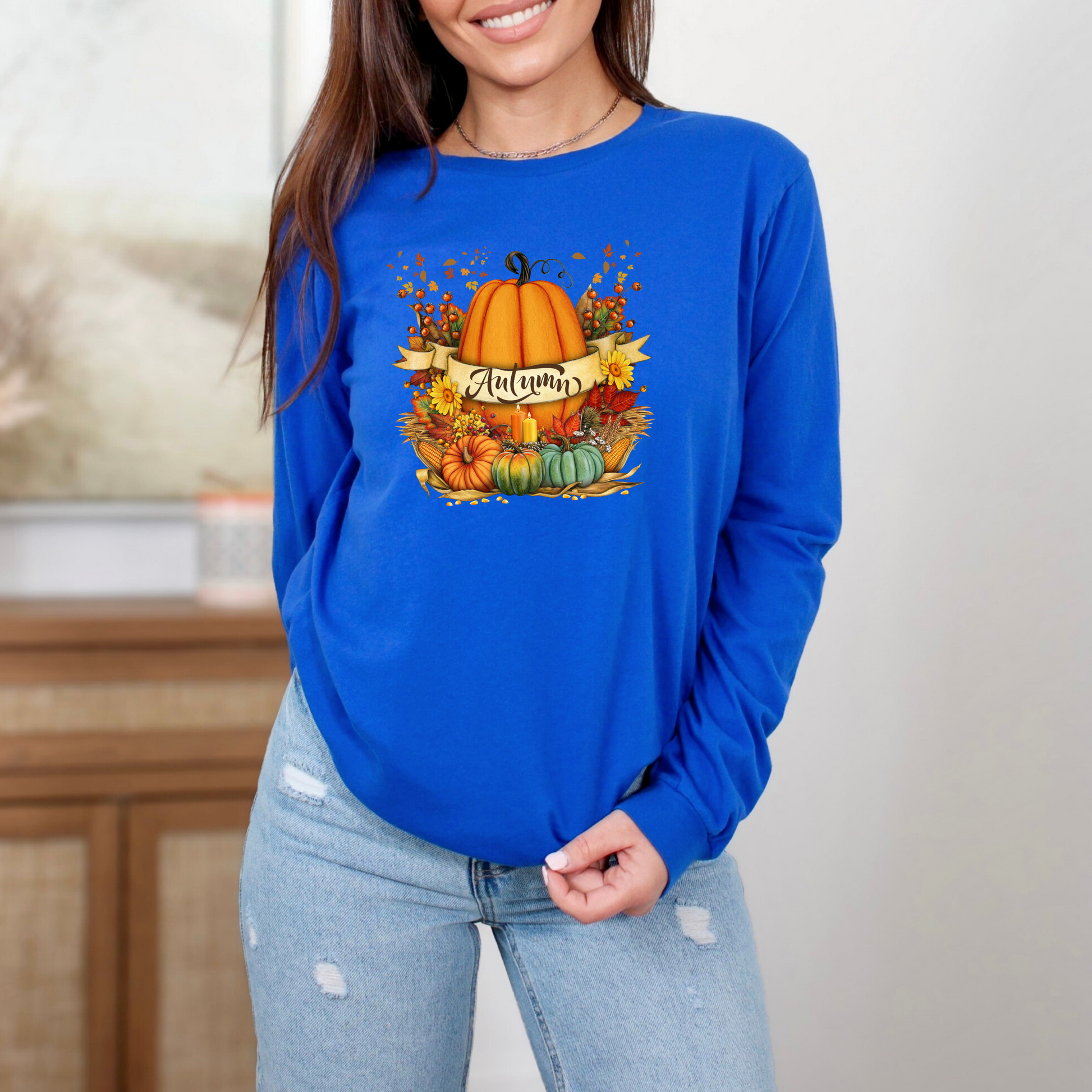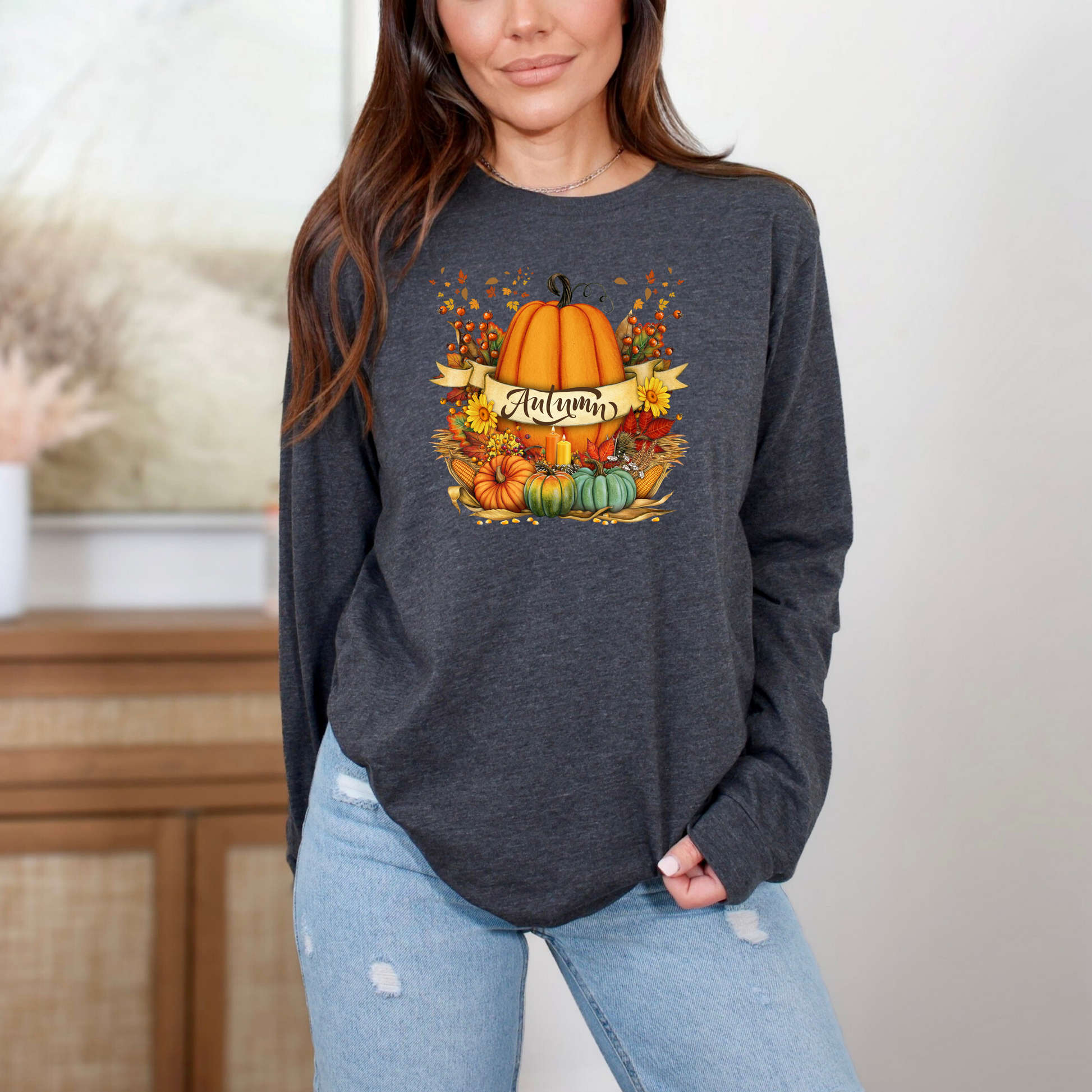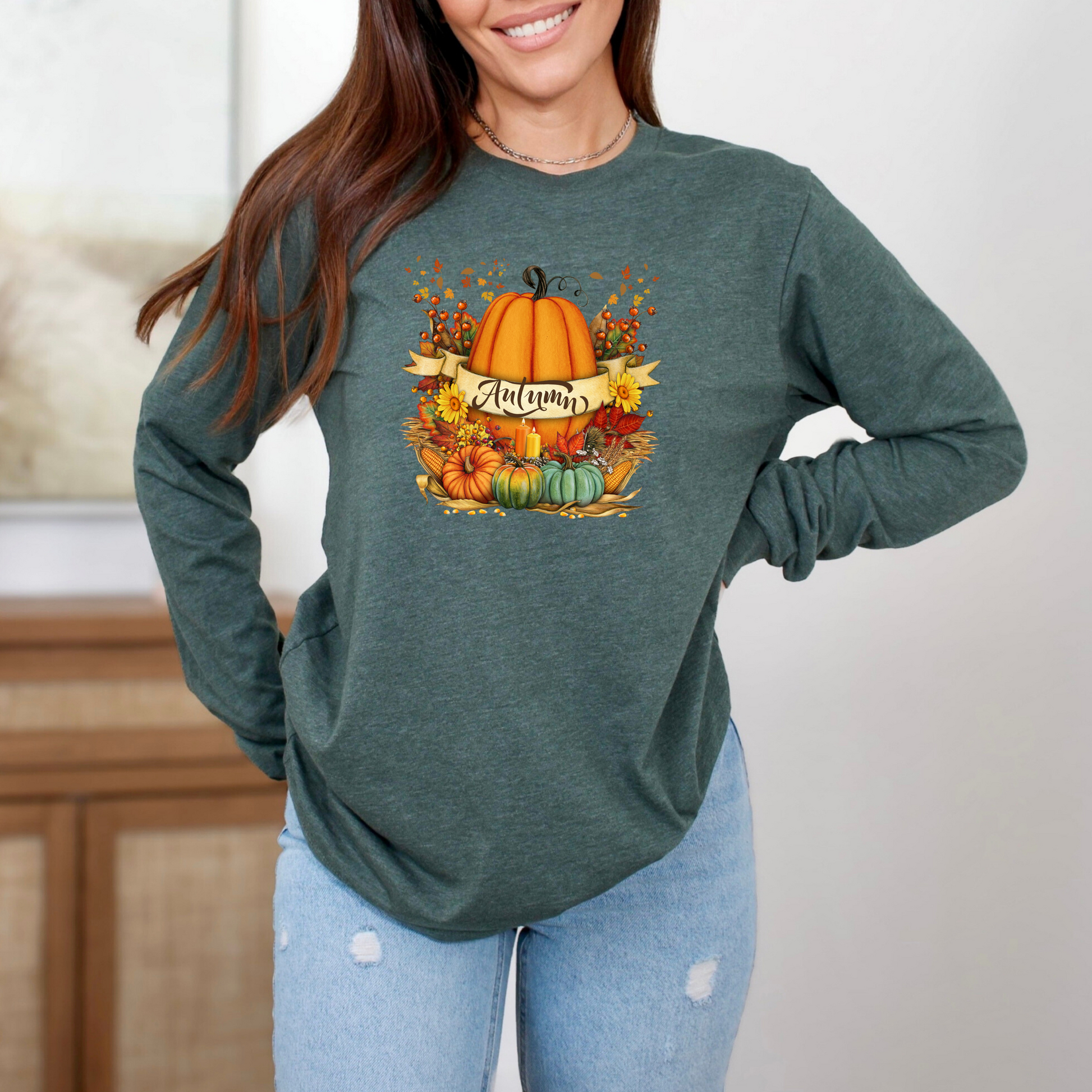 👚🎃 Get into the spirit of the season with our Autumn Pumpkin Long Sleeve Shirt!