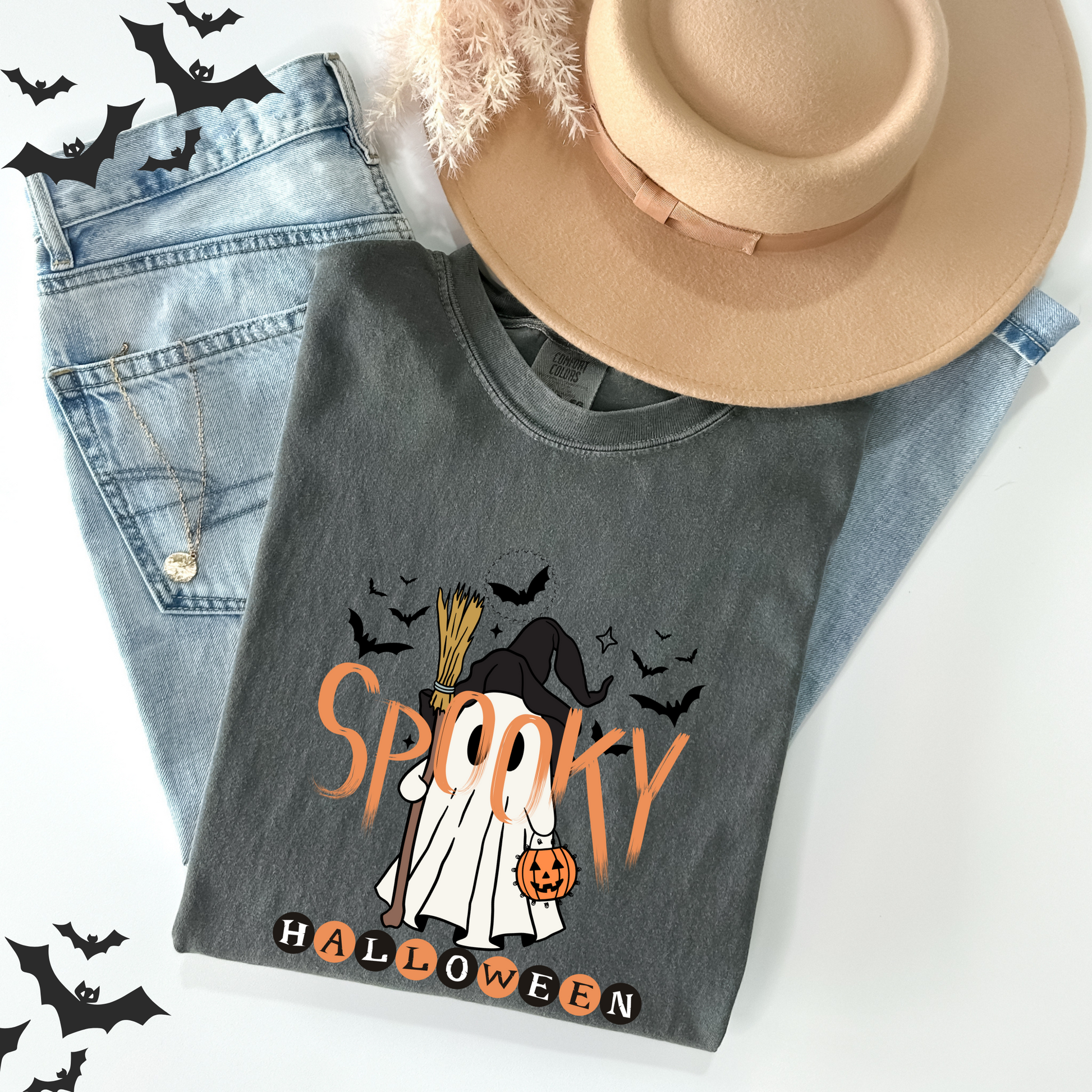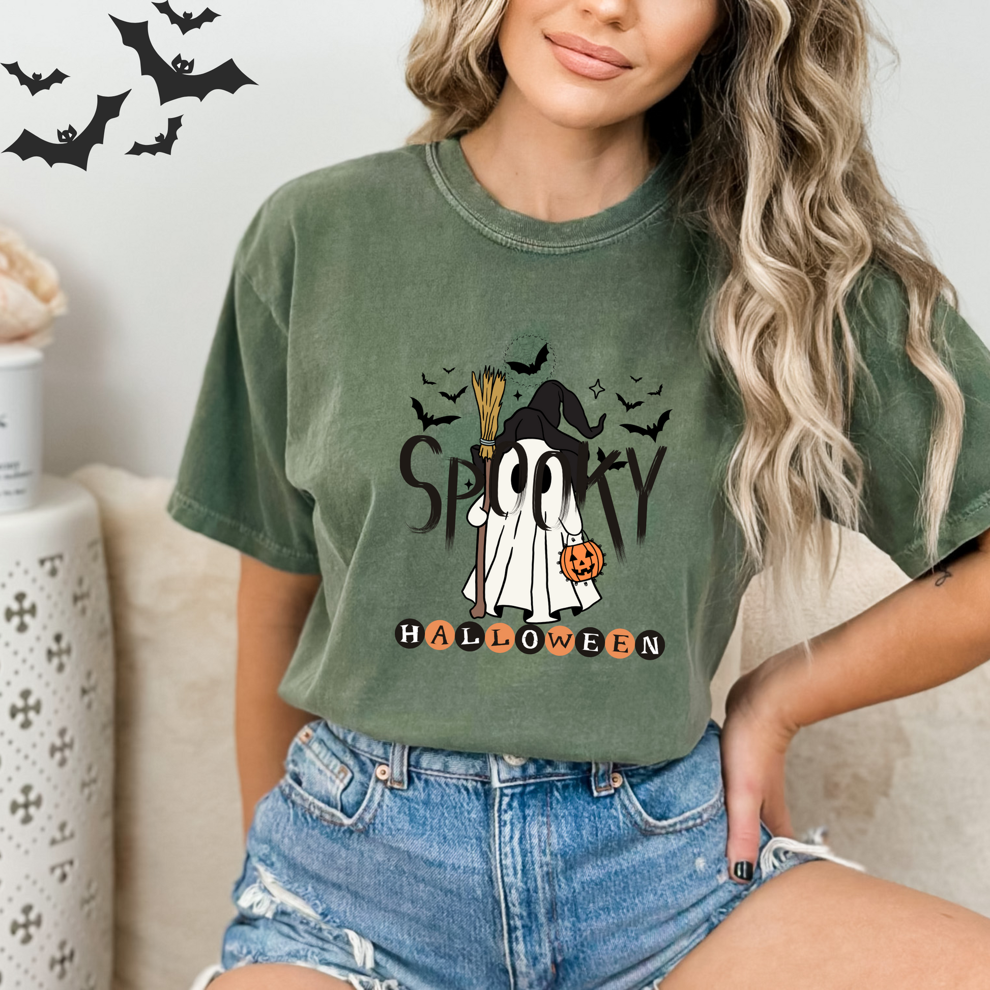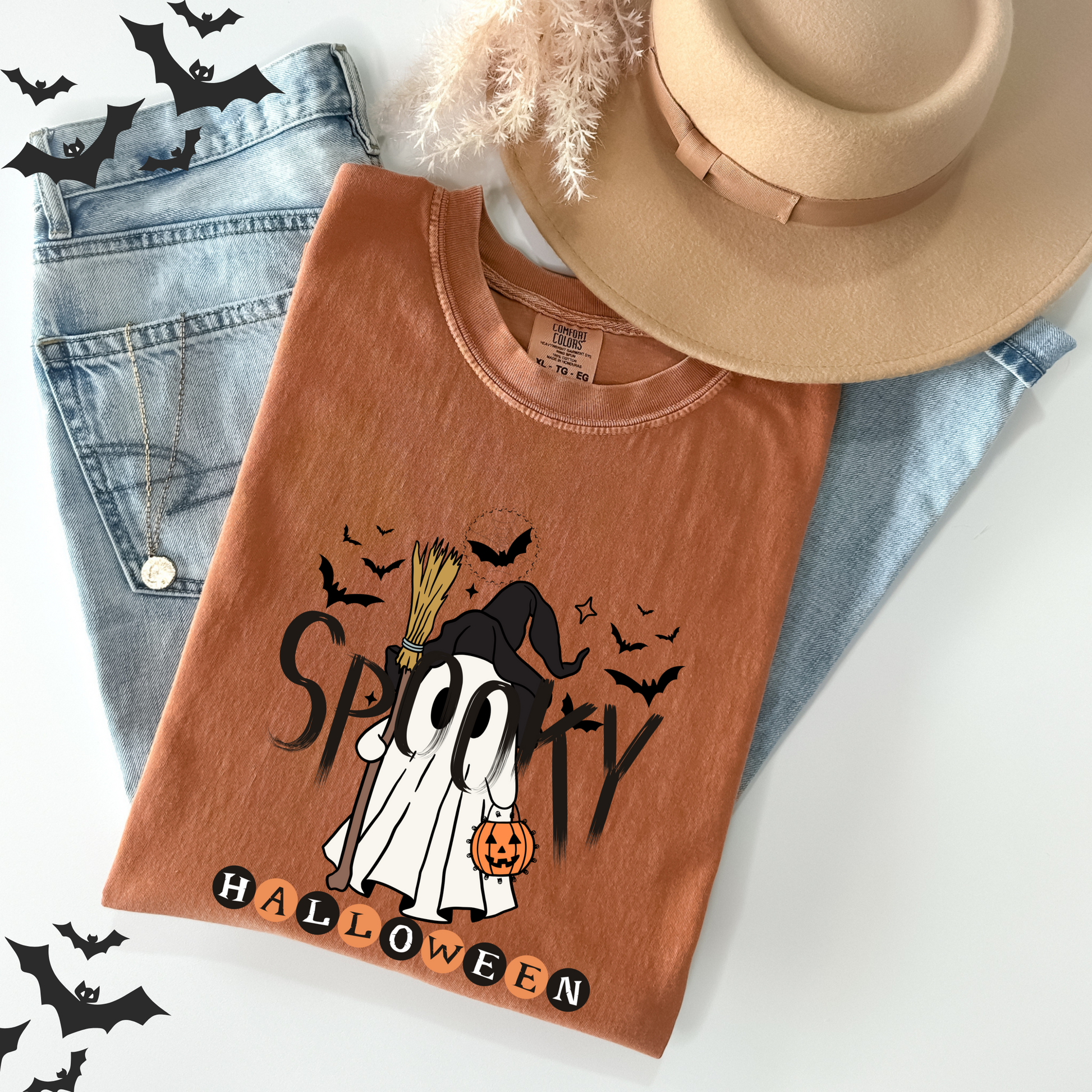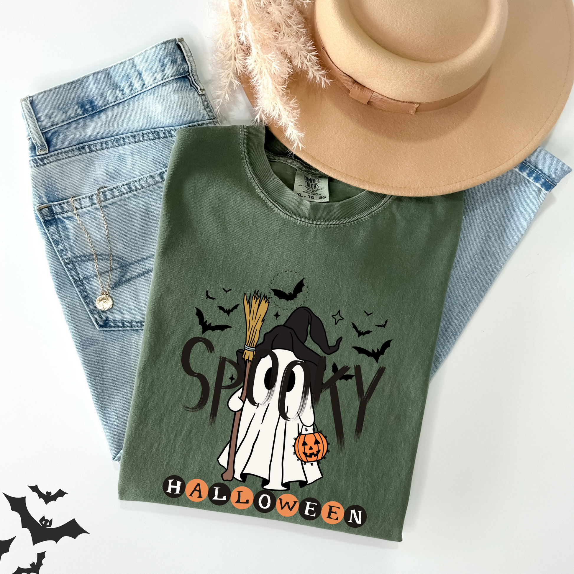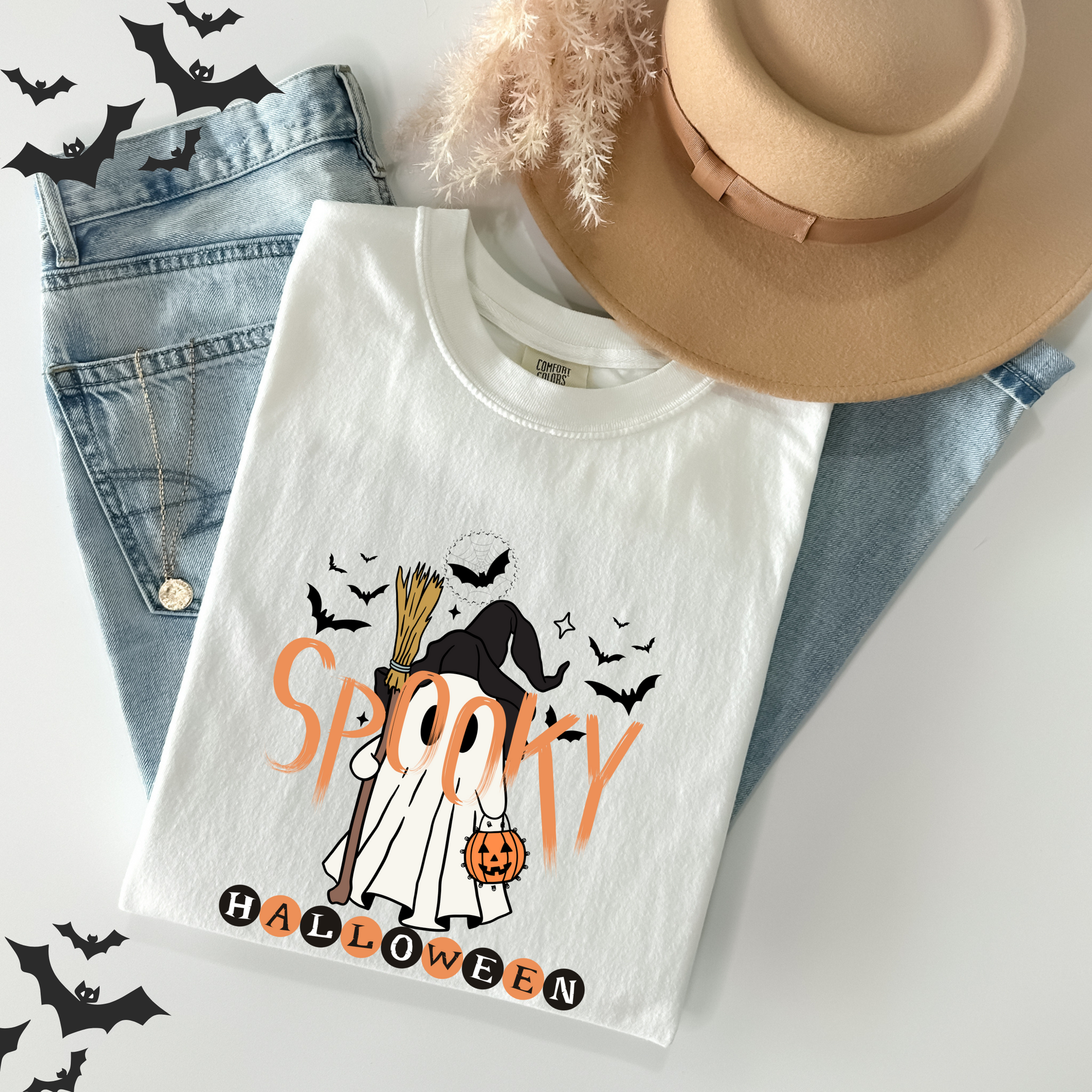 ππ Embrace the Halloween magic with our 'Cute Ghost Witch' t-shirt, featuring an adorable ghost witch, spooky bats silhouette, and a spooky bat circle illustration.