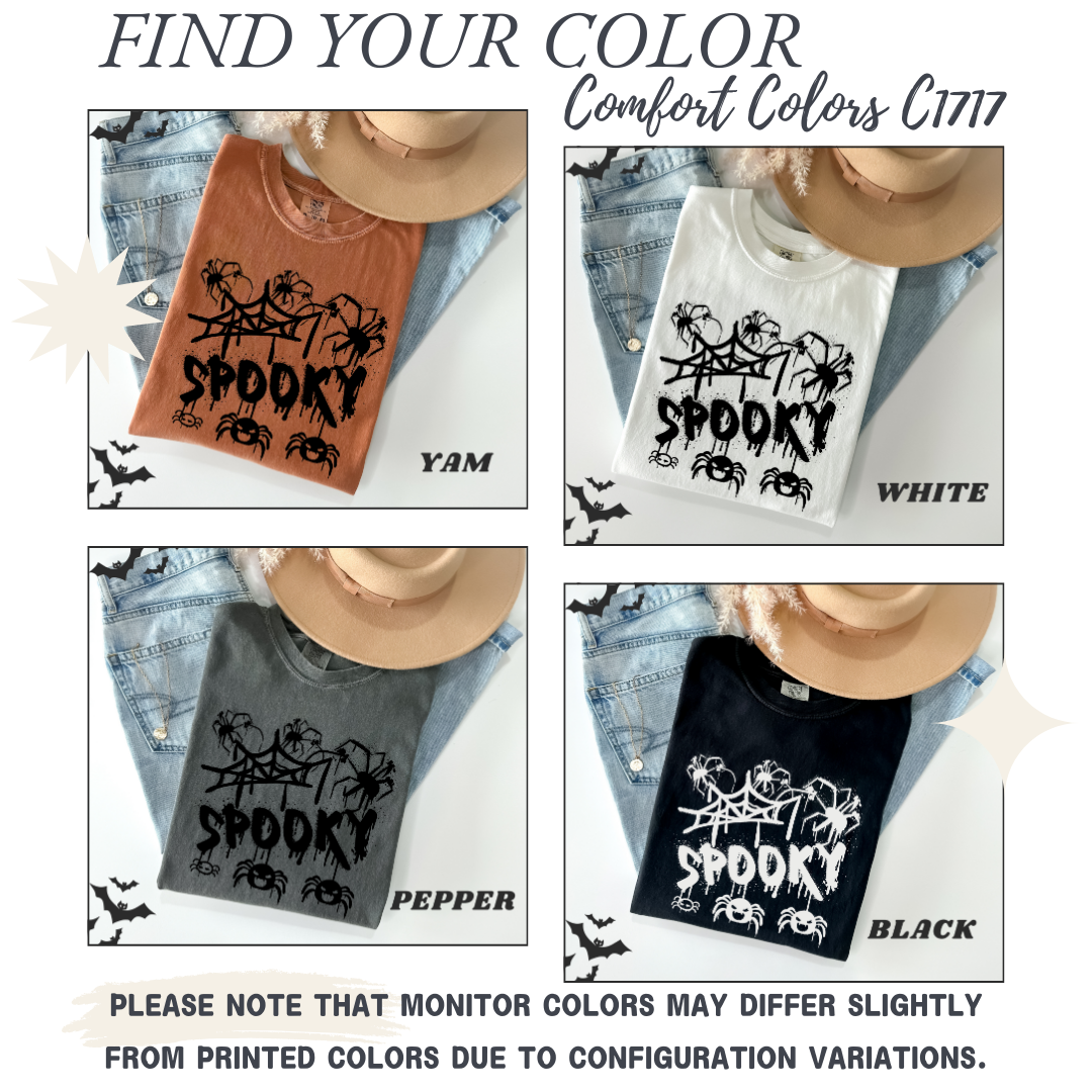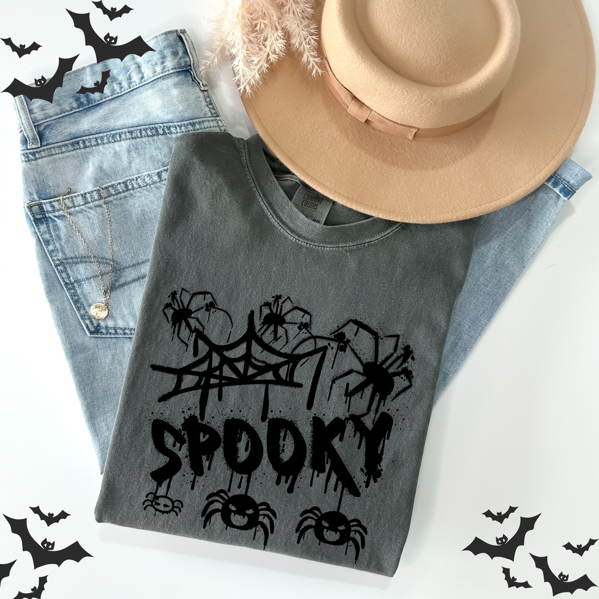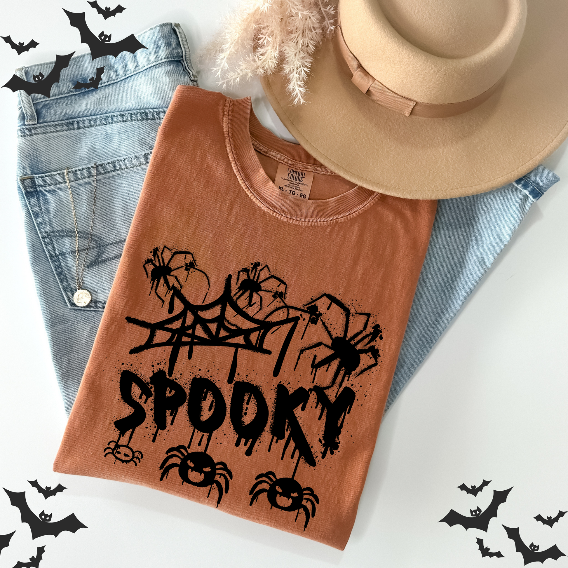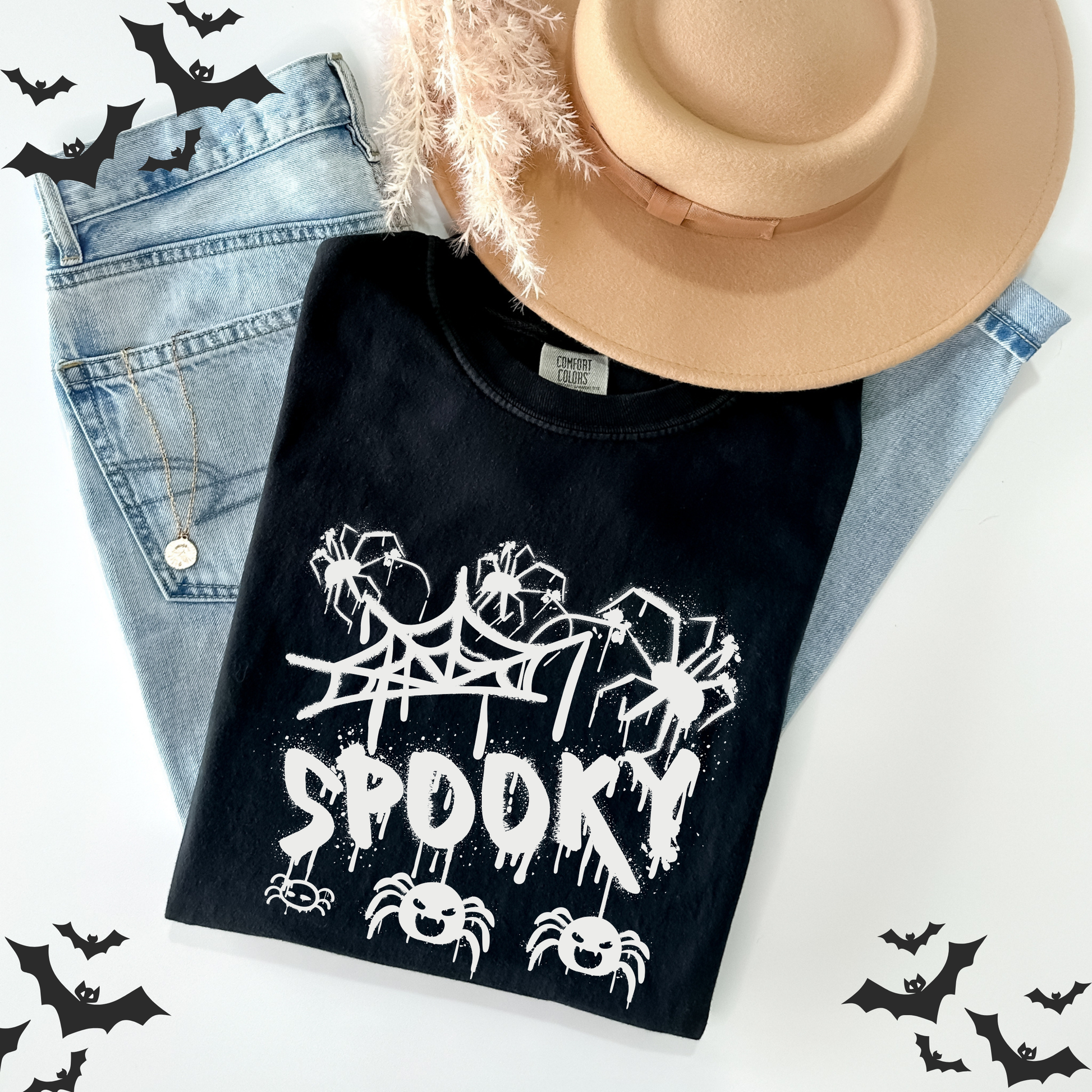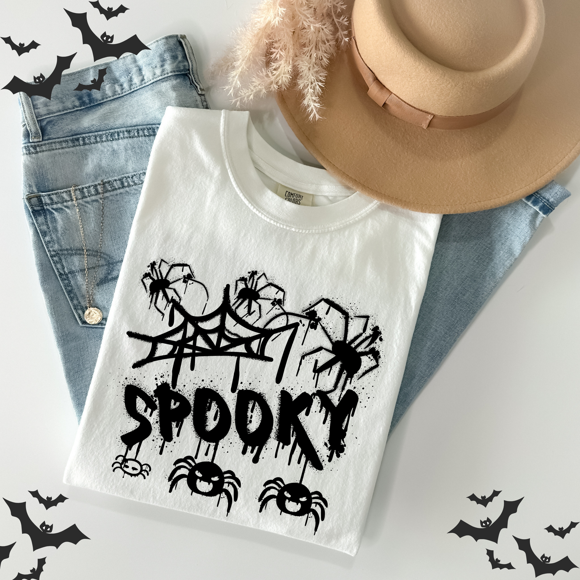 🕷️🕸️ Get into the Halloween spirit with our 'Spooky Spray Paint' t-shirt, featuring eerie spray-painted text, spooky spiders, and a Halloween spider web design.