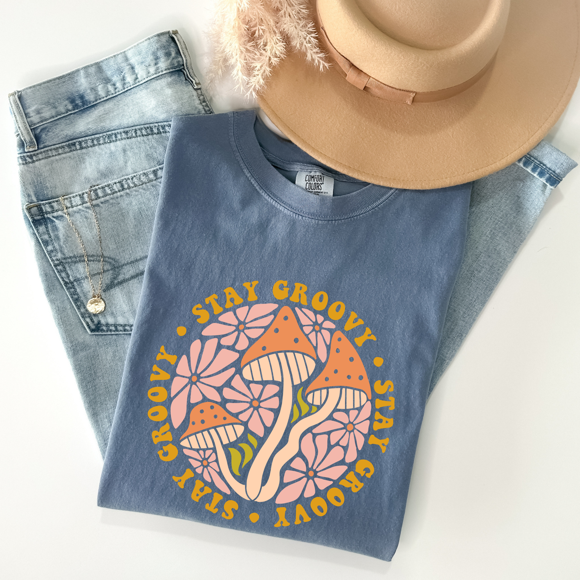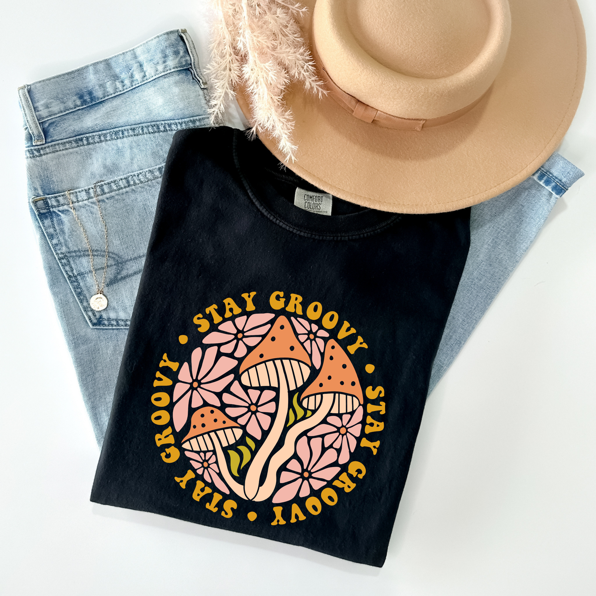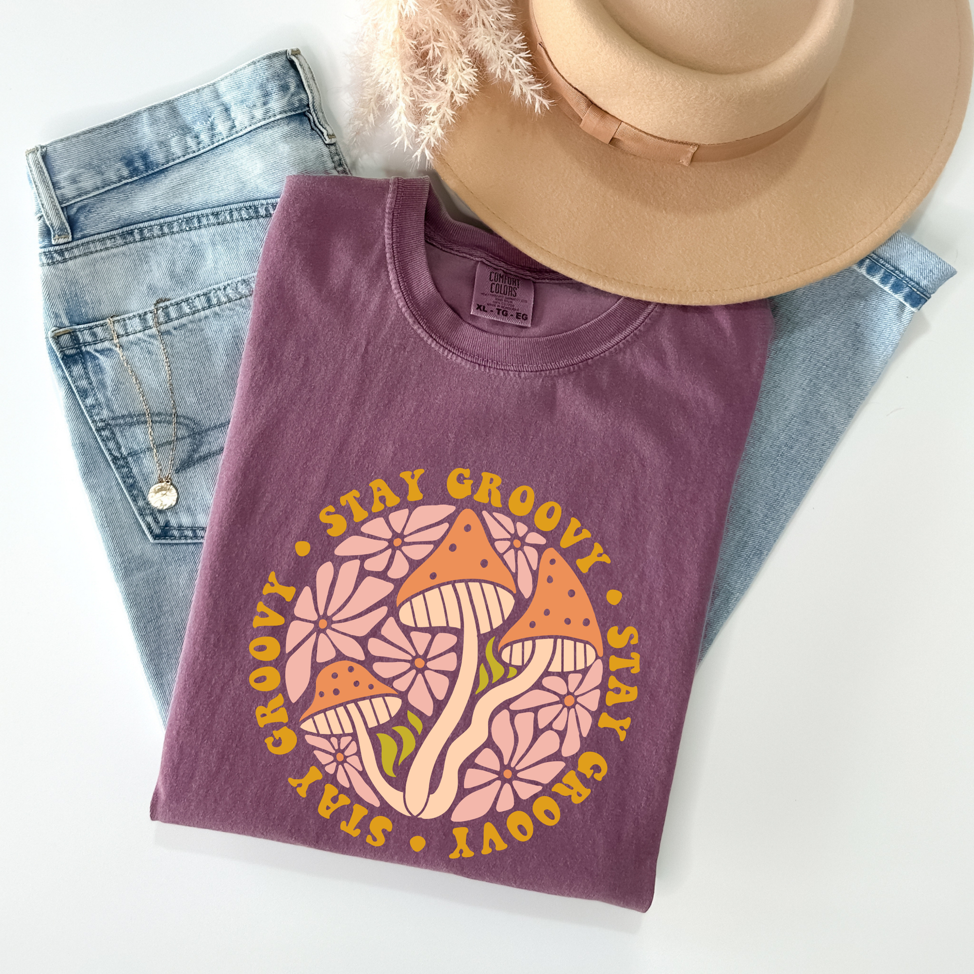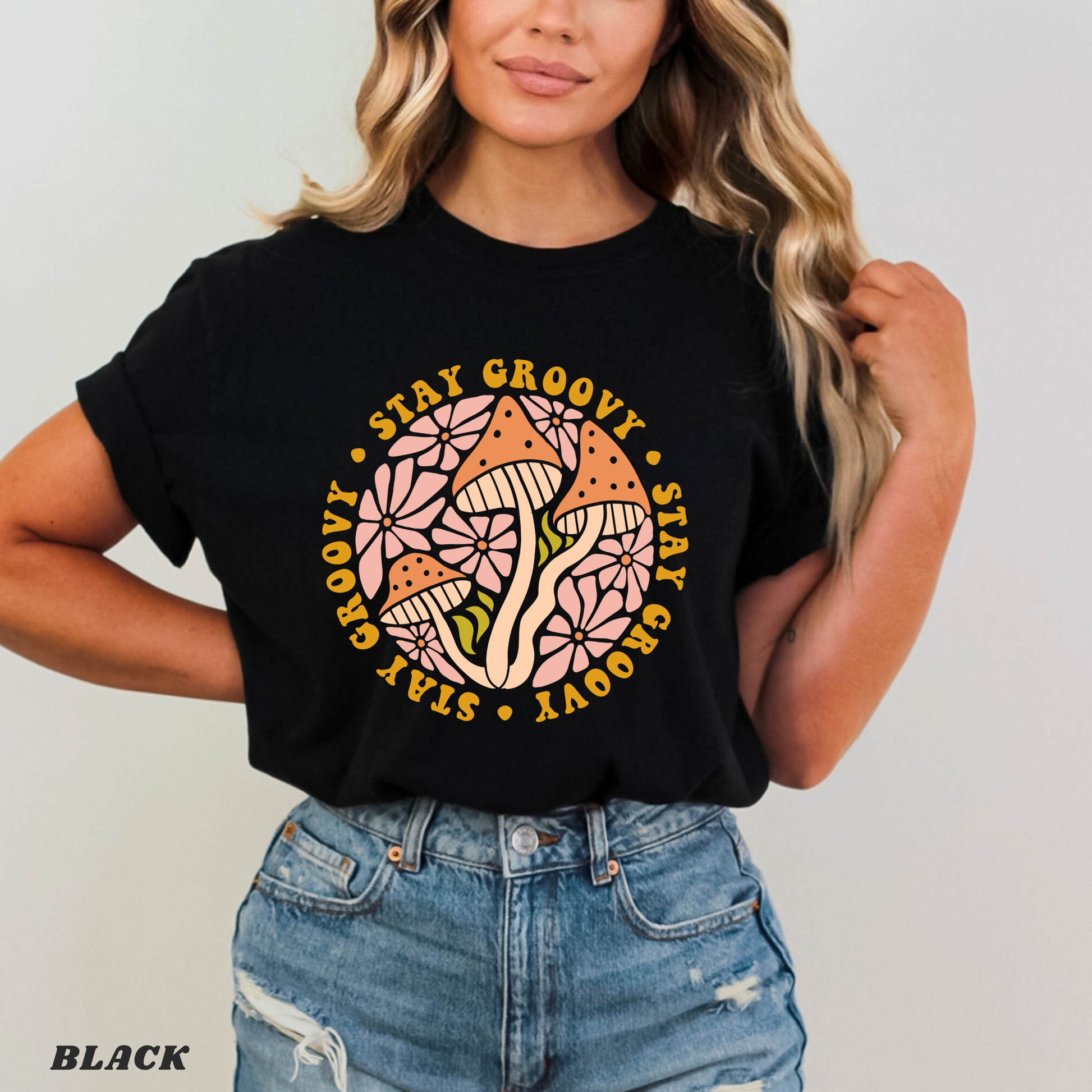 πΌπ Add a touch of retro flair to your wardrobe with our 'Stay Groovy' t-shirt, featuring a vibrant psychedelic round print with mushrooms and flowers.