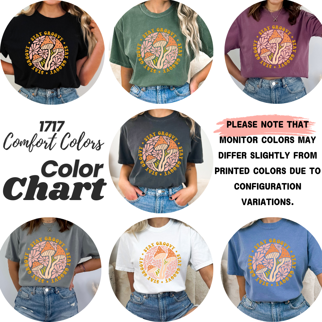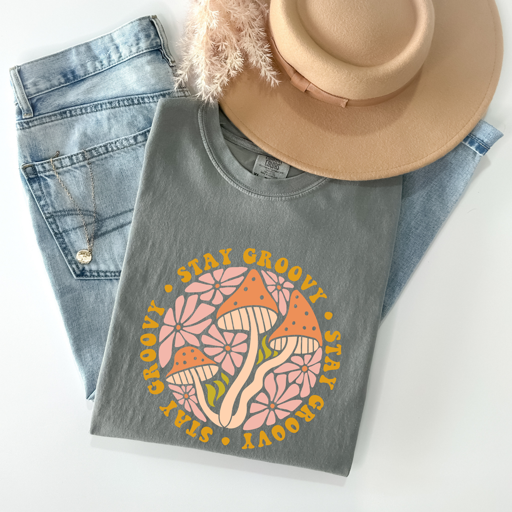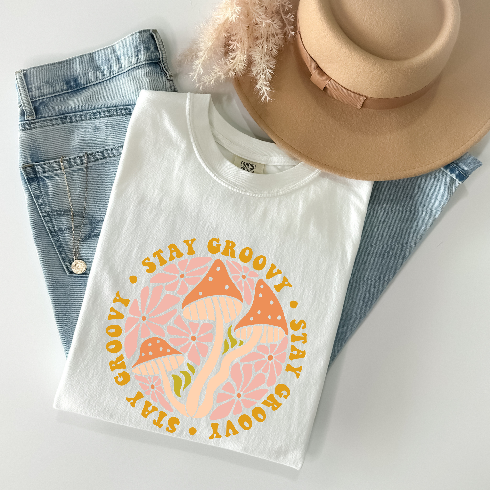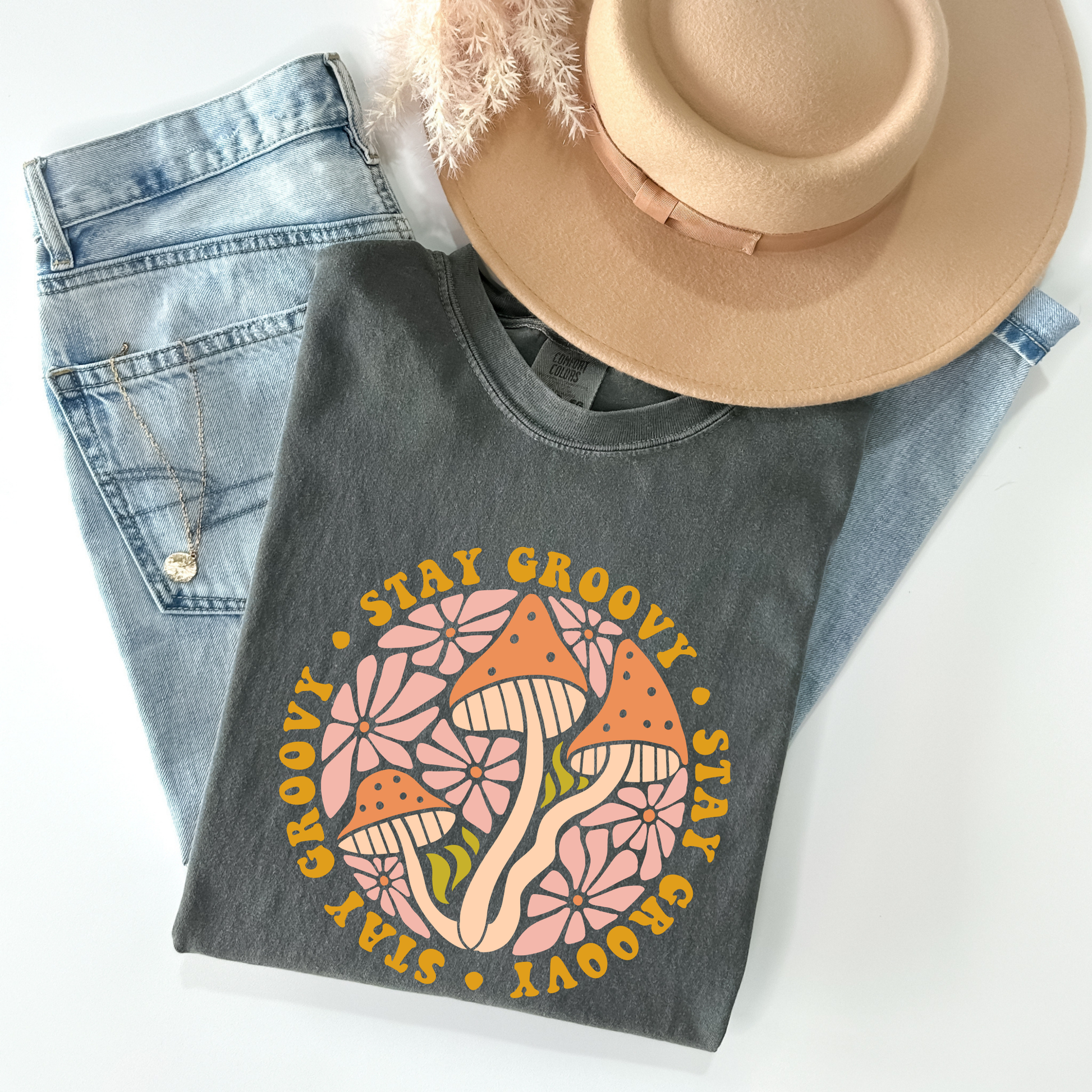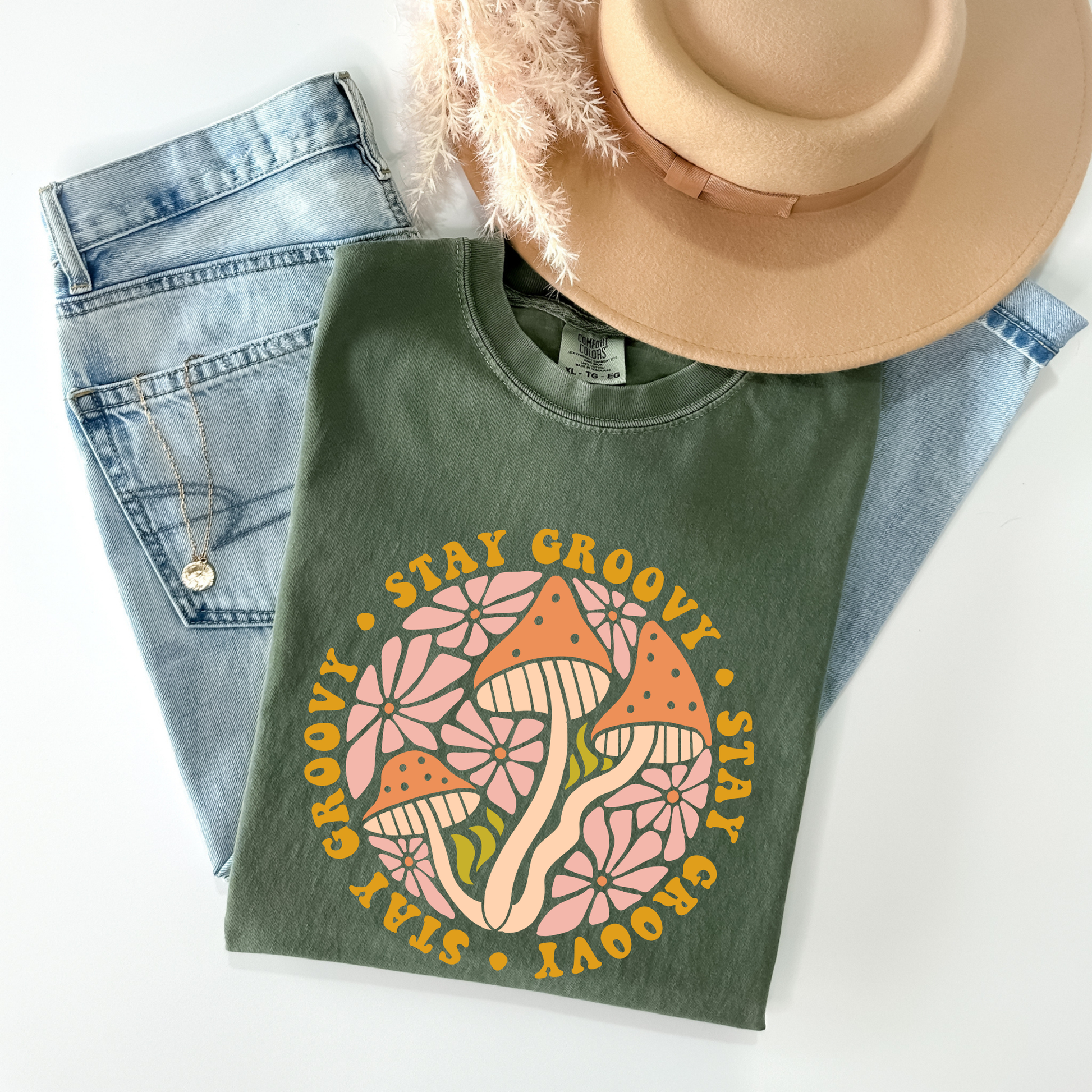 πΌπ Add a touch of retro flair to your wardrobe with our 'Stay Groovy' t-shirt, featuring a vibrant psychedelic round print with mushrooms and flowers.