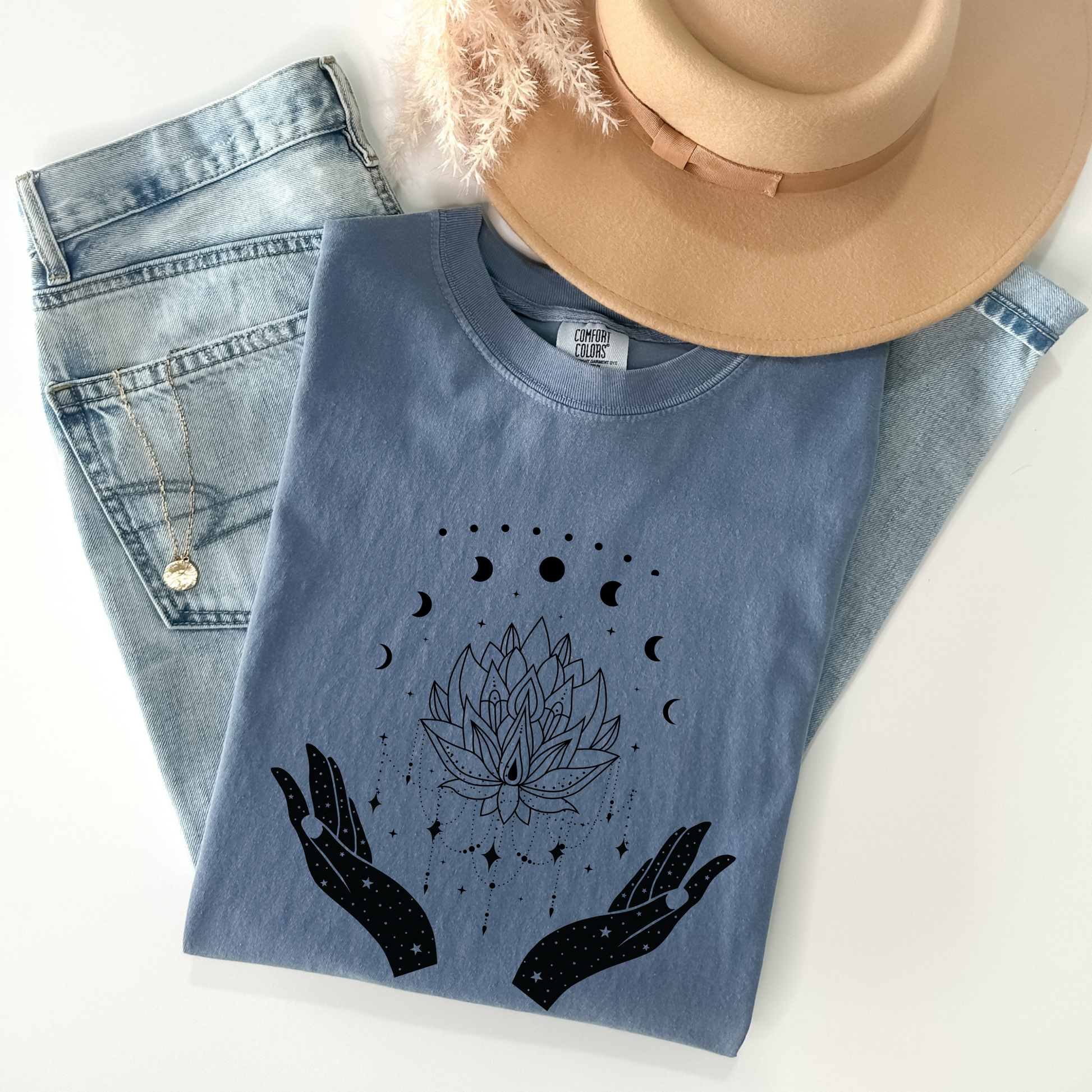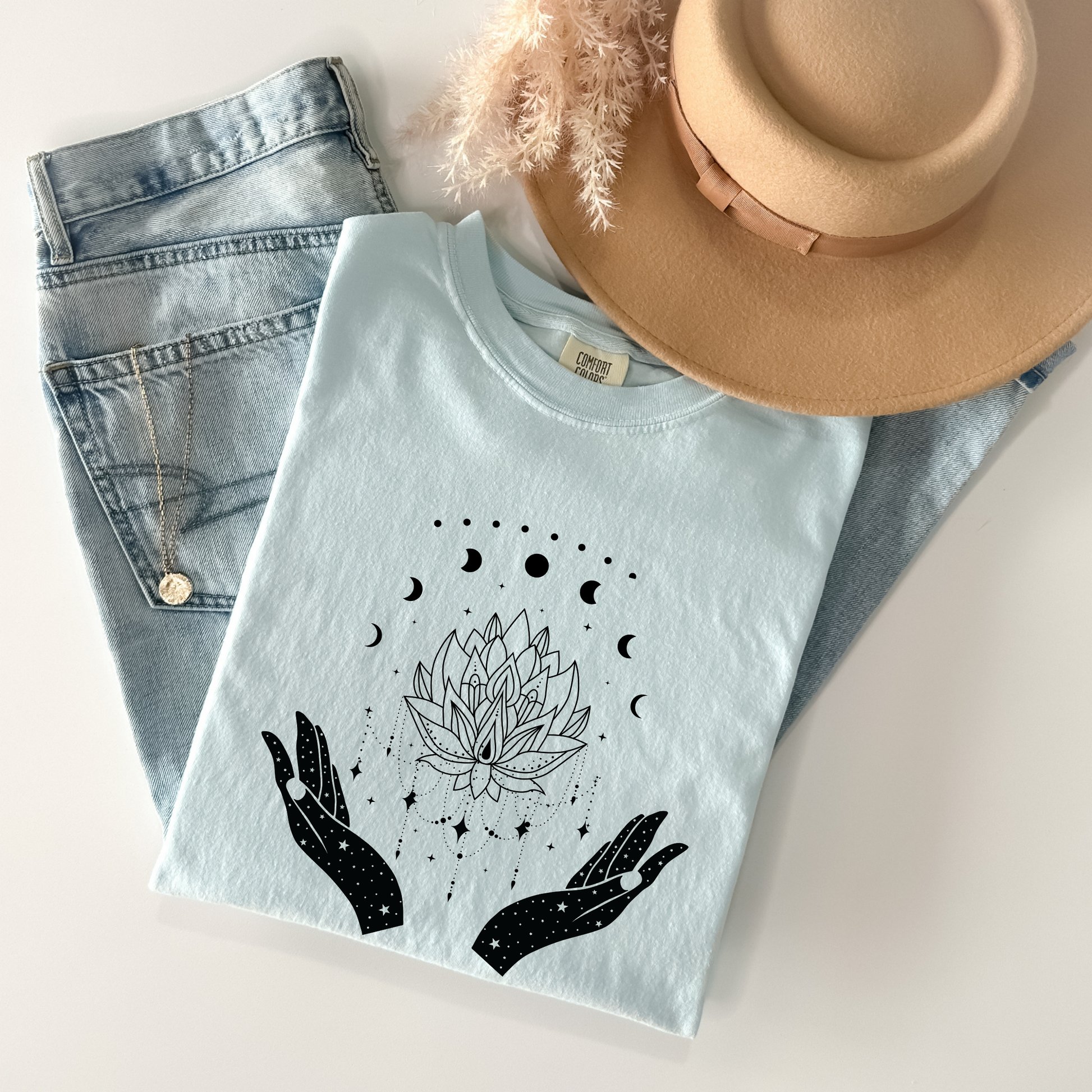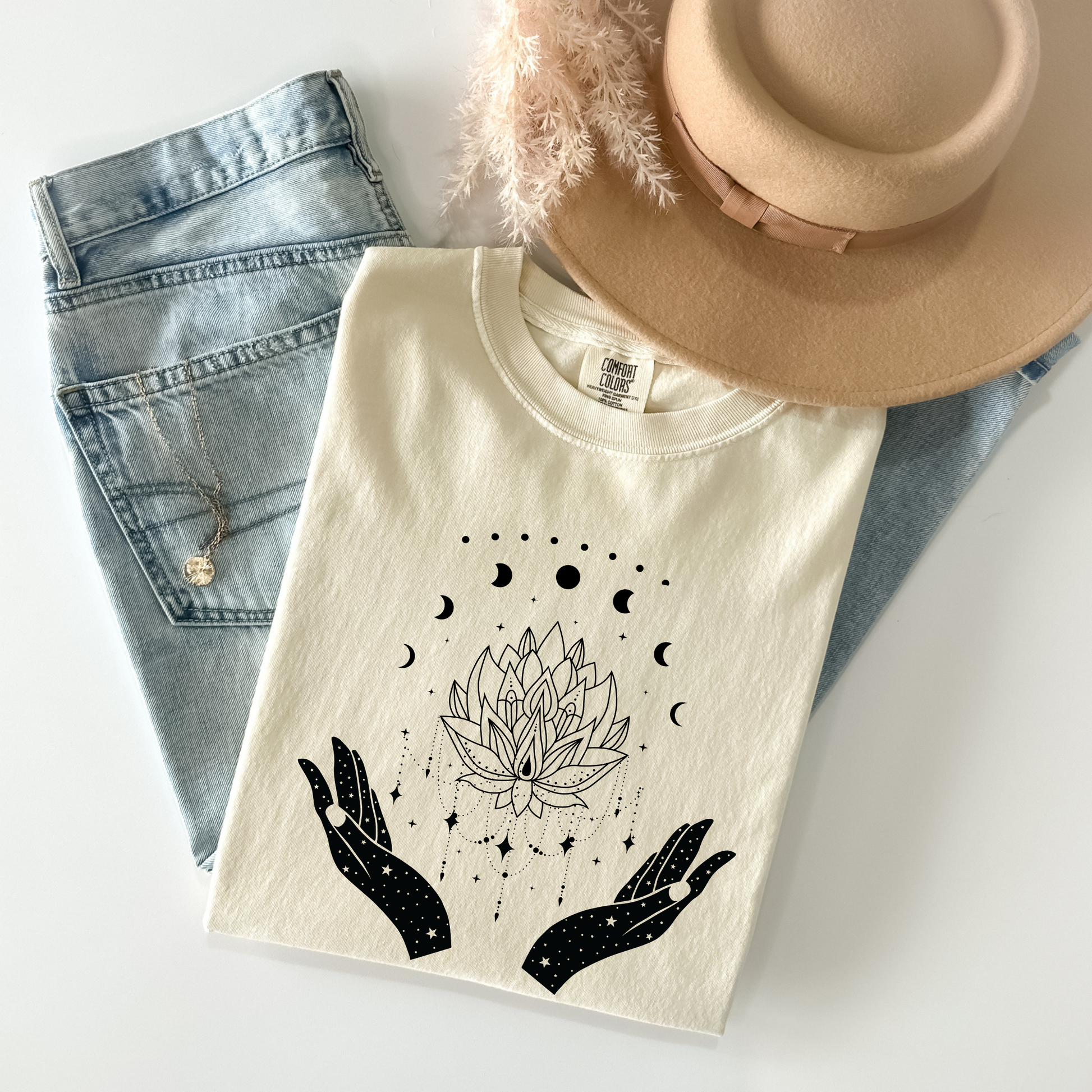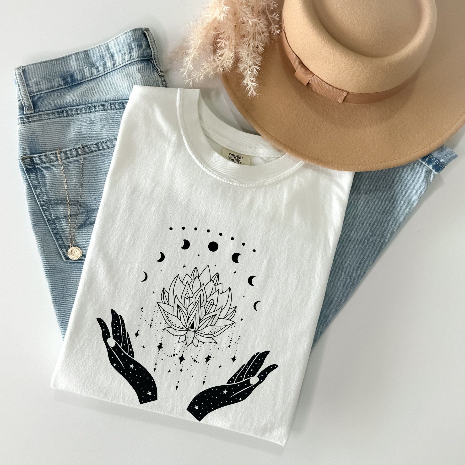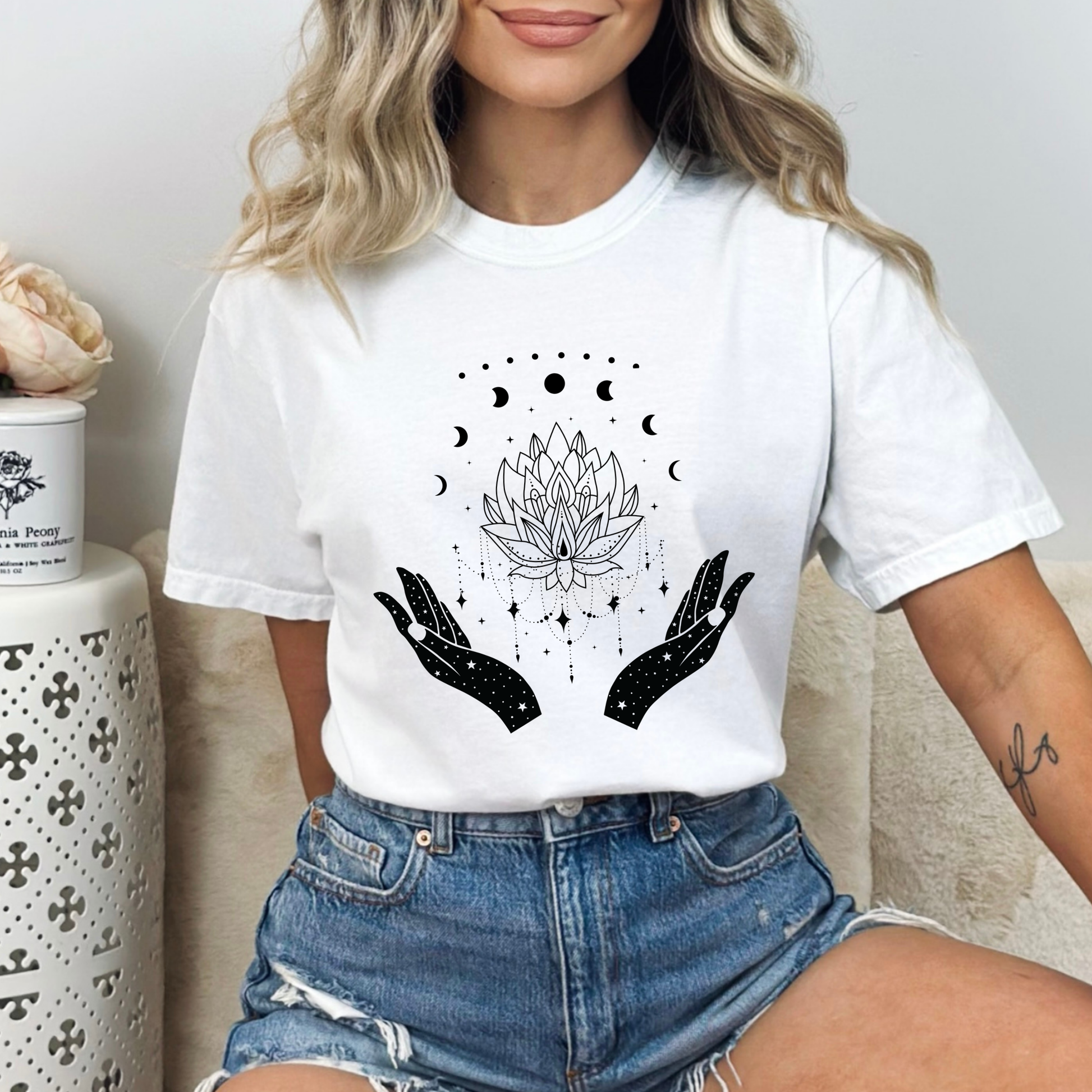 ππ This enchanting design features hands gracefully holding the moon cycle, surrounded by celestial stars, a lotus flower, and moon phases. Perfect for astrology enthusiasts, moon lovers, and those who appreciate celestial-inspired fashion.